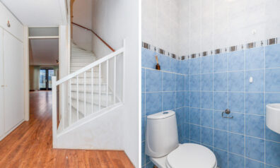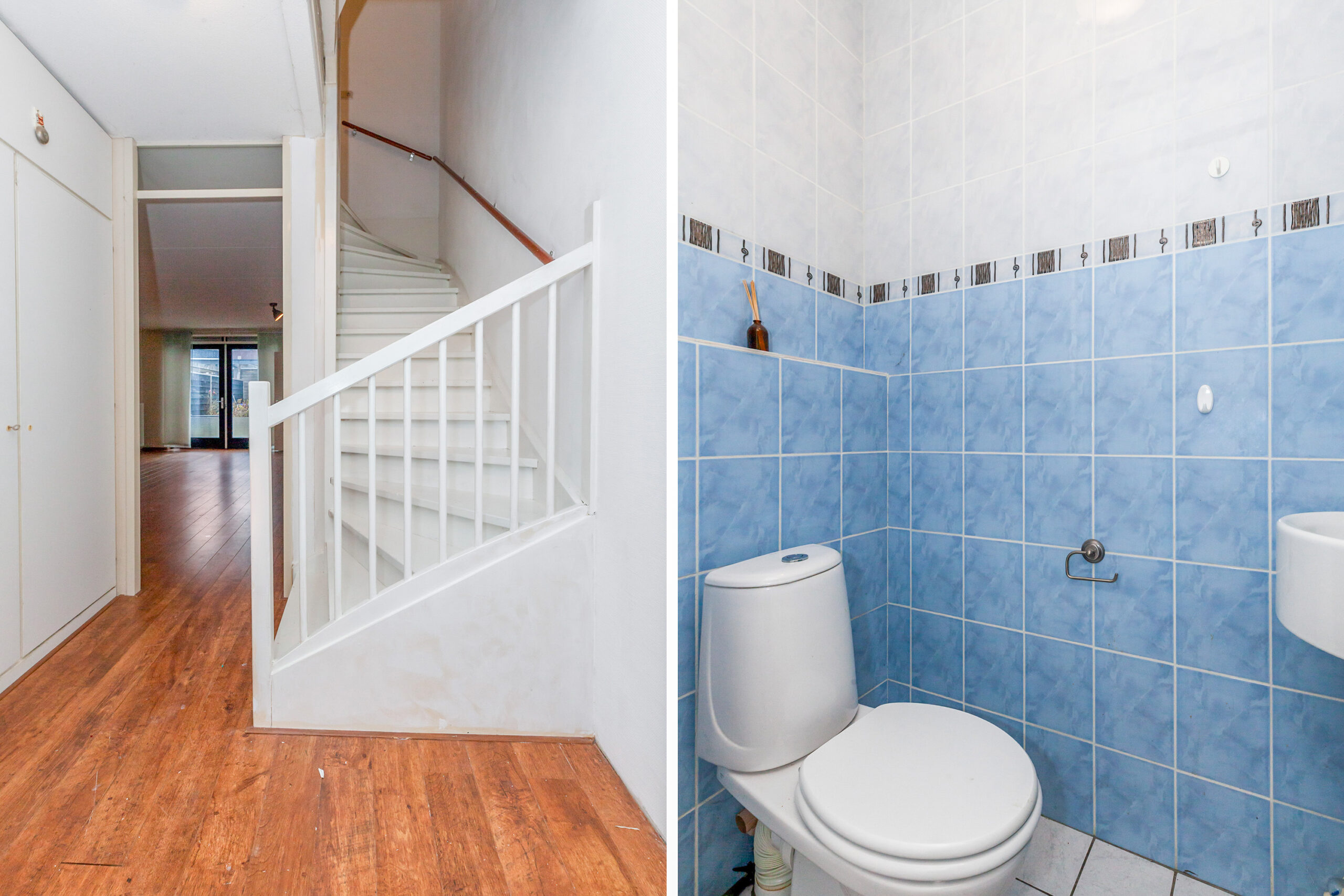 U stapt binnen in een ruim opgezette hal met toiletruimte, meterkast, praktische schoenenkast en de trapopgang naar de eerste verdieping. De hal mondt uit in de woonkamer.