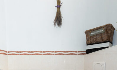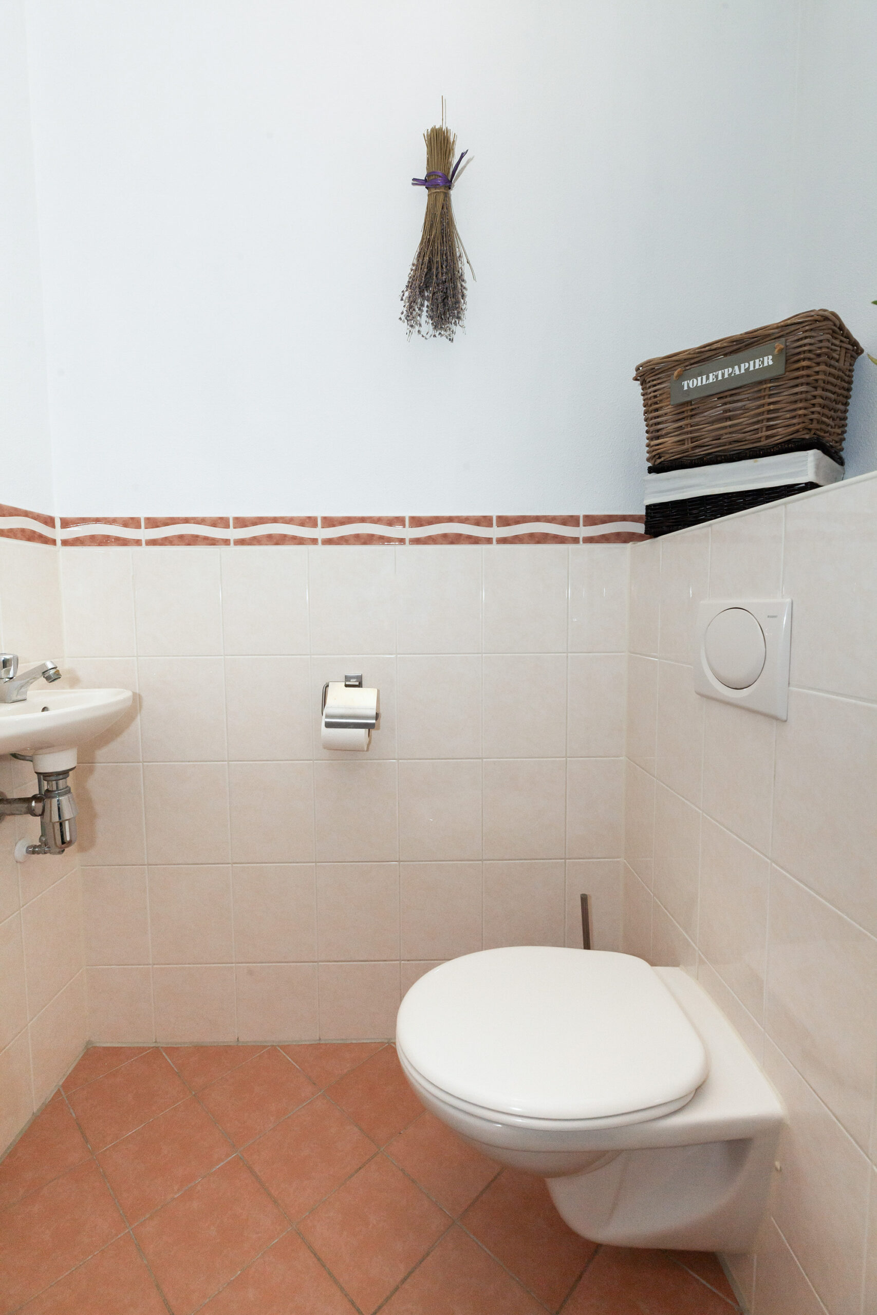 Nette toiletruimte voorzien van een vrijhangend closet en een handwasfonteintje.