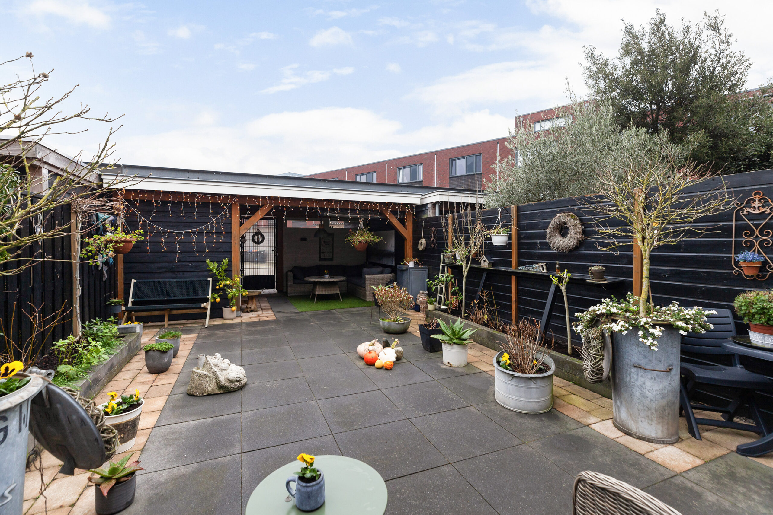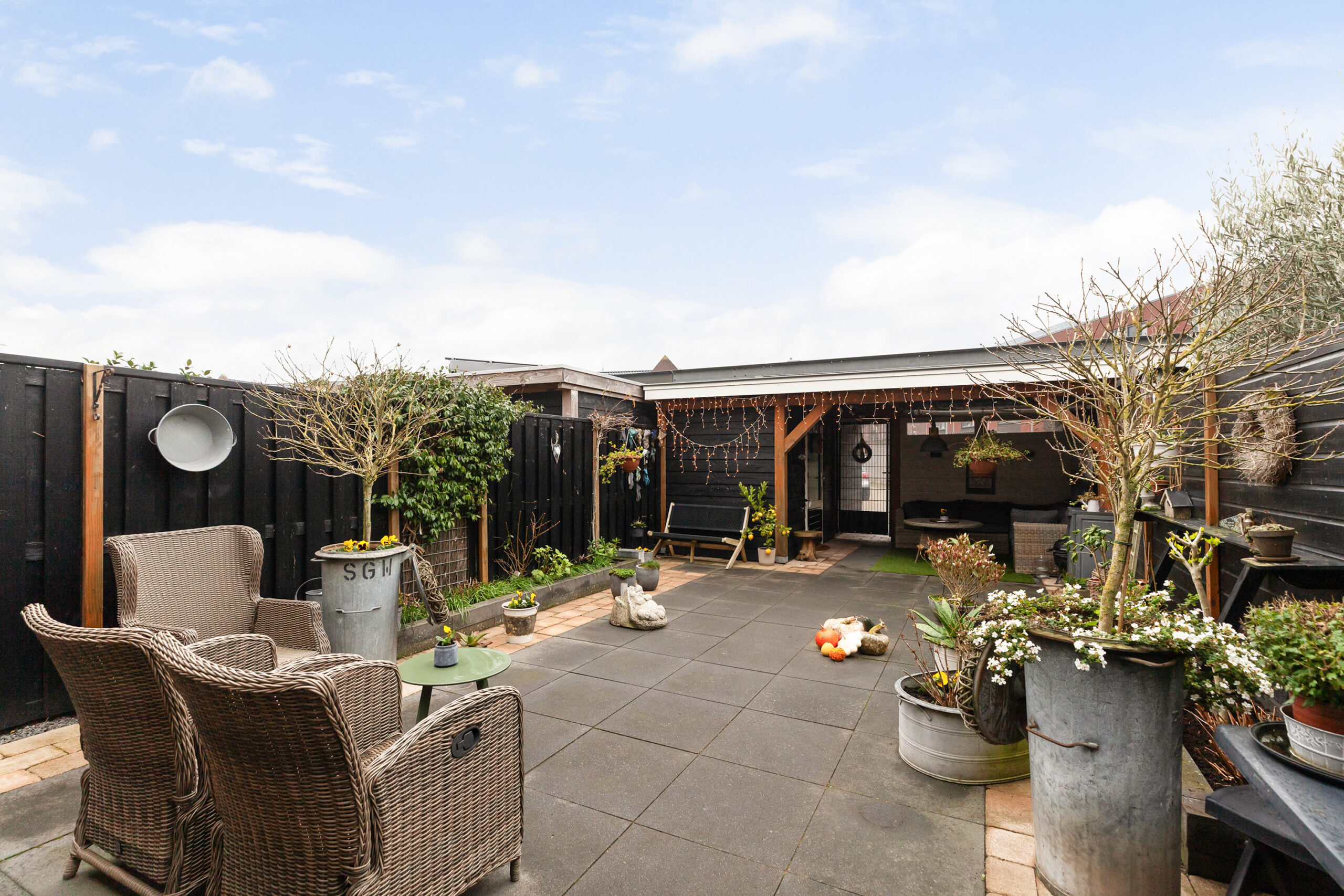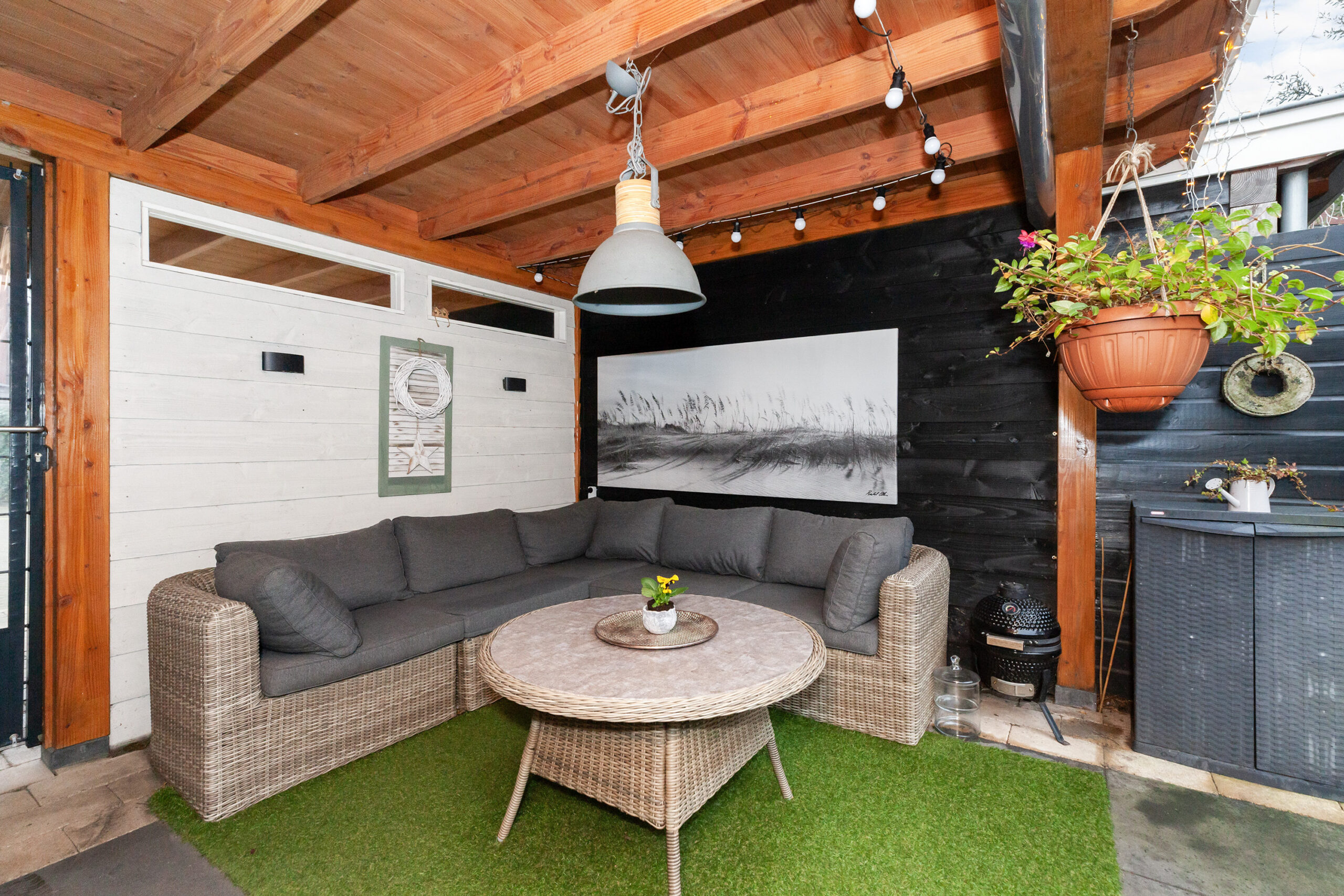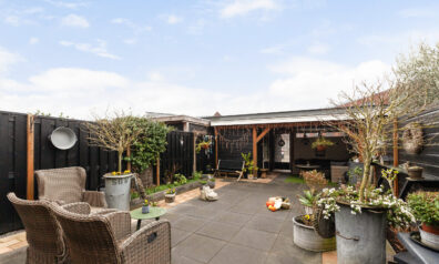 Ook de tuin is praktisch ingericht. Direct achter de woning heeft u alle mogelijkheid om een gezellig tuinset te plaatsen, hier is ook een elektrisch zonnescherm over de volle breedte. Langs de tuin zijn plantenborders waar diverse beplantingen zijn. Loopt u verder, dan komt u bij de grote overkapping, waar het eveneens heerlijk vertoeven is! De naast gelegen berging is circa 5.81/3.52 x 2.88m groot. Via de poort komt u bij uw parkeerplaats, want dat gemak heeft u bij deze woning, parkeren op eigen terrein.