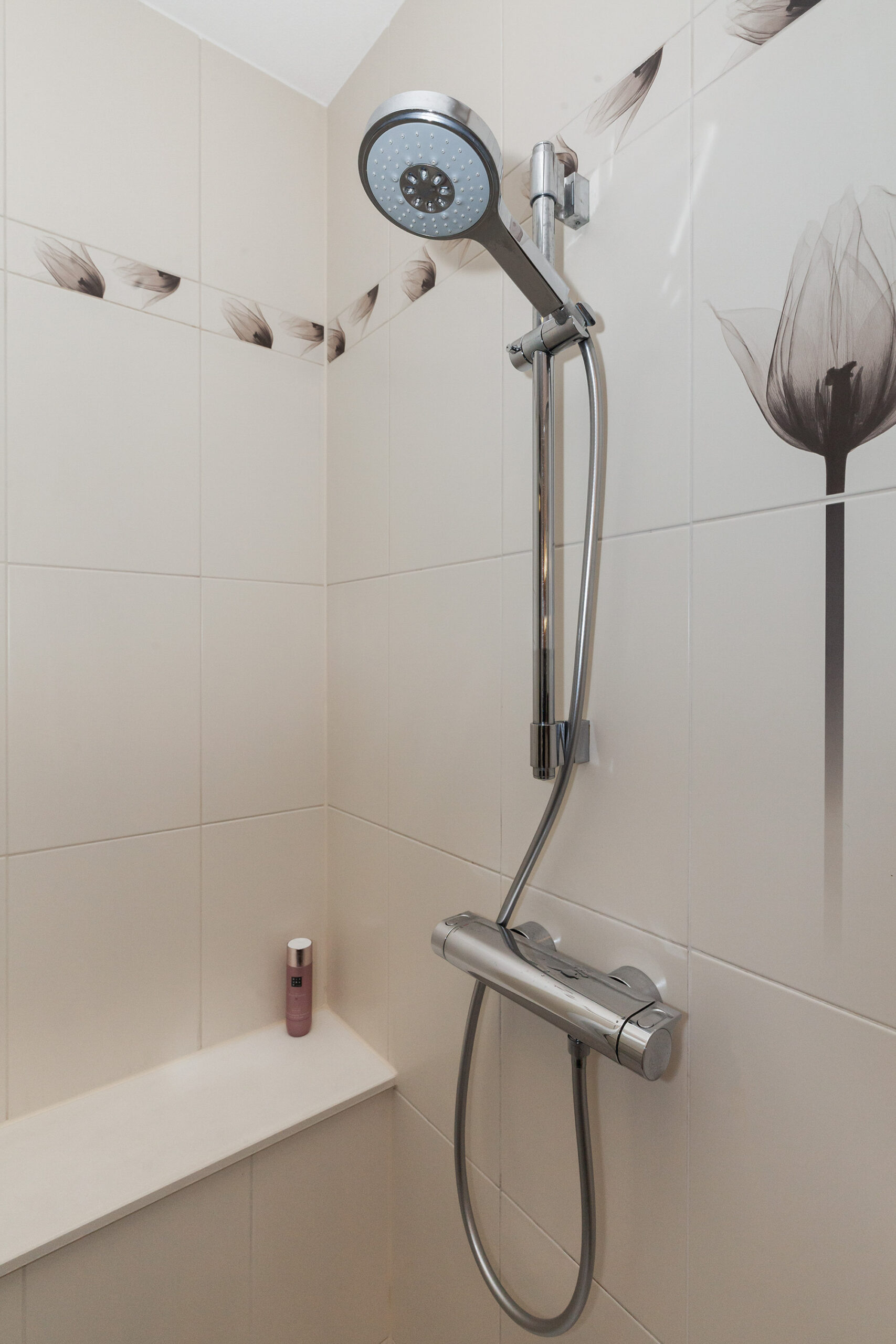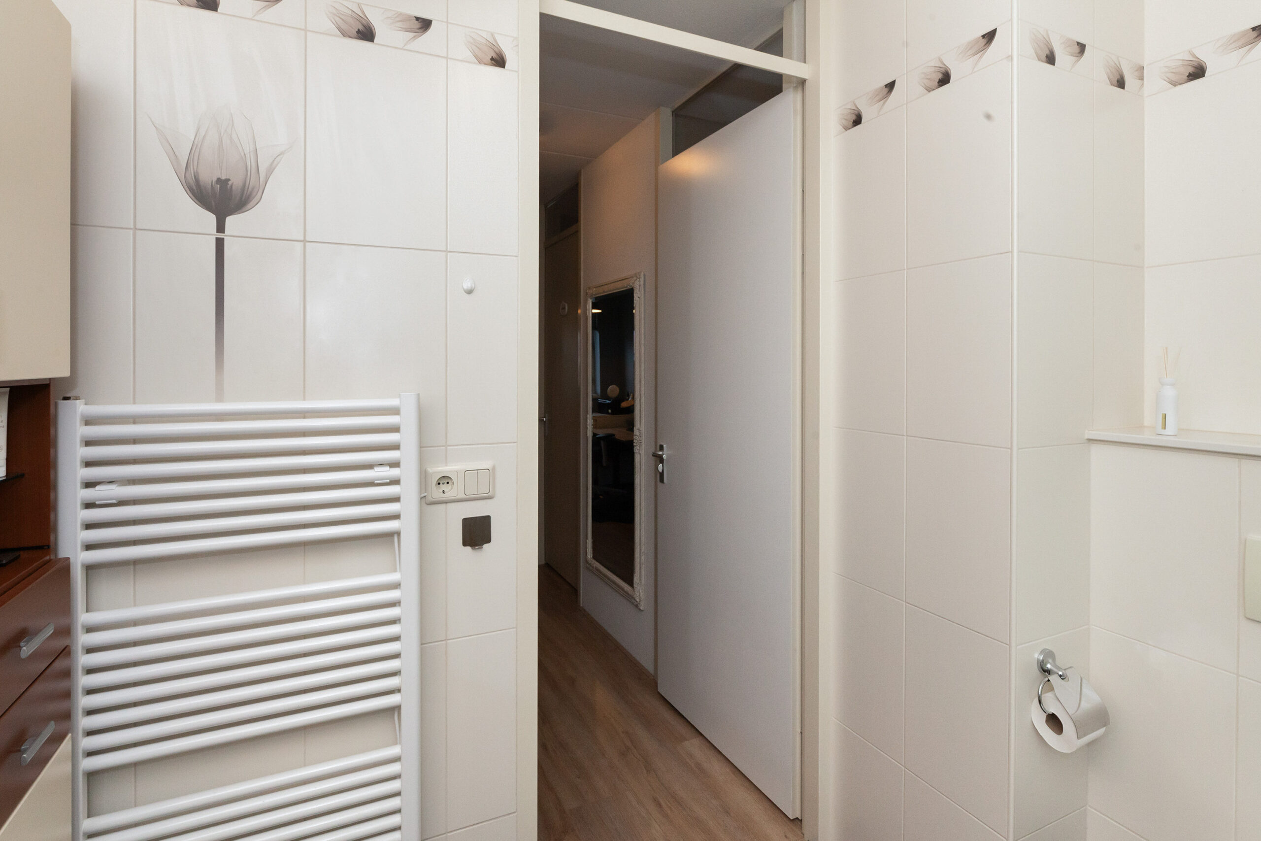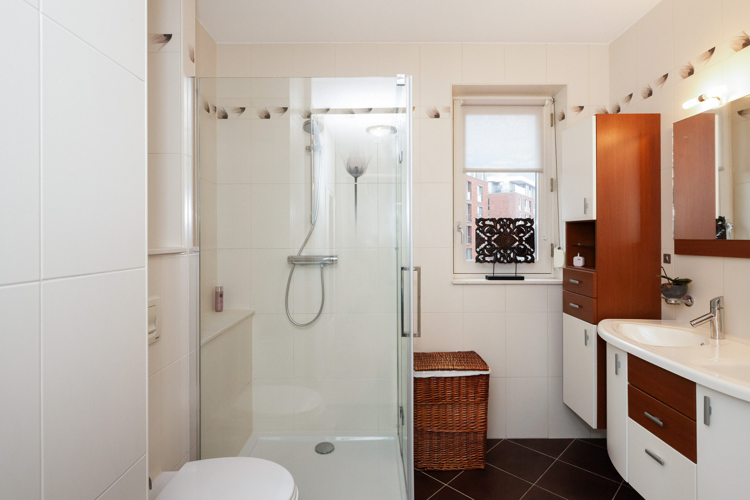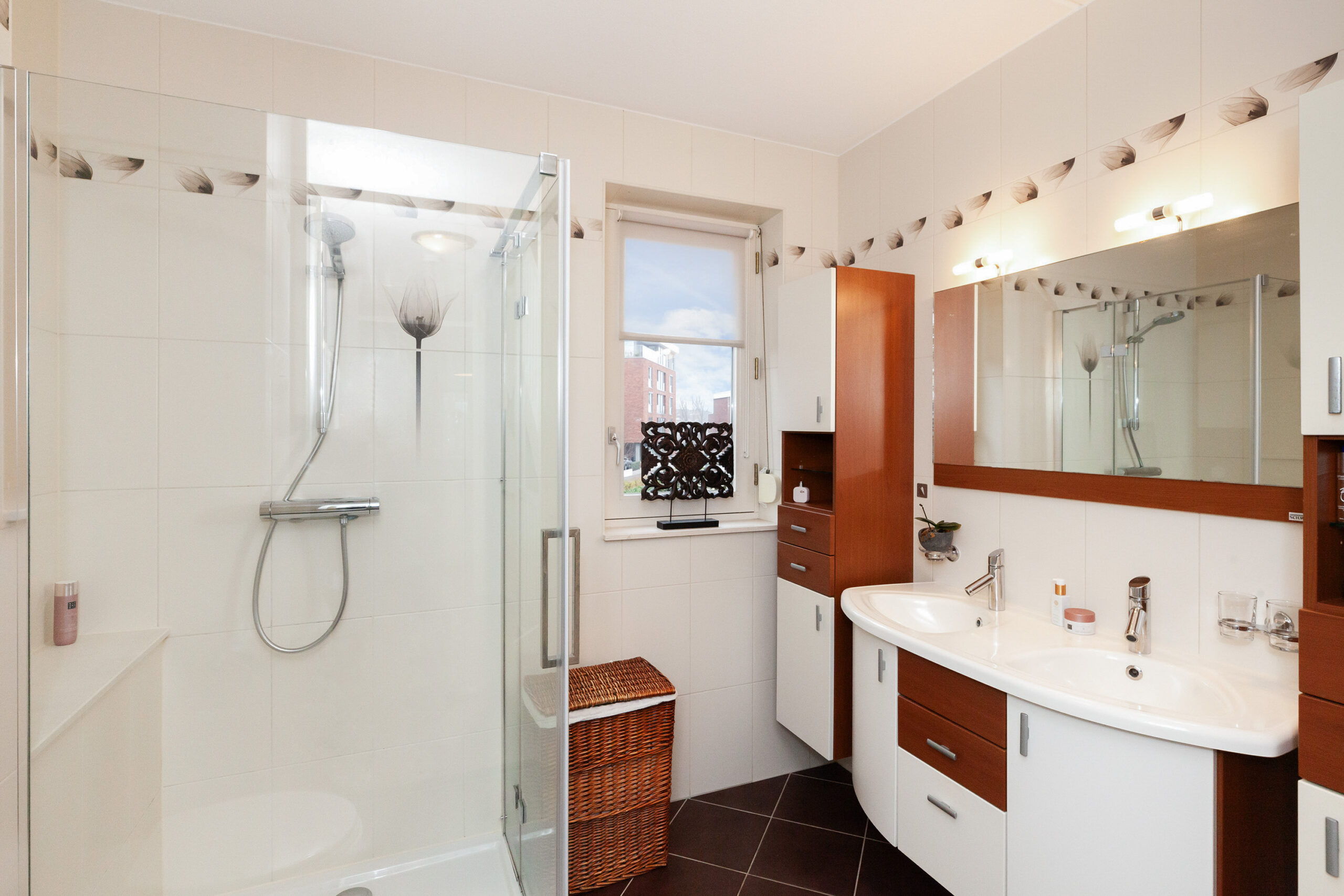 Ook de badkamer is nog in een nette onderhoudsstaat. Er is een ruime douche, dubbel wastafelmeubel, design radiator en een toilet.