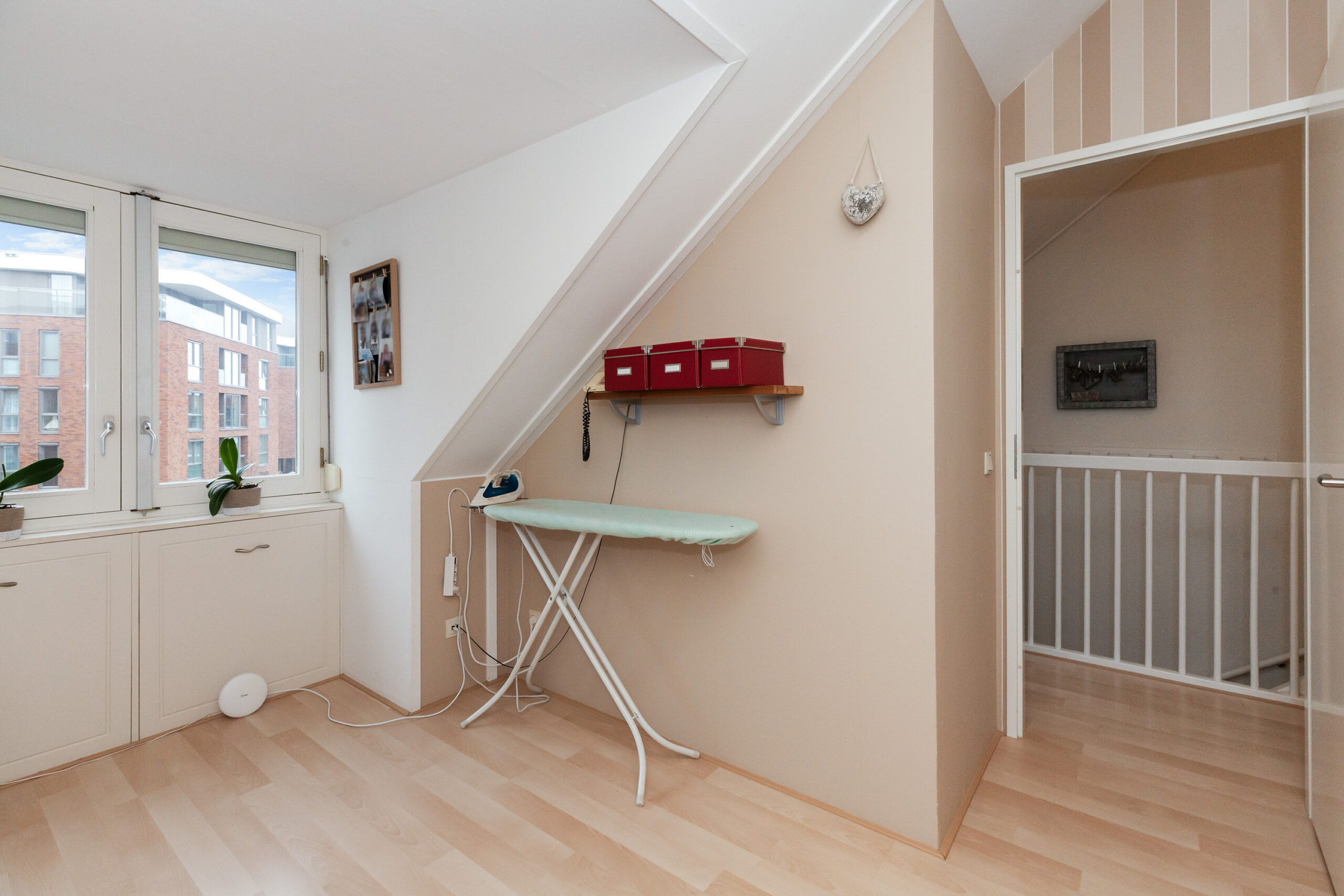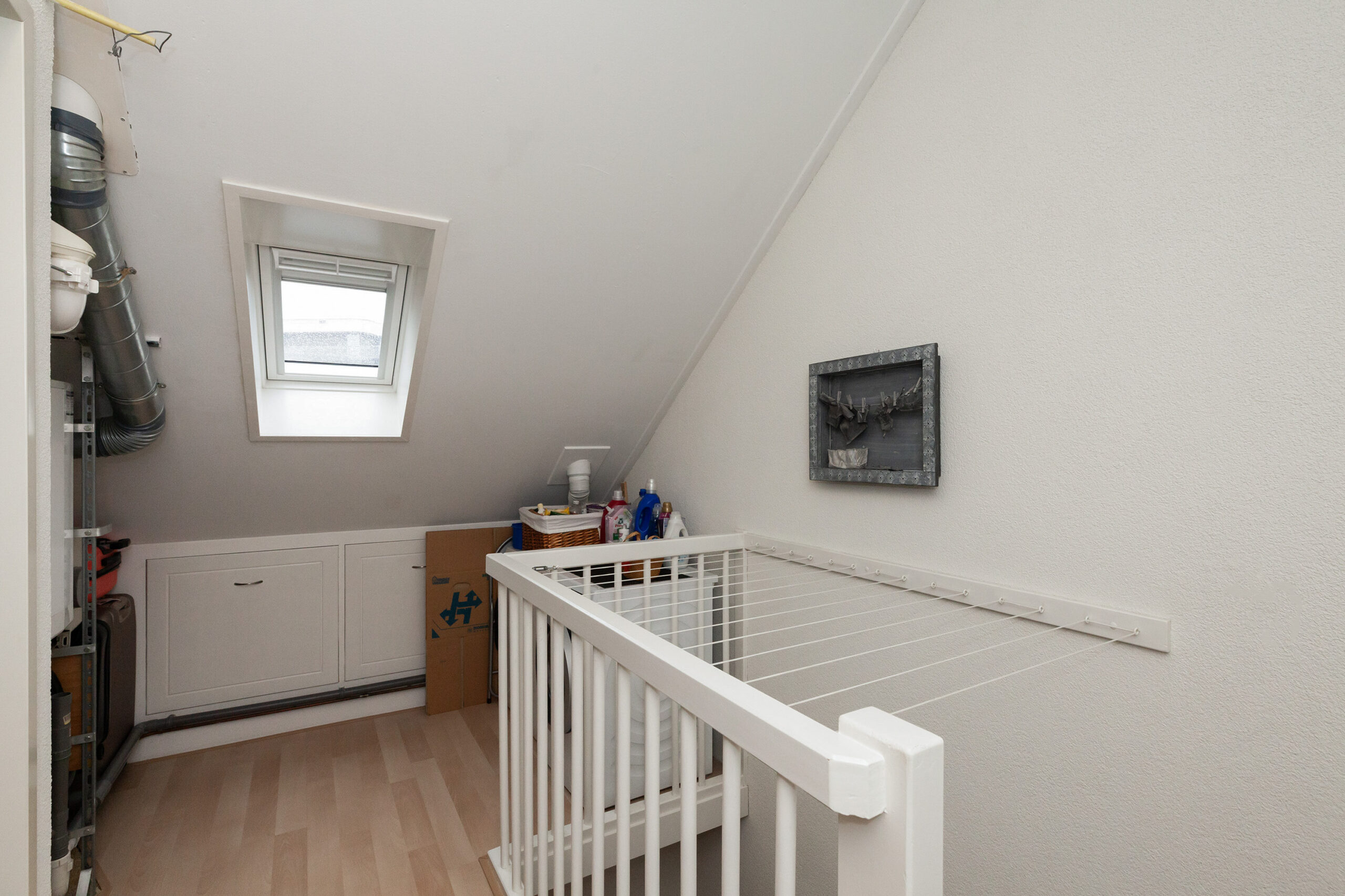 Op de overloop heeft een tuimelraam (met verduisteringsgordijn) en bergruimte onder het schuine dak aan de voorzijde. Verder is hier ook de opstelling van de C.V.-ketel en heeft u plaats voor de wasmachine en droger.