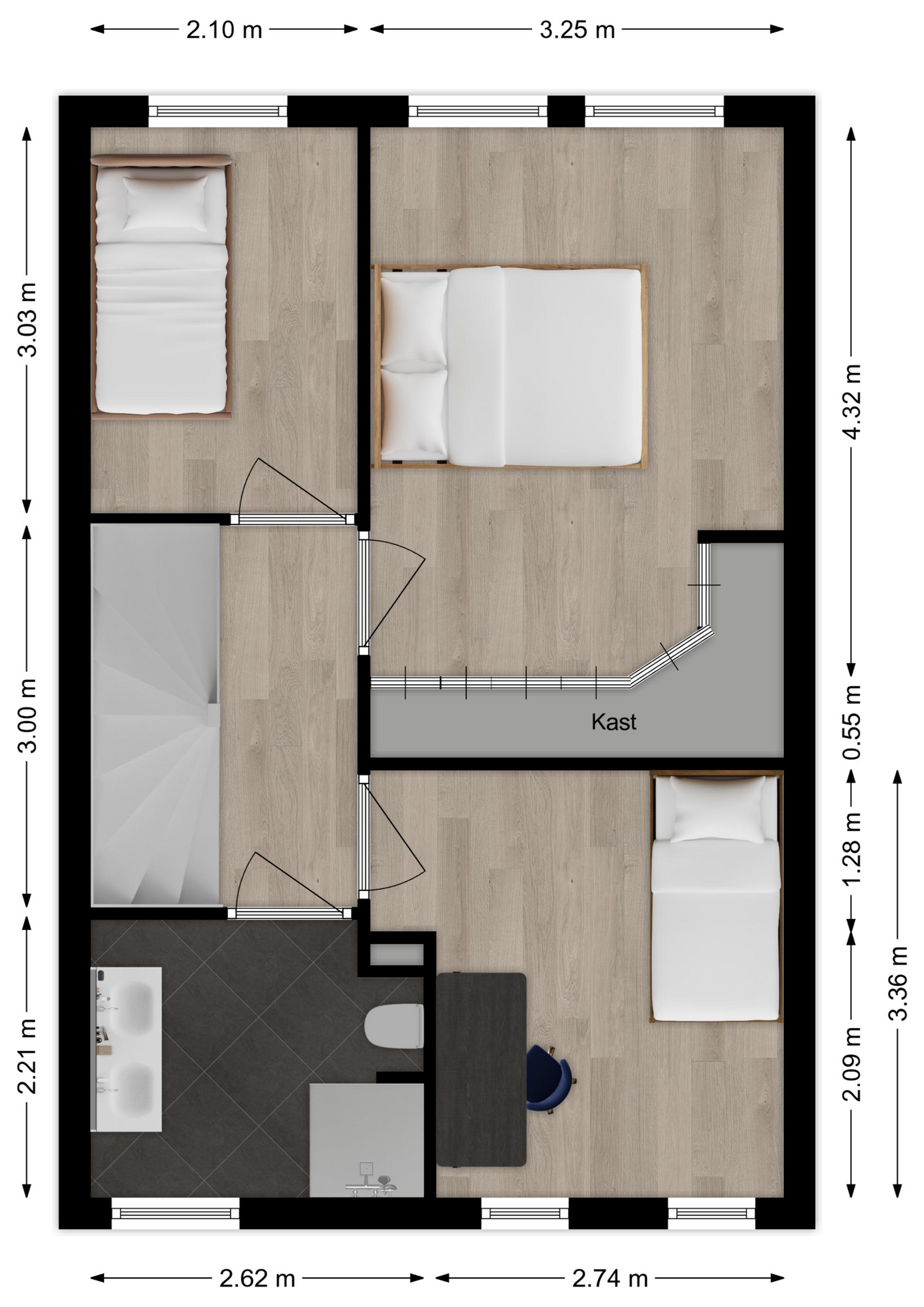 Met de trap vanuit de hal komt u op de eerste verdieping. Vanaf de overloop heeft u toegang tot de drie slaapkamers en de badkamer. Alle ramen zijn voorzien van rolluiken.