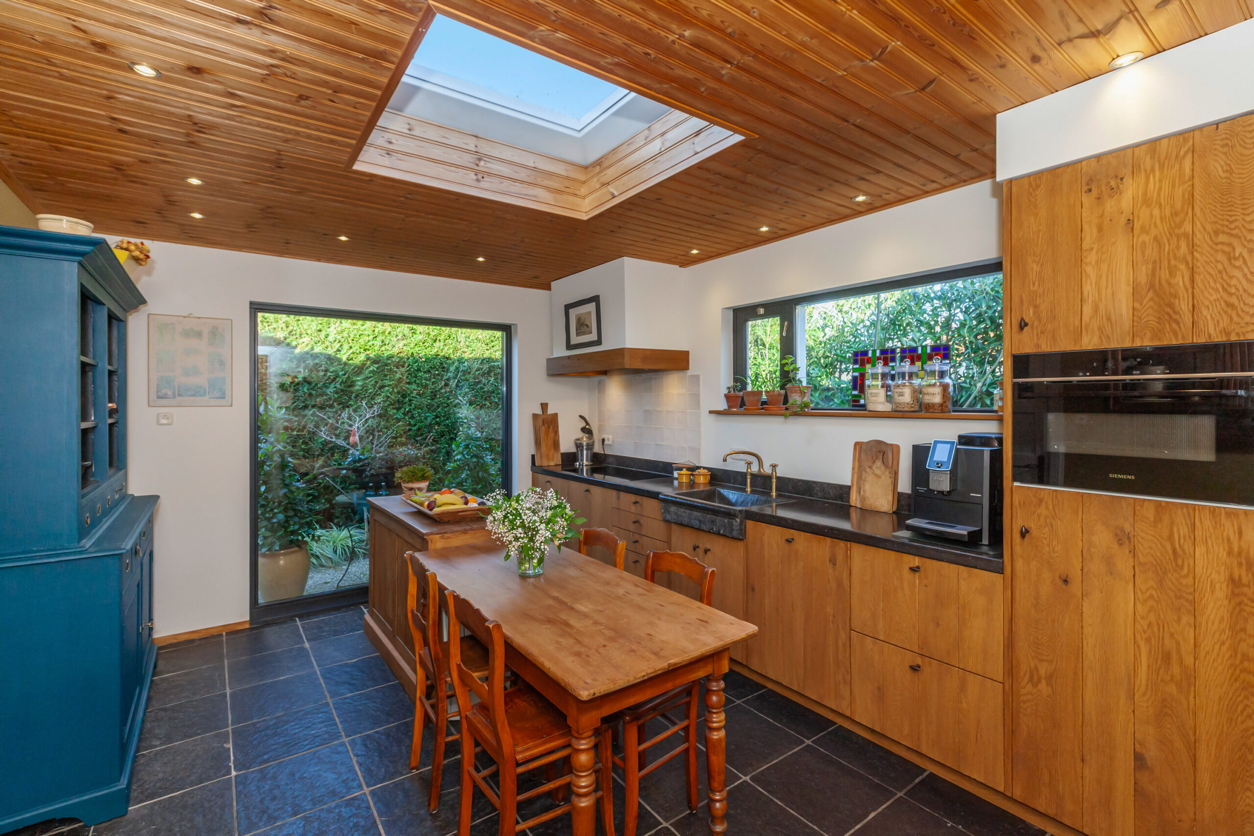 De woonkeuken is voorzien van een natuurstenen vloer, is in 2024 gemoderniseerd en voor het overgrote deel vernieuwd. Deze woonkeuken betreedt u vanuit de woonkamer en eveneens vanuit de bijkeuken. Aan prettig lichtinval ontbreekt het hier niet, gezien de ramen en de lichtkoepel. Aan inbouwapparatuur is er de beschikking over een inductiekookplaat, afzuigkap, vaatwasser, combi-oven, koelkast en vriezer. De keuken is afgewerkt met een eikenlook, een Belgisch hardsteen aanrechtblad en er is een close-inboiler aanwezig.