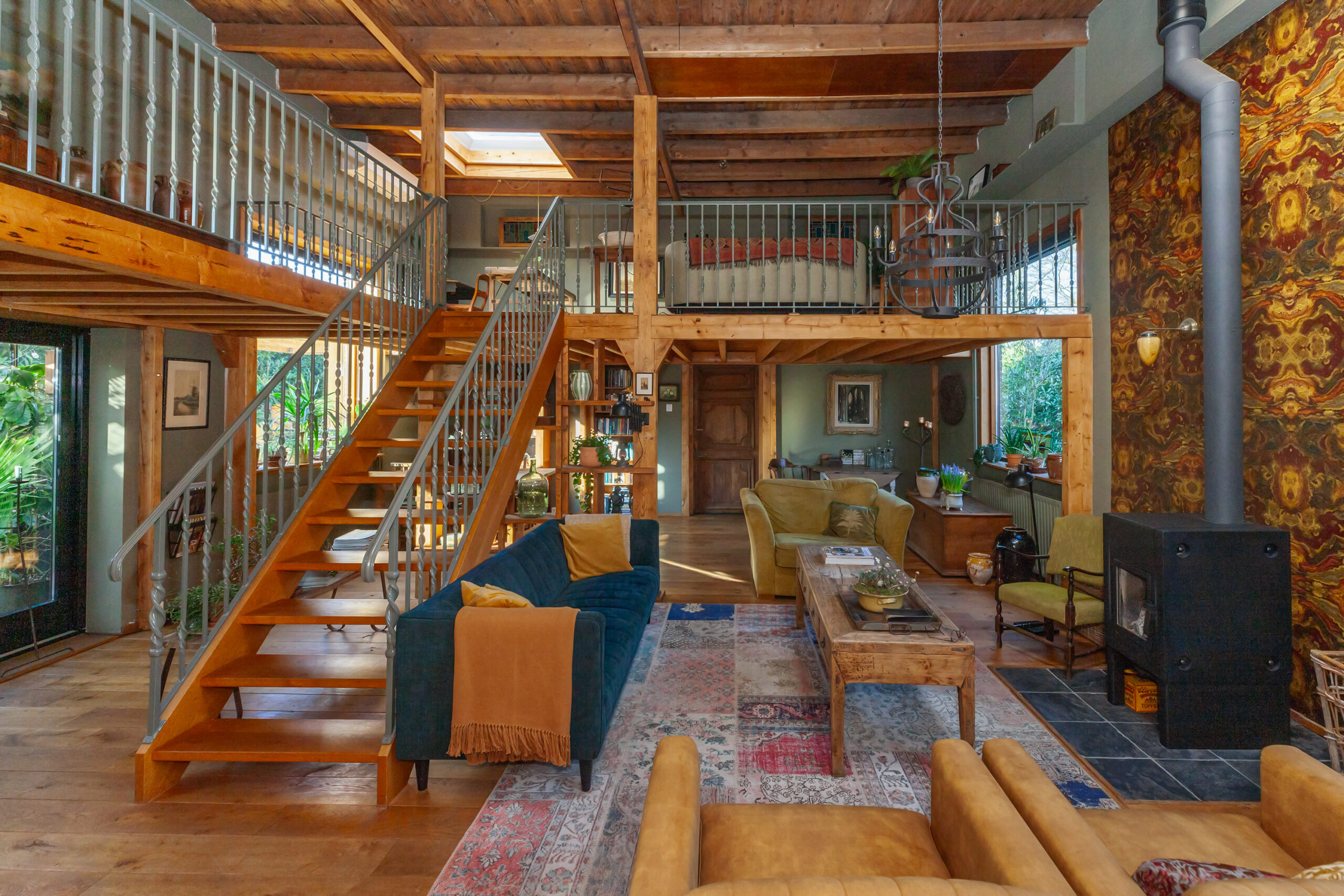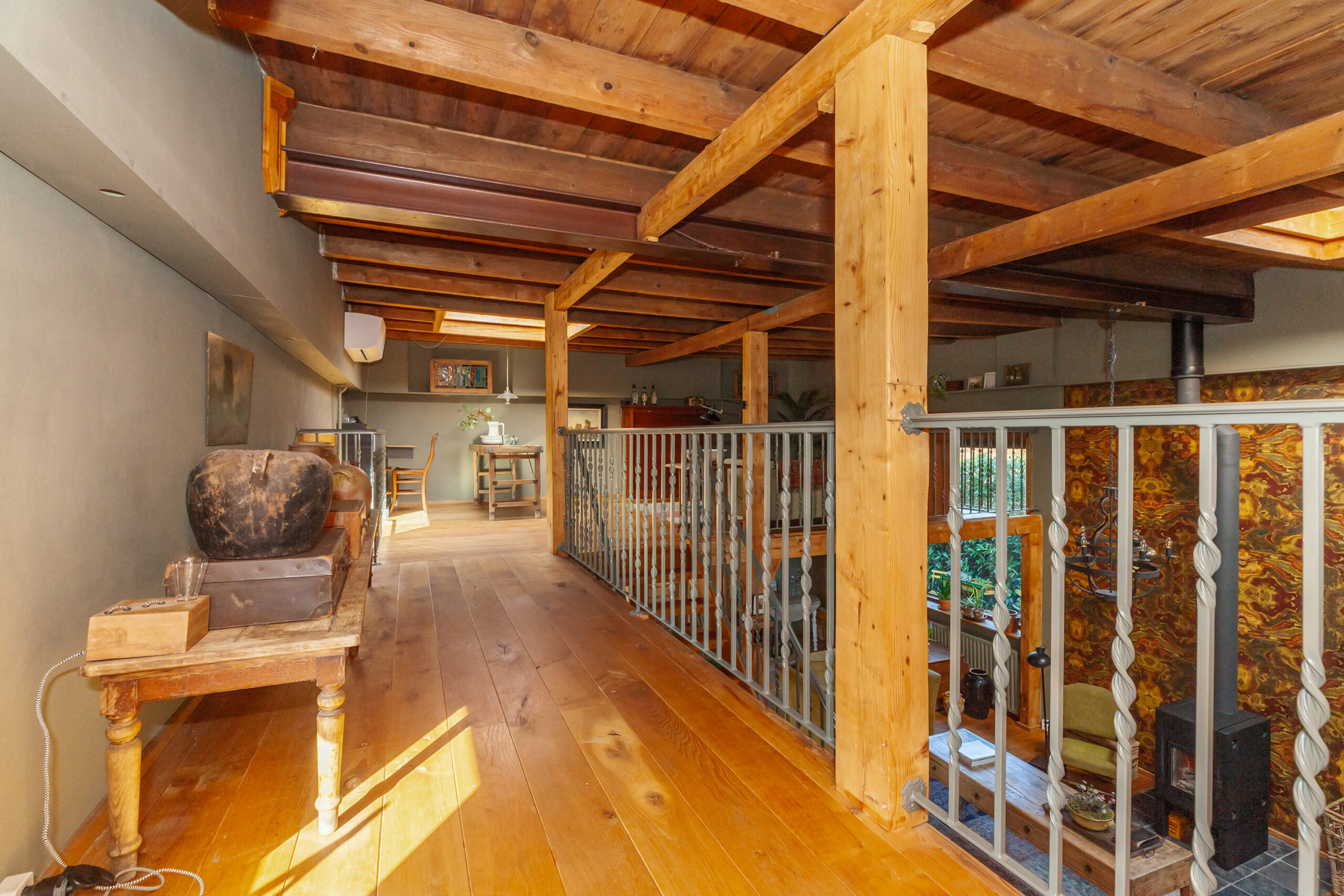Zodra de deuren voor u open gaan staat u verrassend stil. Denkt u het eens in, hoe hier tot in de jaren ’70 bruidsparen hun ware entree maakten in deze trouwzaal. De historie is bijna tastbaar! Direct valt uw oog op de vide met de smeedijzeren balustrade. Tezamen met de woonkamer heeft dit een royale oppervlakte. Centraal staat de luxe houtkachel welke een groot vermogen heeft waar volop warmte vanaf straalt.