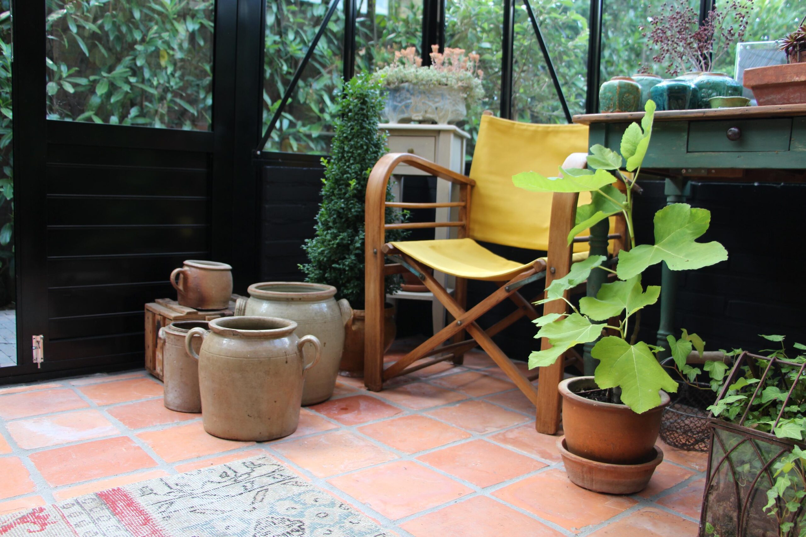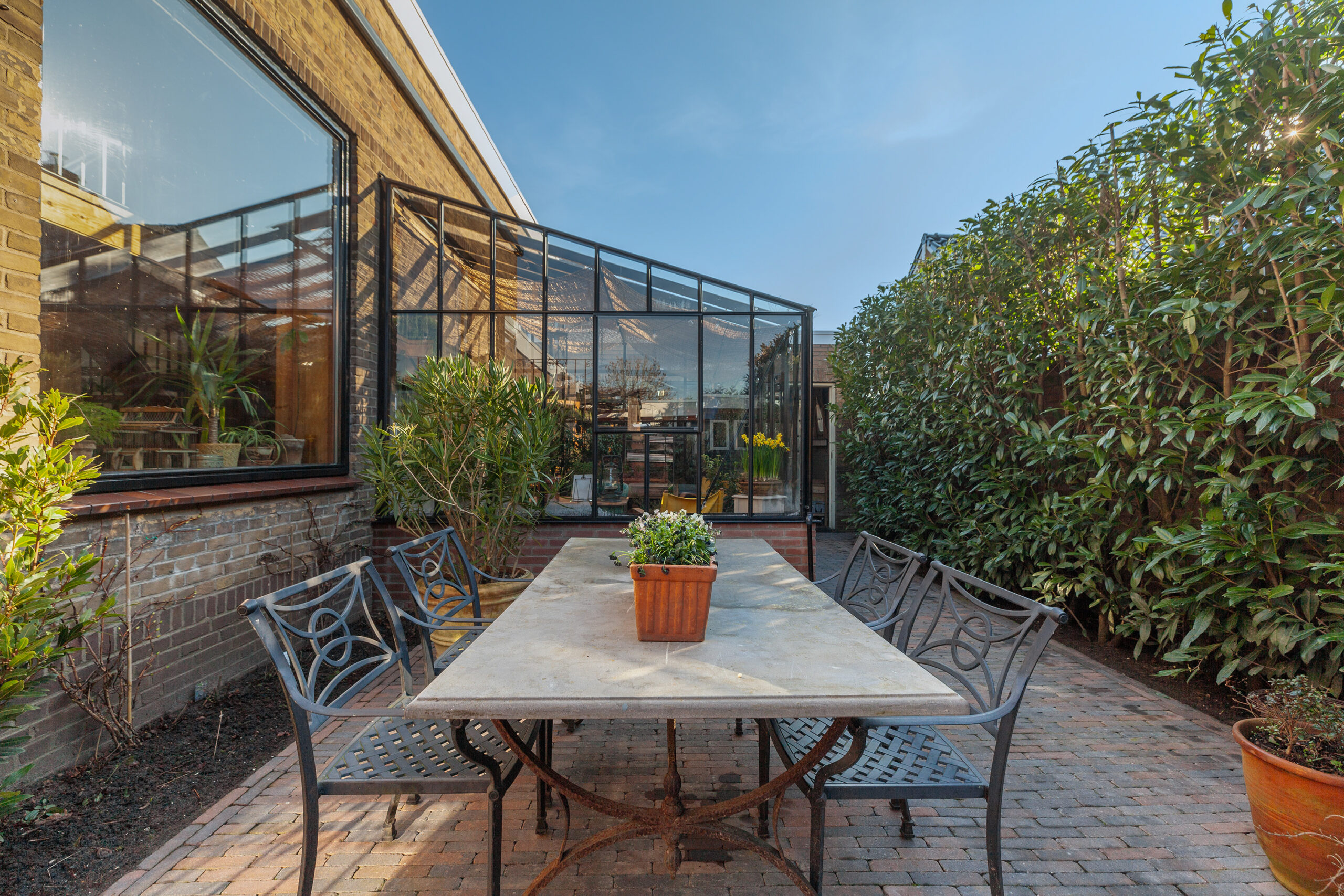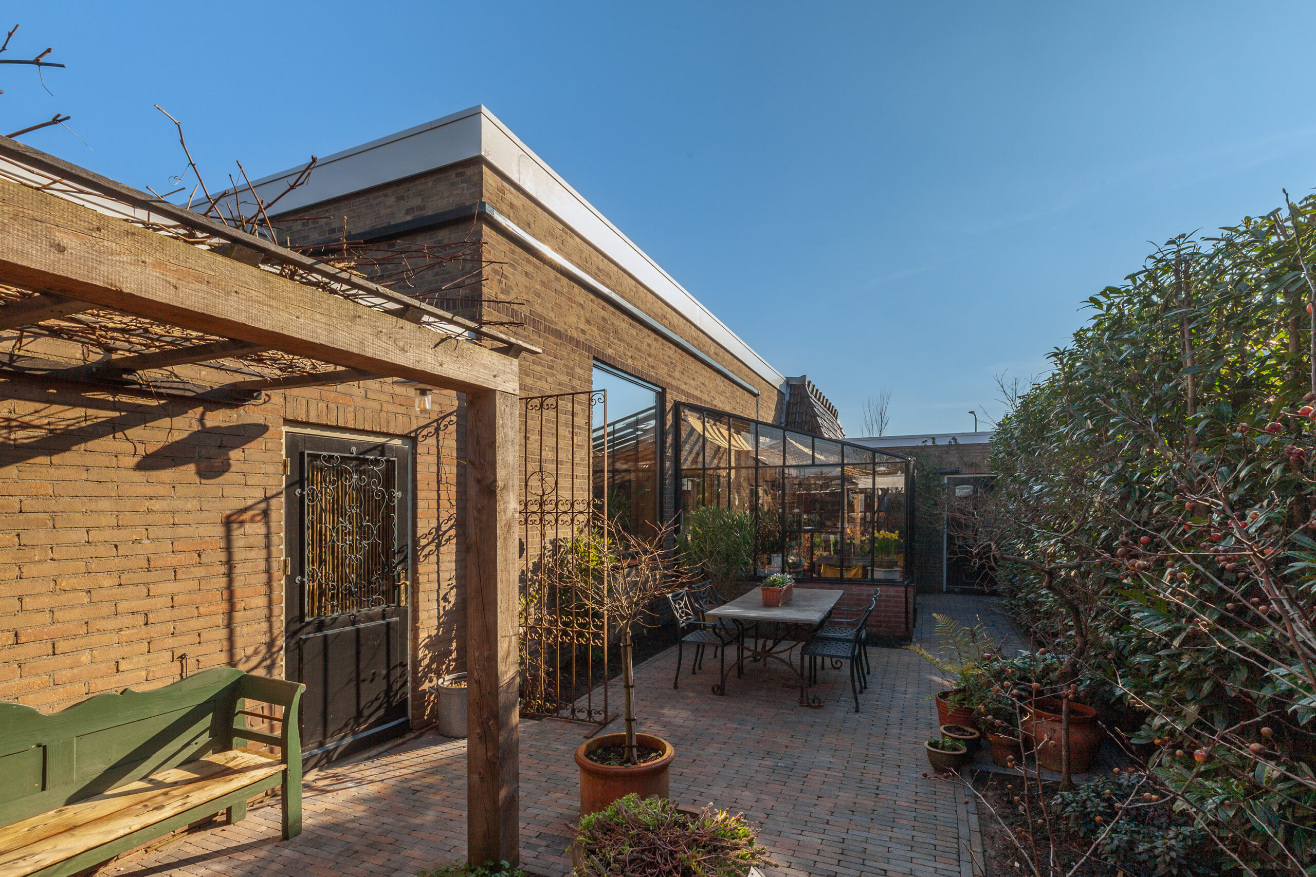 Vanuit de woonkamer heeft u toegang tot een in 2024 aangebouwde muurkas met op de vloer antieke estriken. Heerlijk om in de winter in het zonnetje te zitten!