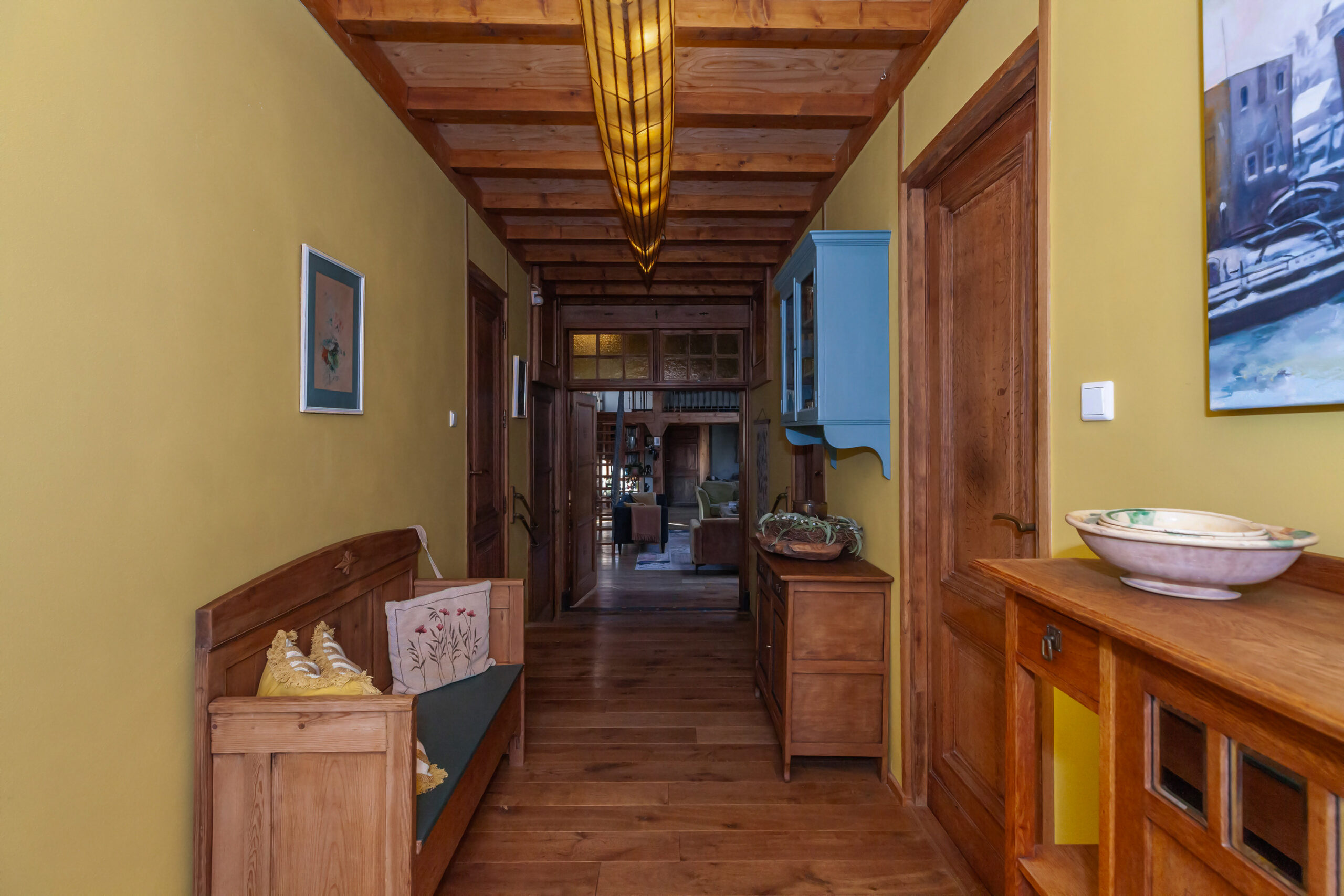 Zodra u de hal in stapt heeft u een schitterende brede gang die toegang geeft tot de twee slaapvertrekken, badkamer en achter de grote kloosterdeuren komt u in de woonkamer. Verder is er middels een tussenportaal toegang tot de garage.