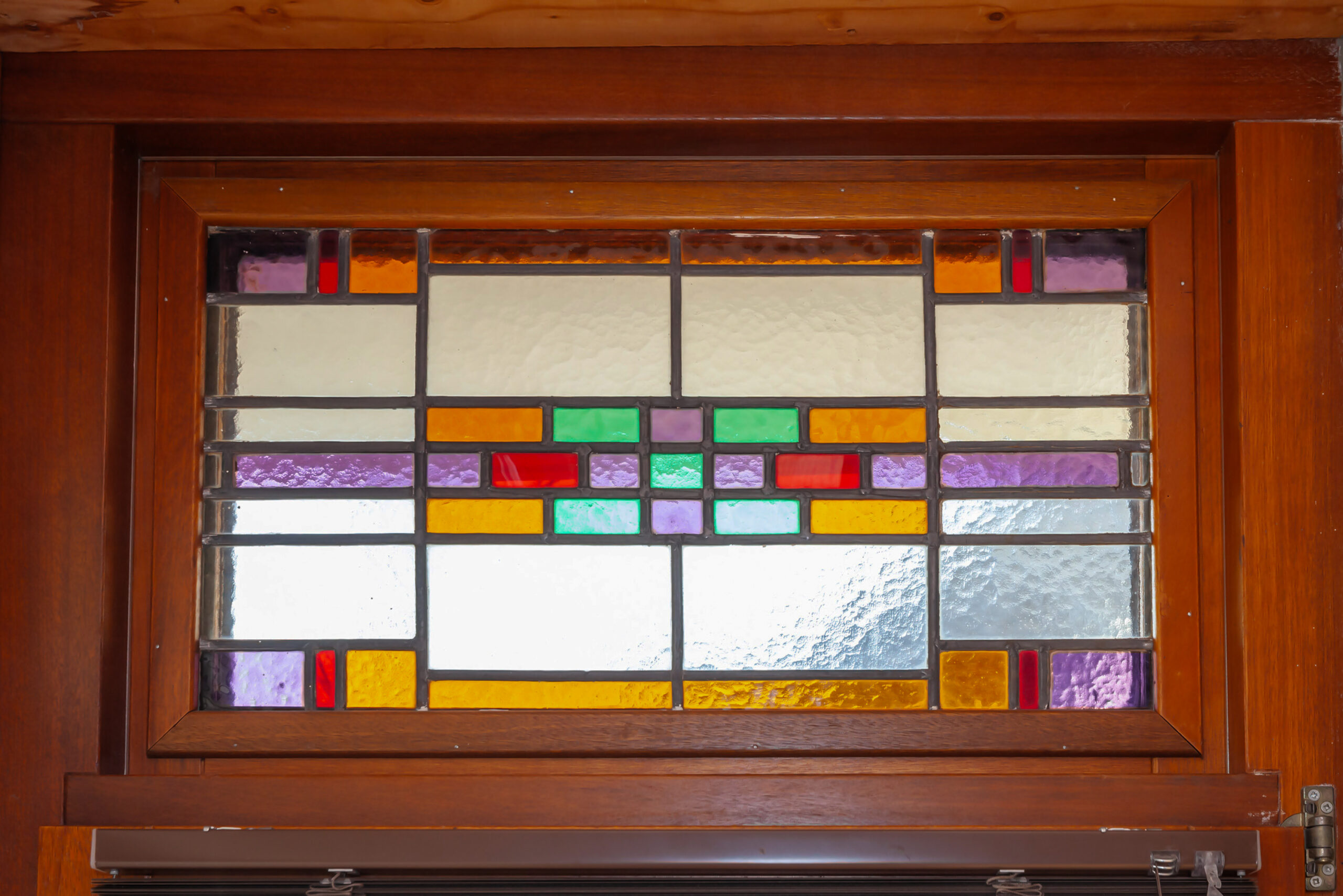 De tweede slaapkamer is aan de andere zijde van de brede gang gesitueerd. Ook deze kamer heeft glas-in-loodwerk boven de ramen.