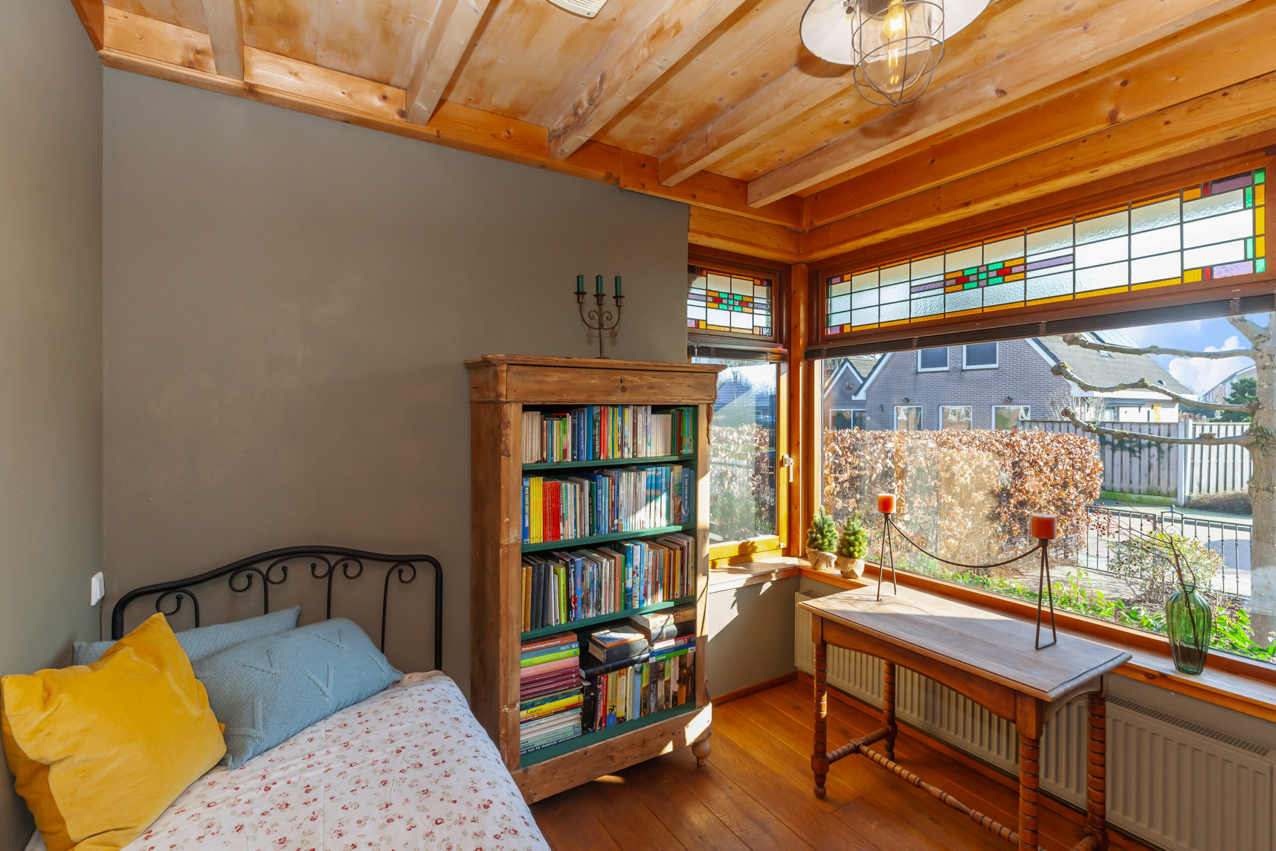 De voormalige raadszaal is nu in gebruik als slaapkamer en gesitueerd aan de voorzijde van de woning. Ziet u de sfeervolle details in het glas-in-loodwerk? Naast de inbouwkast is er een airco aanwezig.
