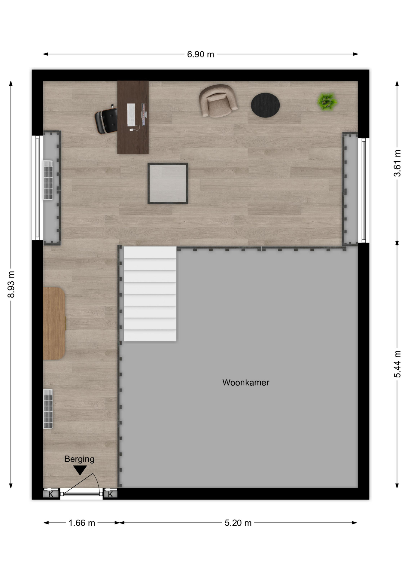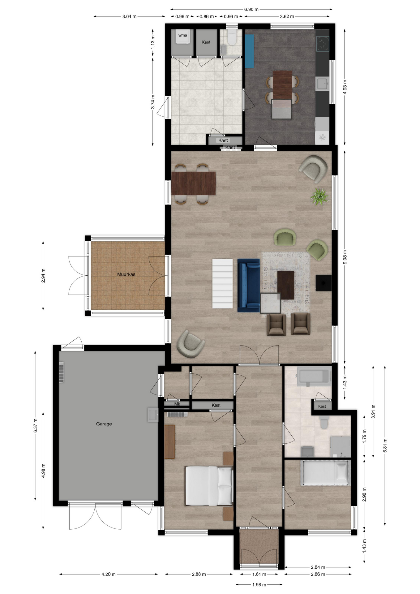 Maatvoering woonkamer: Circa 9.08 x 6.90m