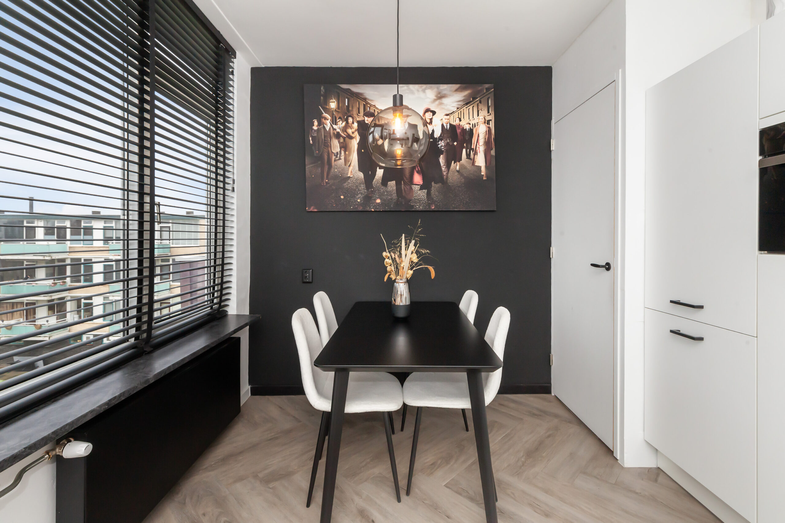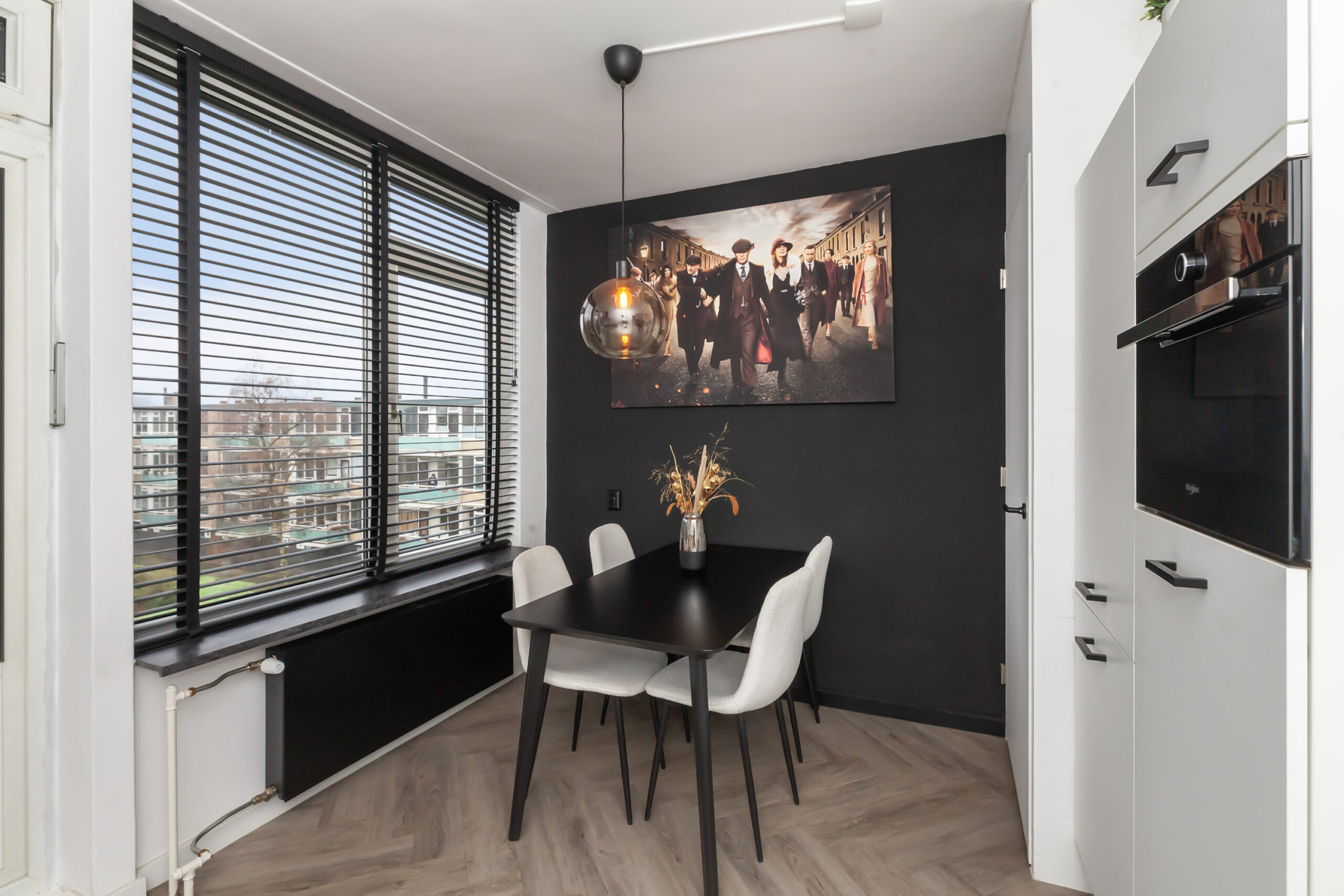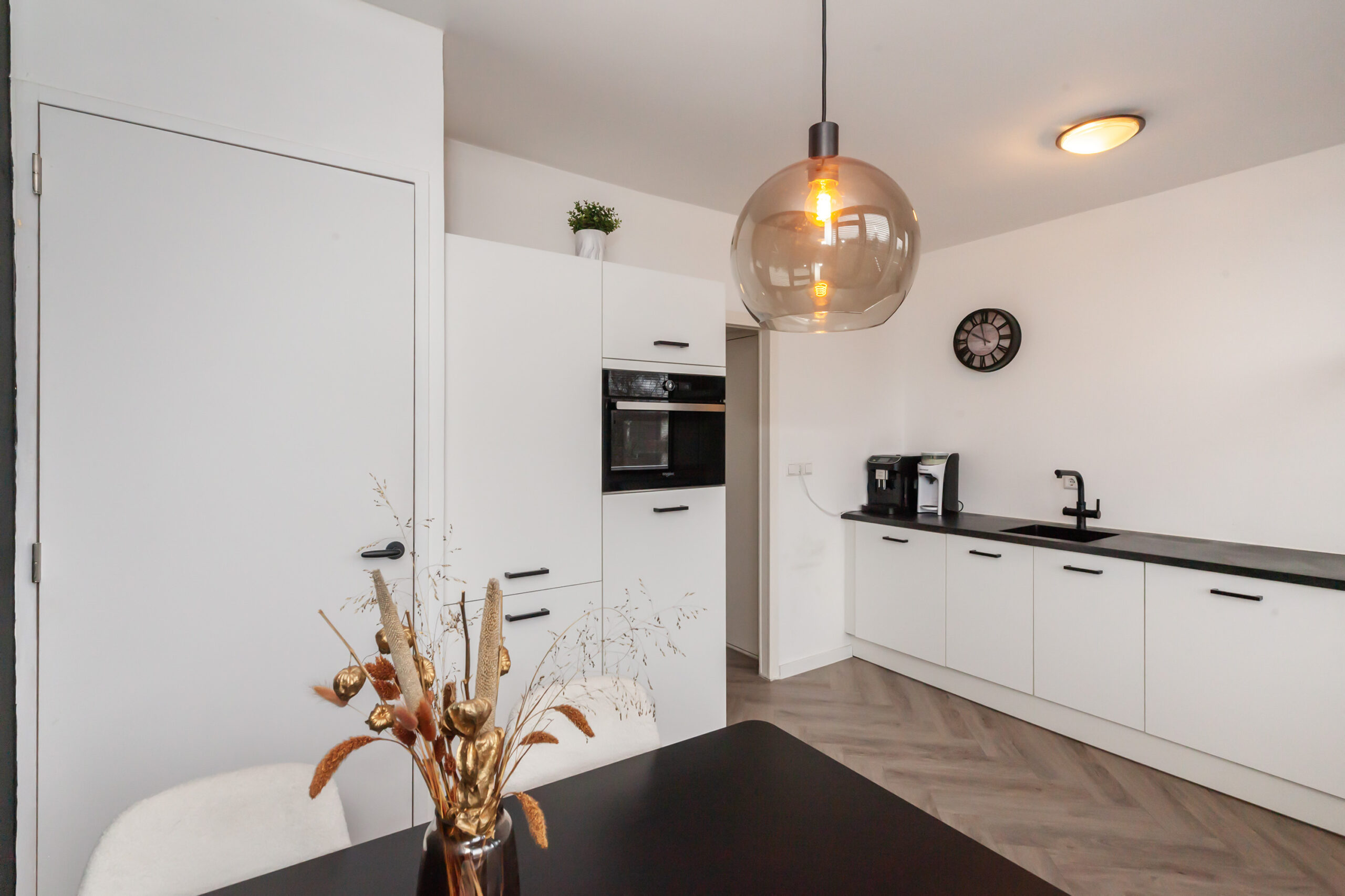 Geheel passend in stijl met het gehele appartement is ook deze keuken. Strakke afwerkingen in een contrasterende kleurstelling. Door de ruimte die er is, is er voldoende plaatst om de eethoek hier te creëren. Aan de rechte opstelling is er een inductiekookplaat, afzuigkap en vaatwasser. Verder is er een koel-/vriescombinatie en combimagnetron. In de inbouwkast tref je de elektrische boiler (eigendom). Ook vanuit de keuken kun je naar het balkon van circa 3.21 x 1.58m.