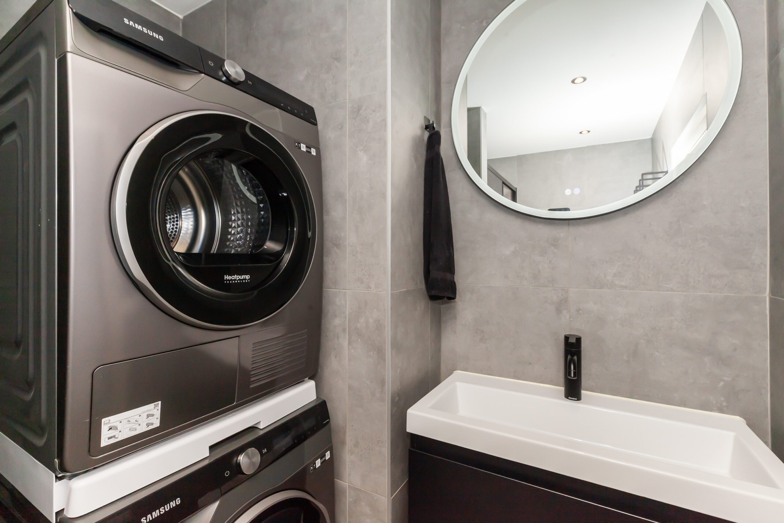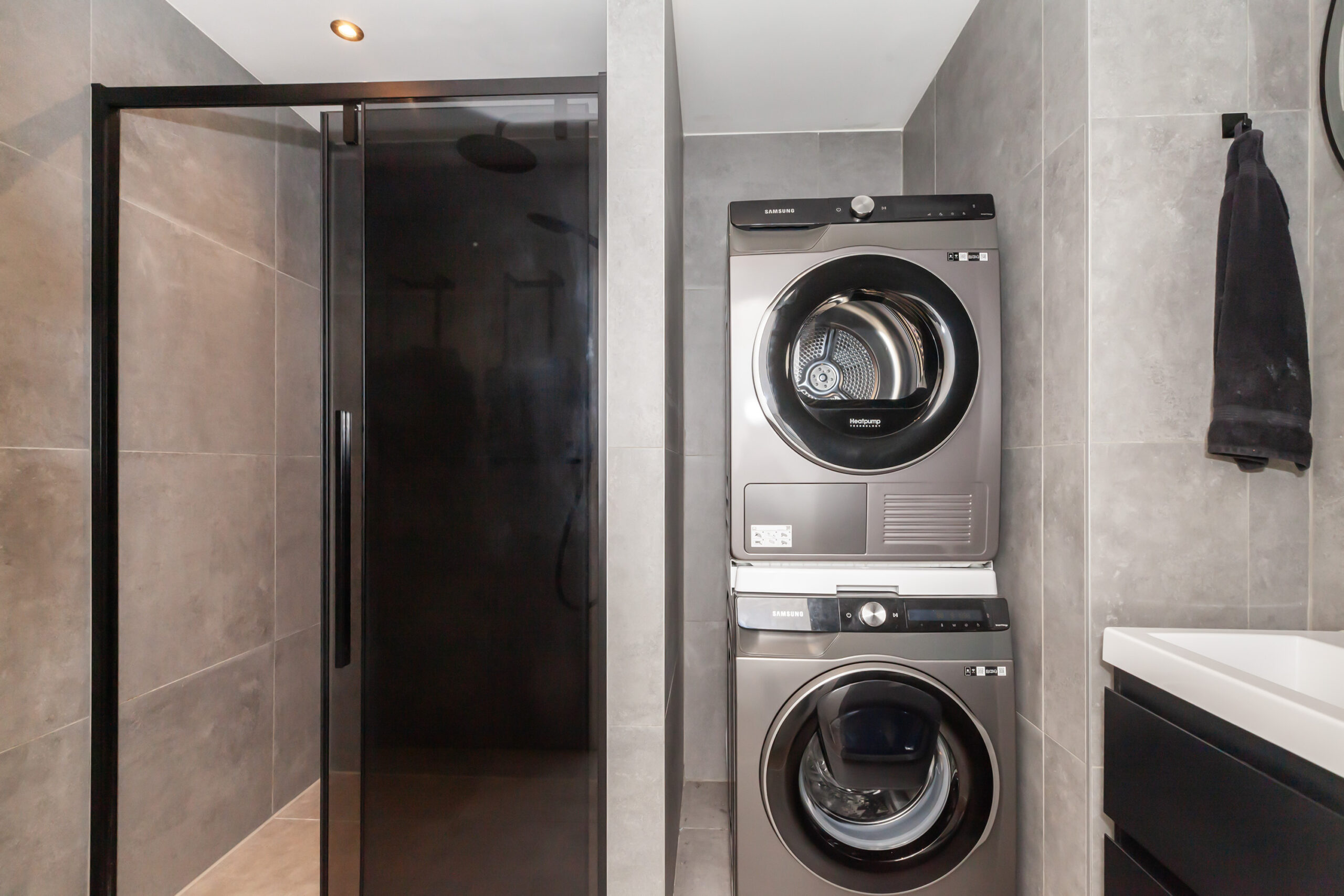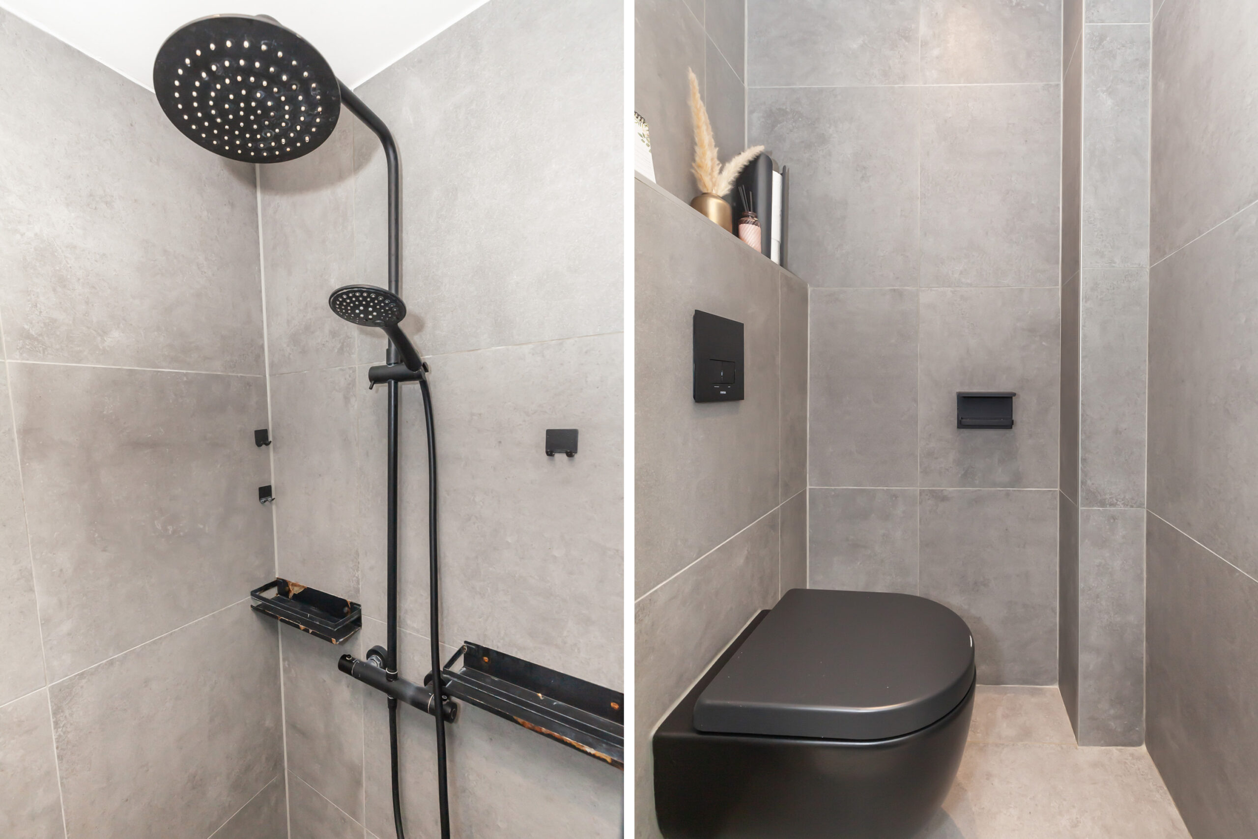 De badkamer en toiletruimte zijn in dezelfde stijl afgewerkt. In de badkamer heb je een inloopdouche, wastafelmeubel en de aansluitingen voor je wasapparatuur.
