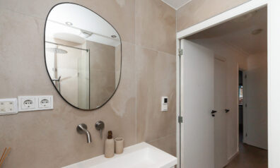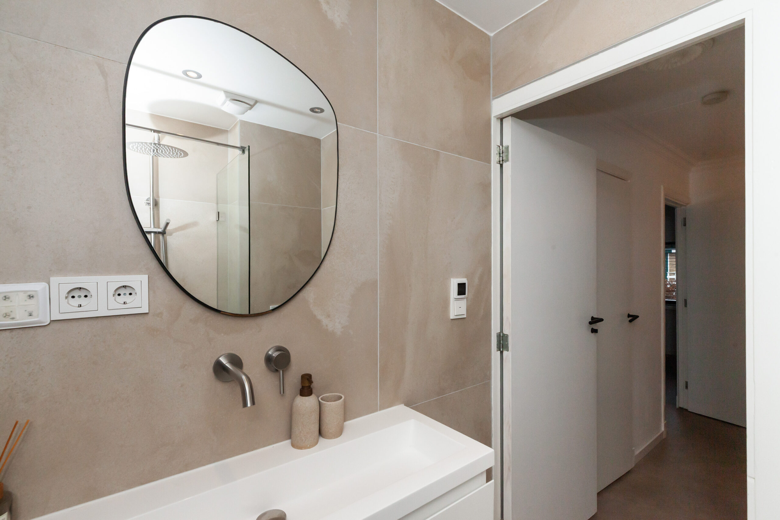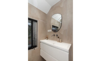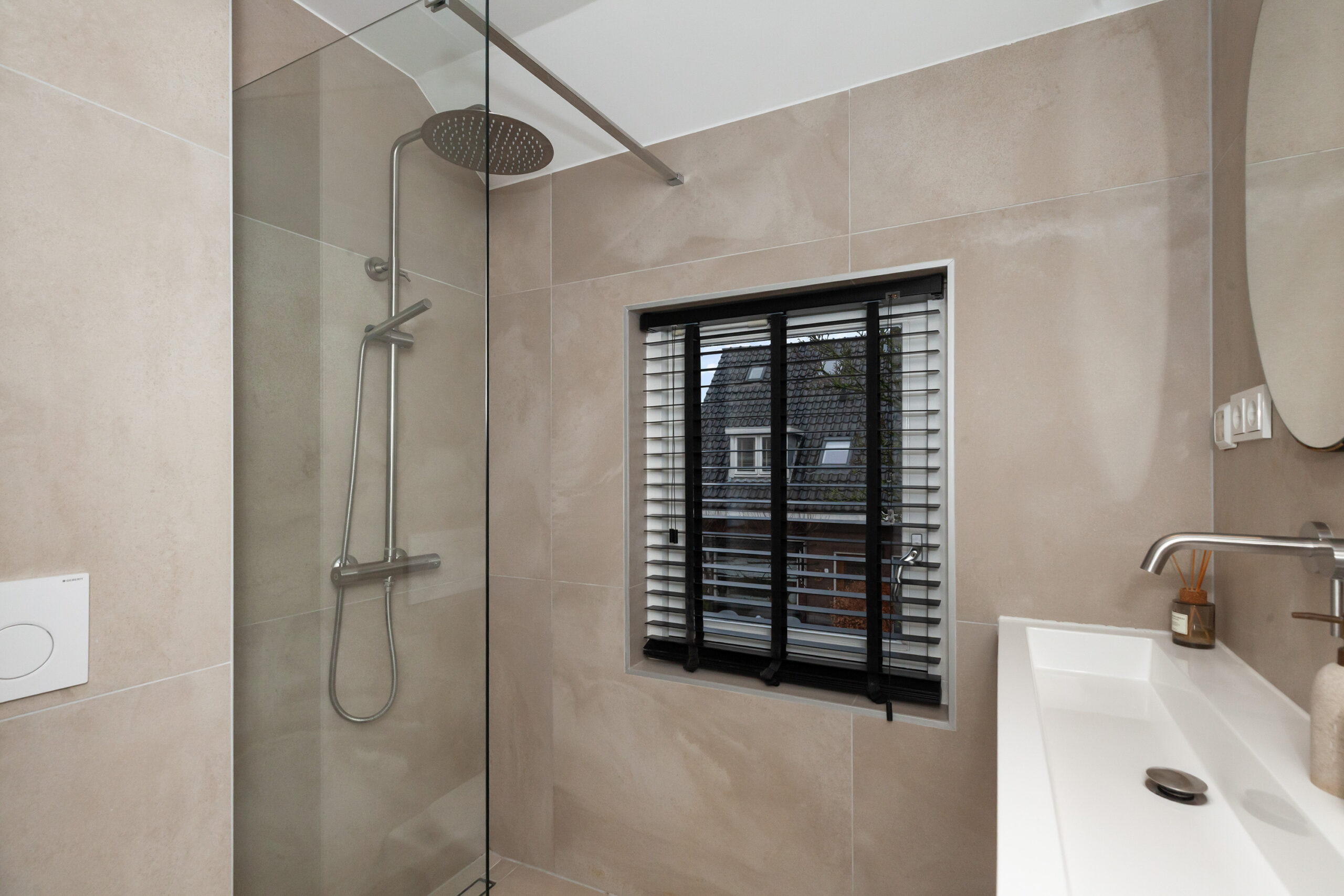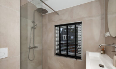Aan de voorzijde is de badkamer in 2022 geplaatst. Hier heeft u beschikking over een inloopdouche, wastafelmeubel en een toilet. Daarbij is er vloerverwarming aanwezig.