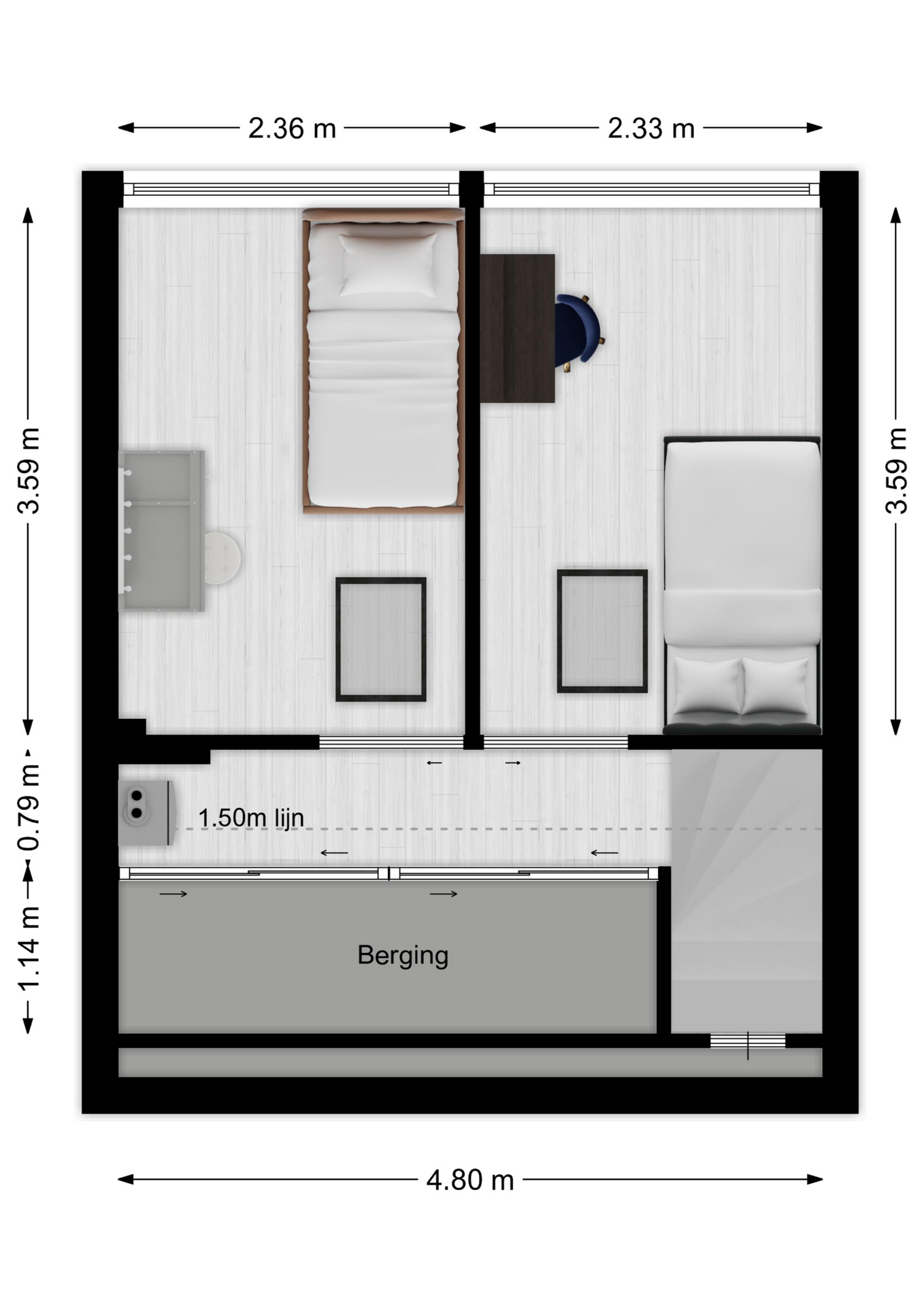 Ook deze slaapkamer is voorzien een extra tuimelraam.