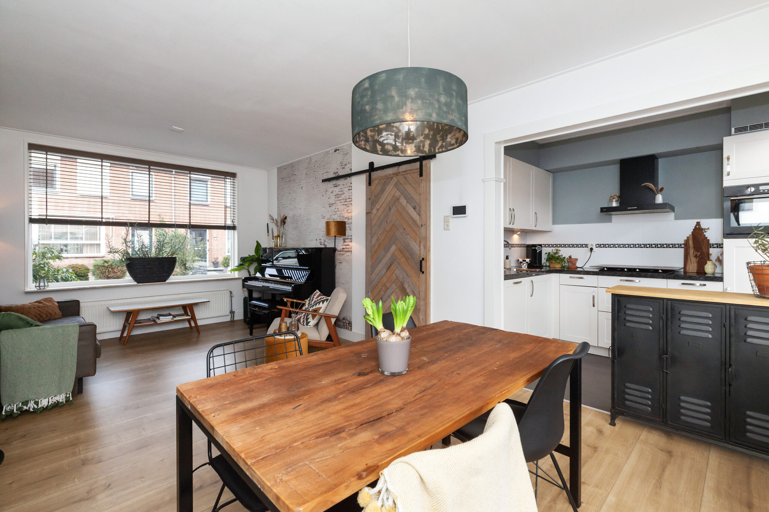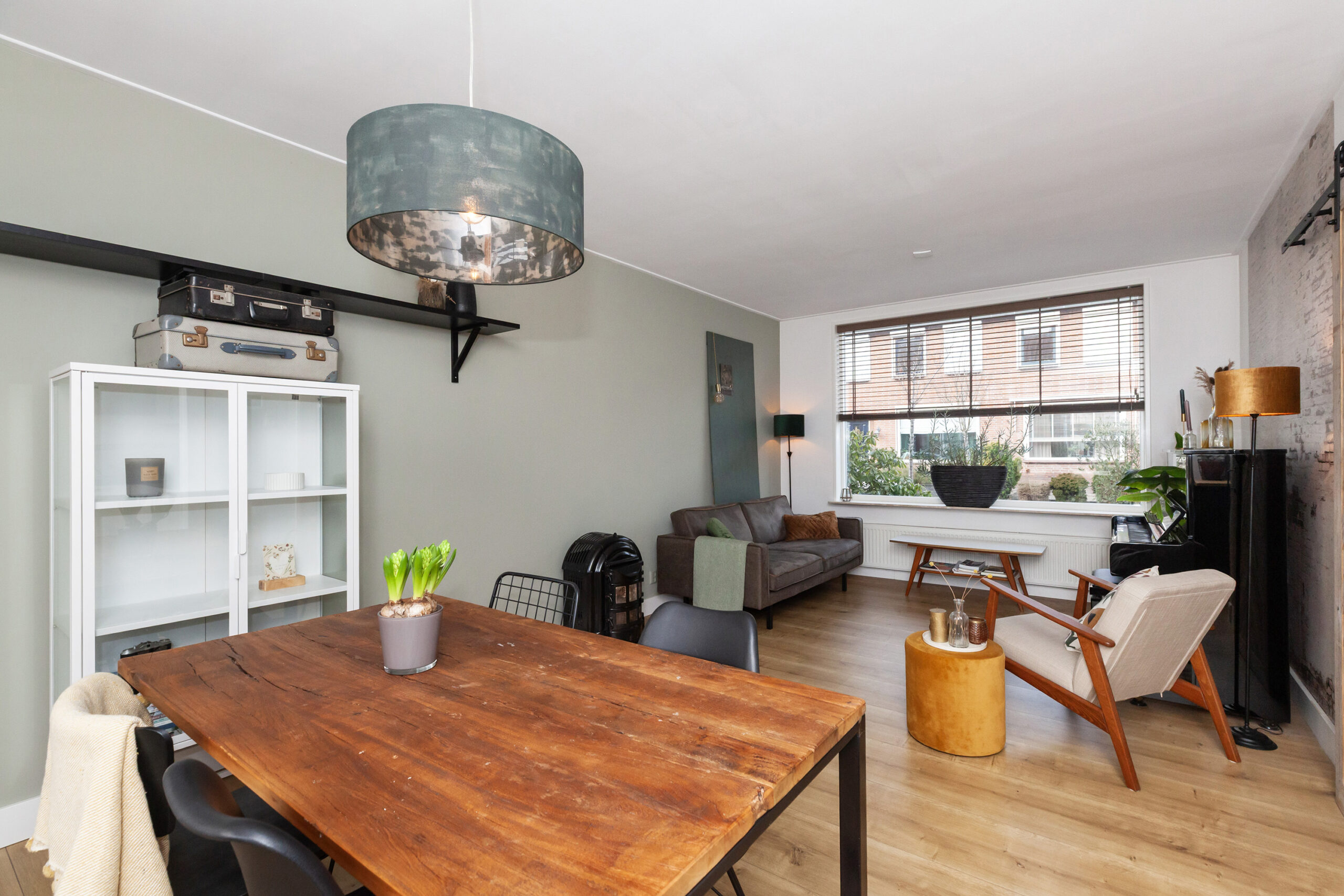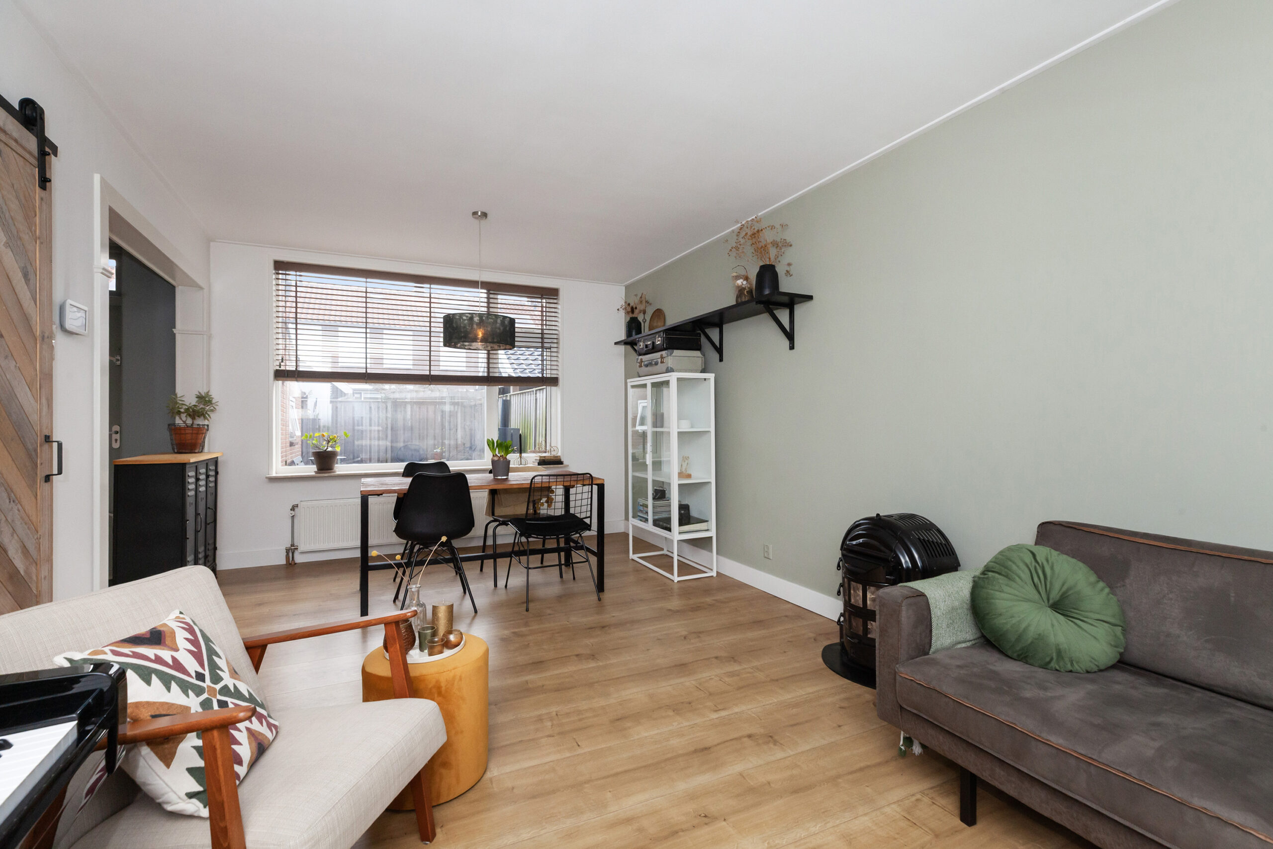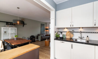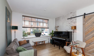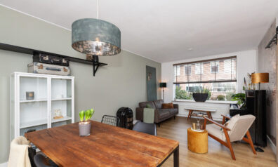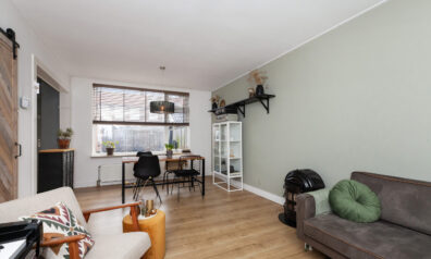 De woonkamer is een fijne doorzonkamer met aan beide zijden een groot raam, waardoor er veel daglicht binnenshuis valt. De kamer is goed in te delen met een zit- en eethoek. Aan de achterzijde staat de keuken in open verbinding.