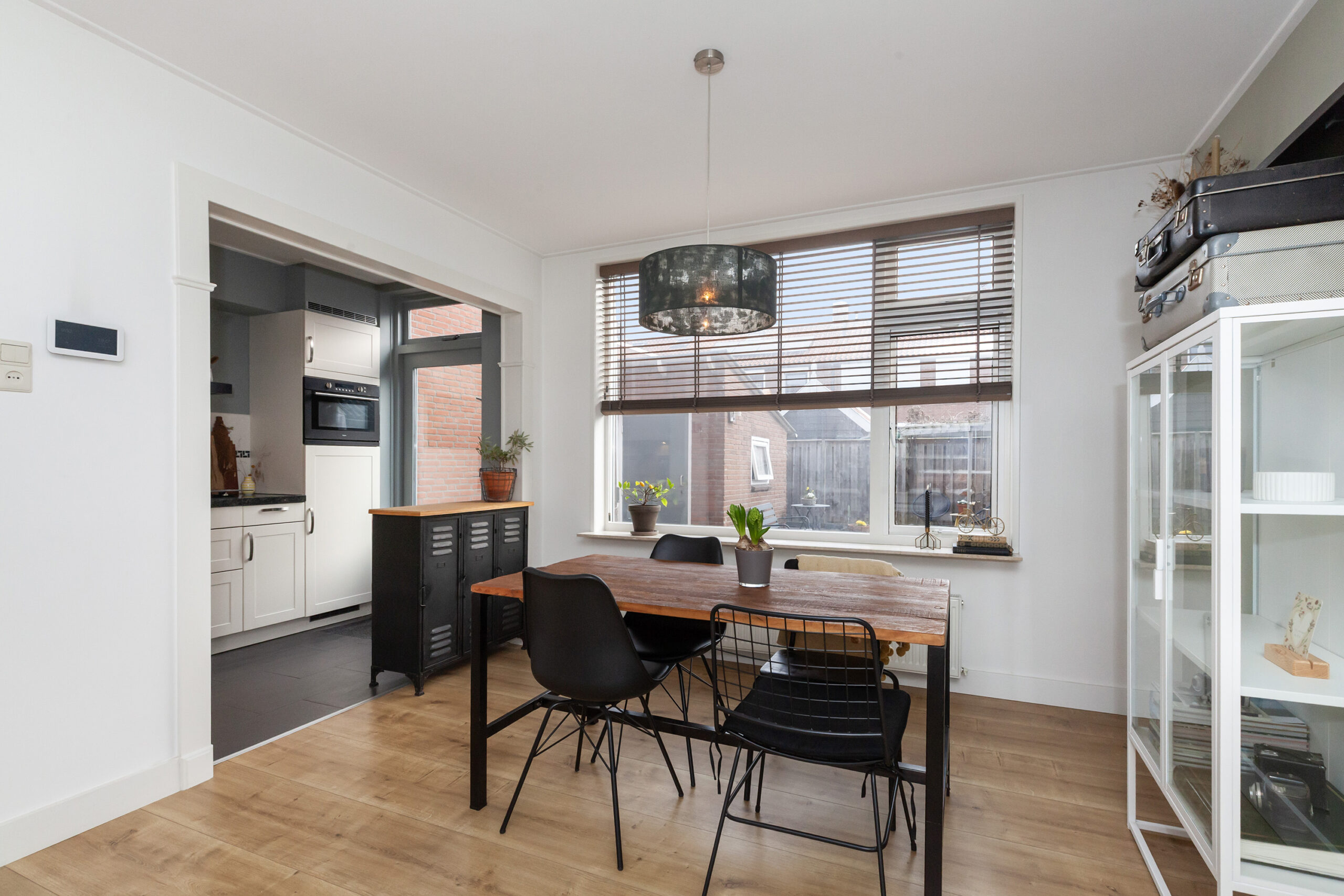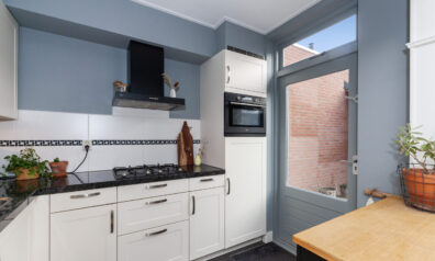 Aan de achterzijde treft u de keuken welke een hoekopstelling betreft. Aan inbouwapparatuur heeft u de beschikking over een vier-pits gaskookplaat, afzuigkap, combimagnetron, koelkast en vaatwasser. Via de achterdeur kunt u naar de tuin. Door de halfopen verbinding staat de keuken in gezellig contact met de woonkamer.