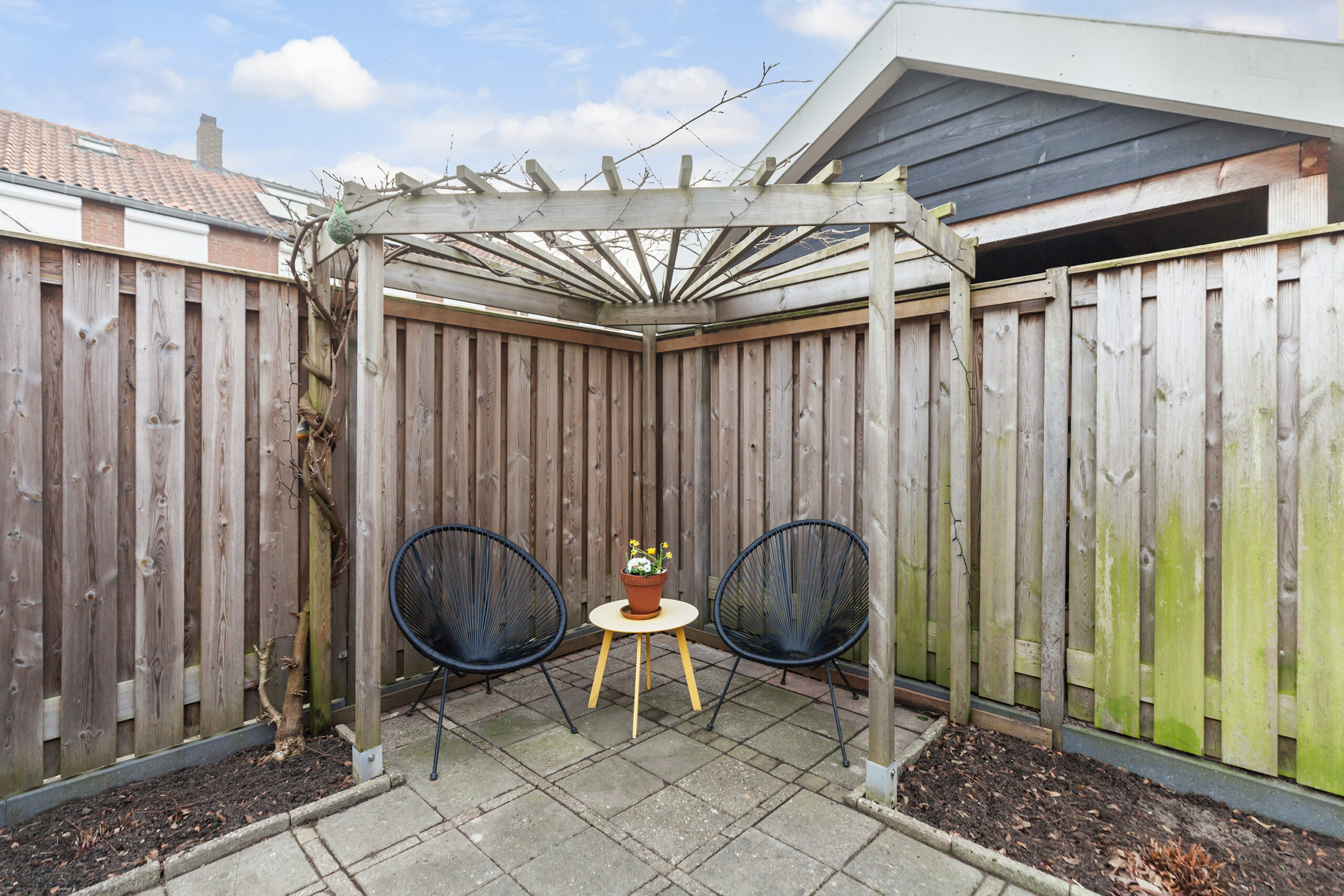 De woning is gelegen op een perceel van 122 m² met de achtertuin gesitueerd op het oosten. Door de diepte van de tuin is er nagenoeg de hele dag door wel een plekje in de zon, schaduw of uit de wind te vinden. Er staat een stenen berging van circa 2.78 x 2.19m en via de poort kunt u ook achteromkomen.