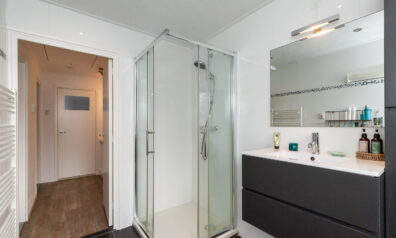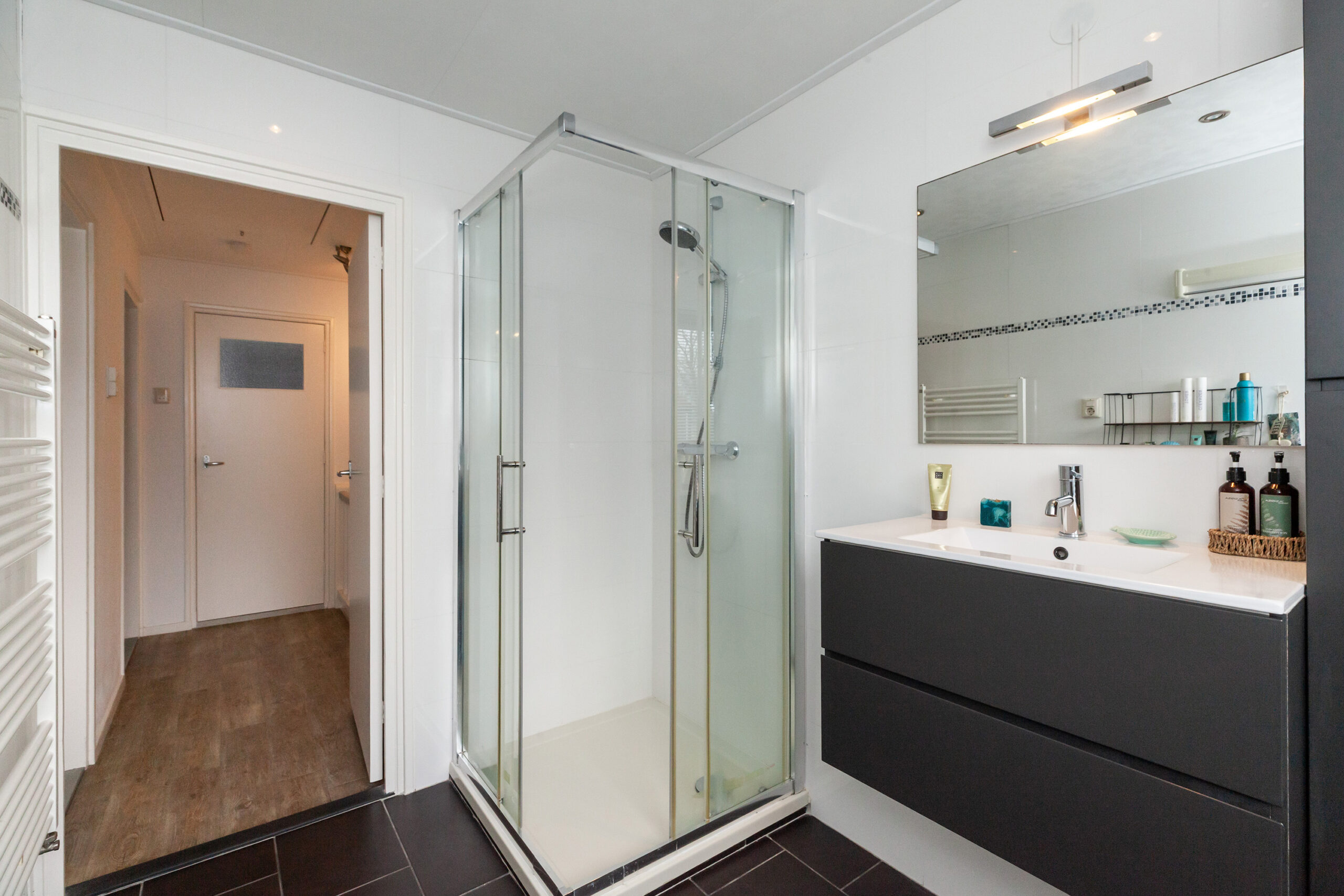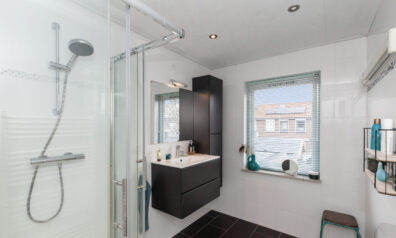 Aan de achterzijde is de badkamer te vinden waar een inloopdouche is, wastafelmeubel en een designradiator.