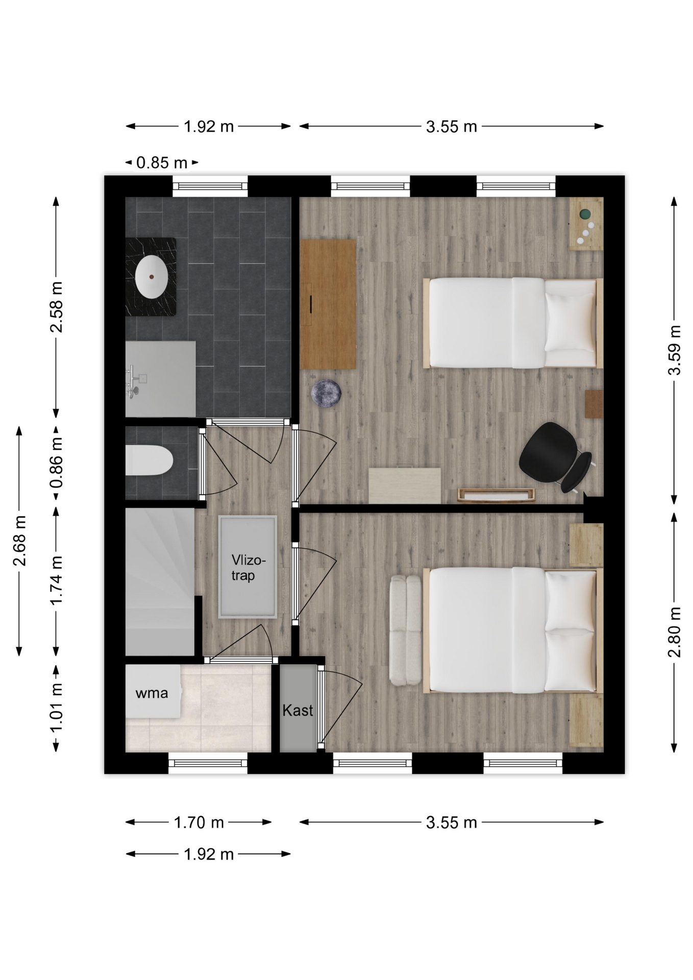 Maatvoering: Circa 2.68/ 1.74 x 1.92m