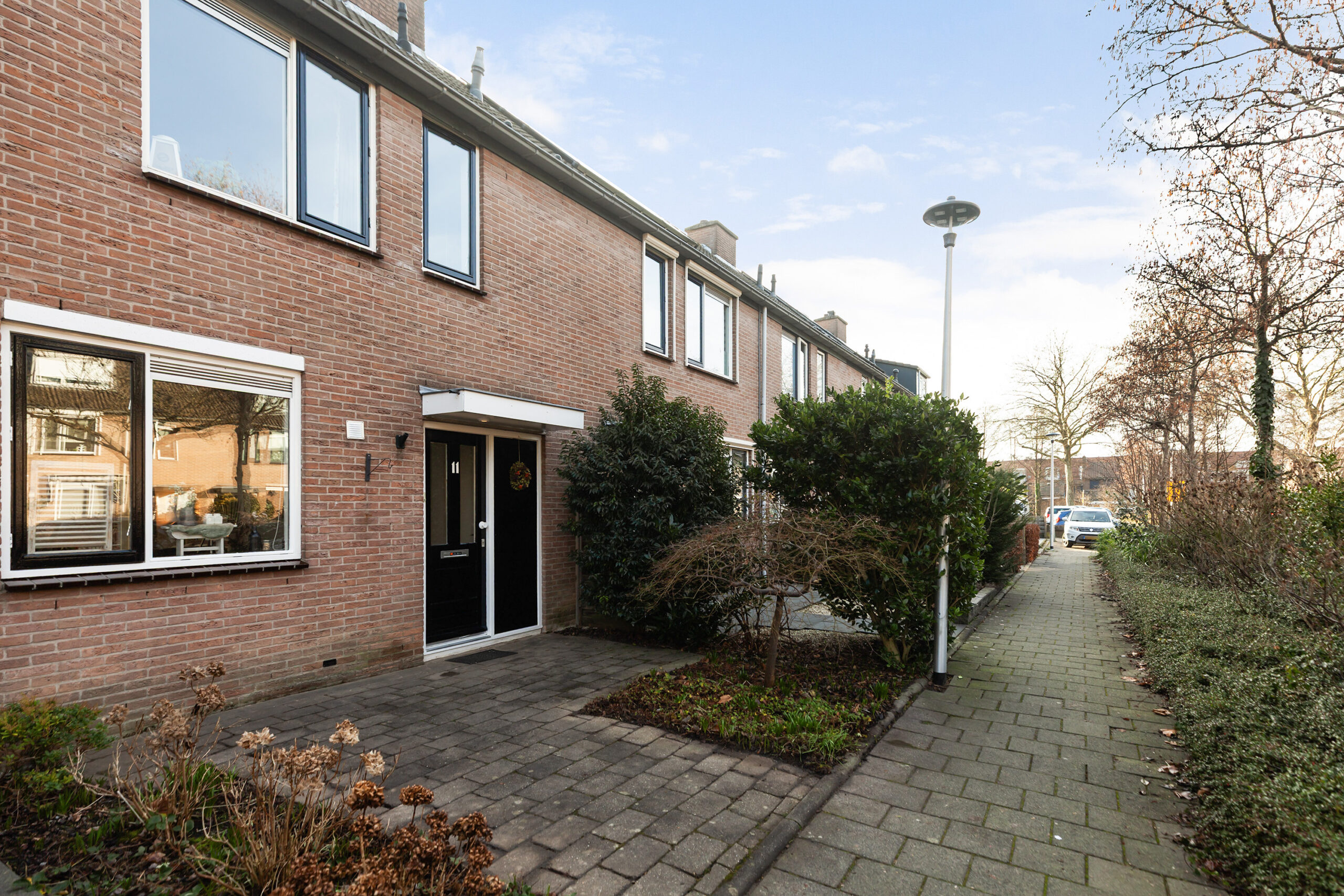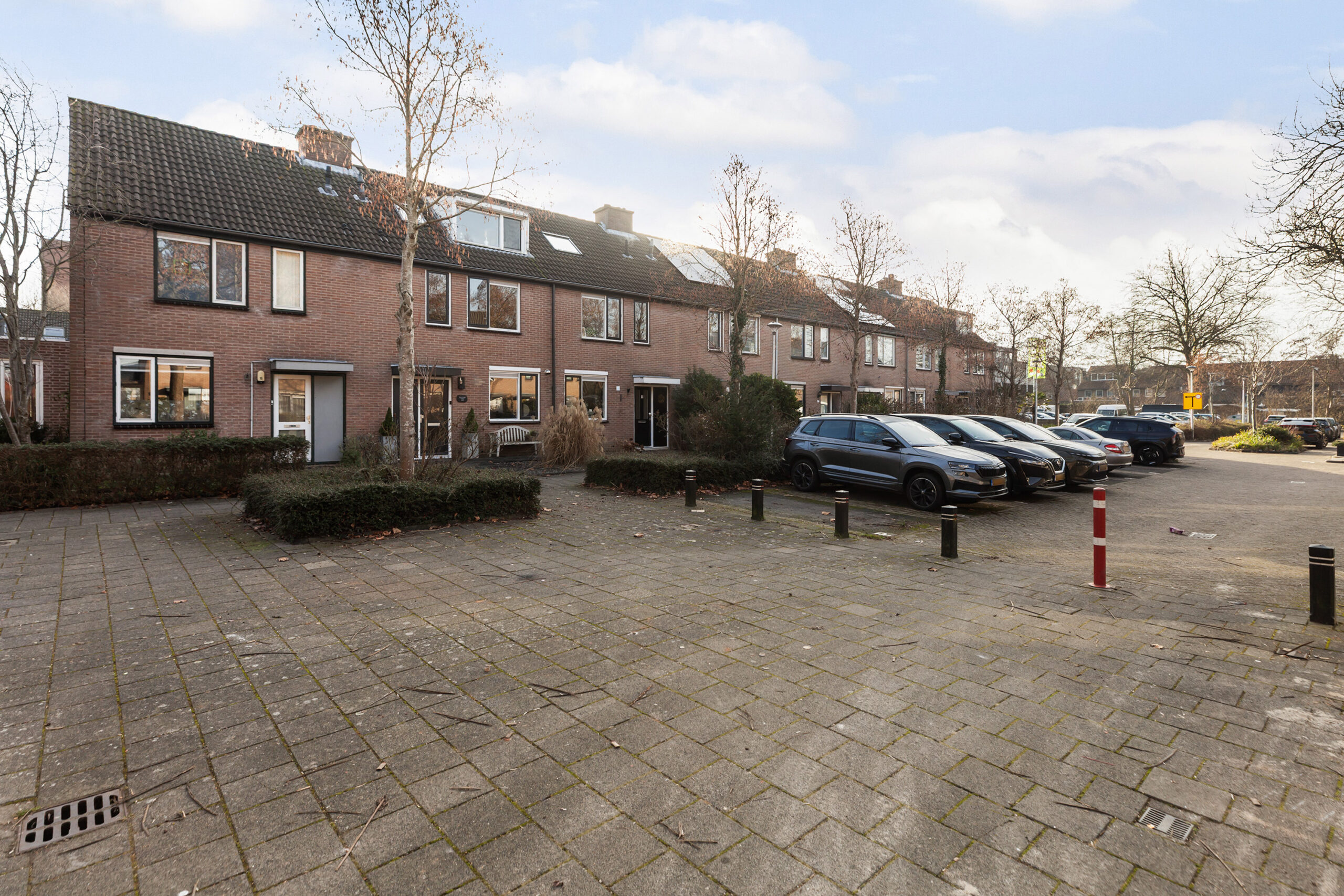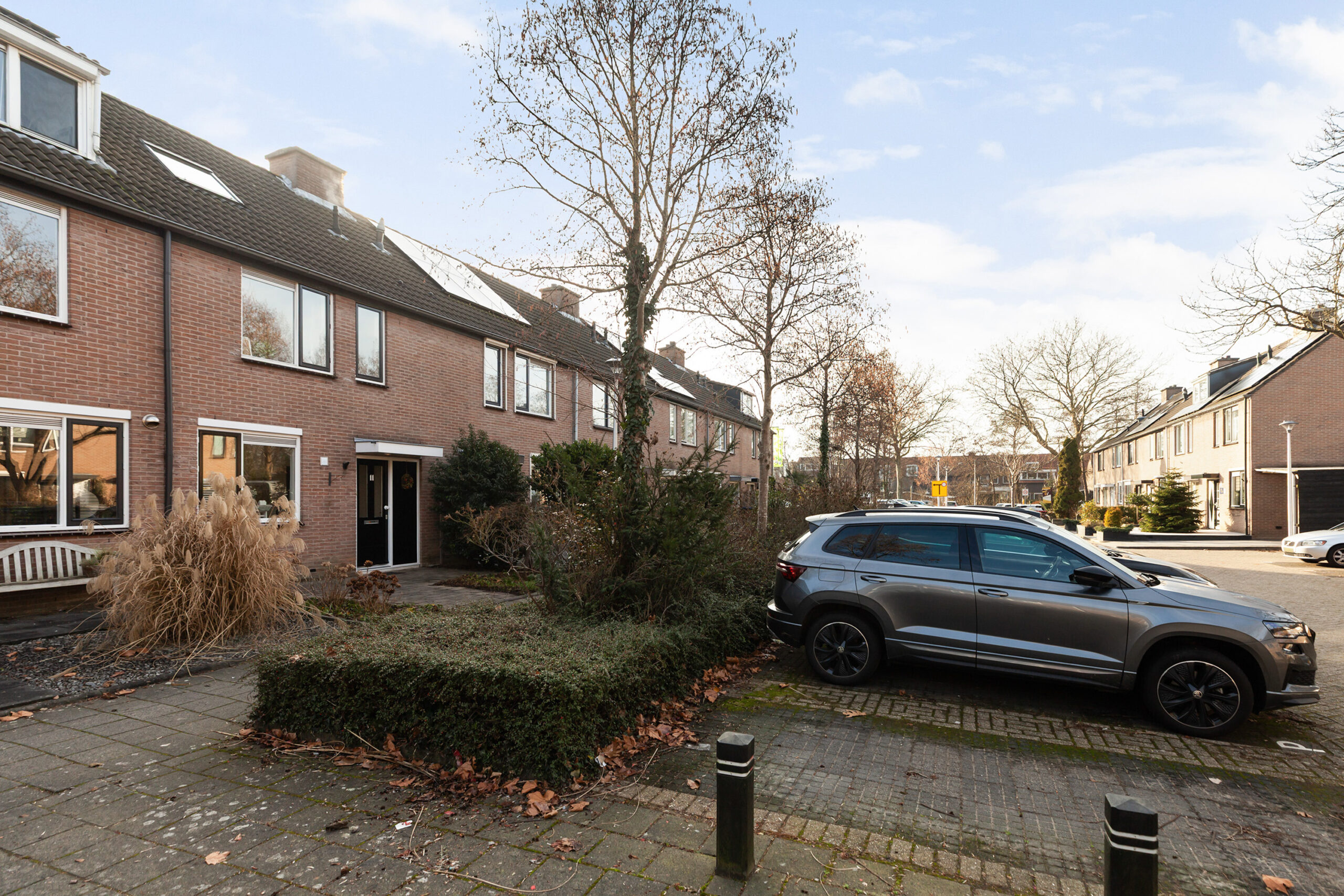 Zoals gezegd kunt u direct de auto achter op eigen terrein parkeren, zo komt u gemakkelijk achterom. Maar ook aan de voorzijde is er volop parkeergelegenheid. Achter de groenstrook bevindt zich de woning. Gaat u mee naar binnen?