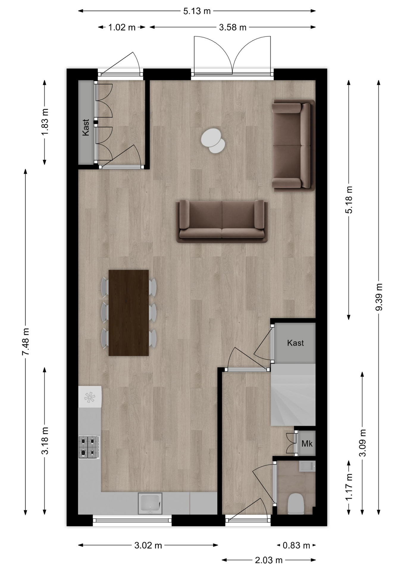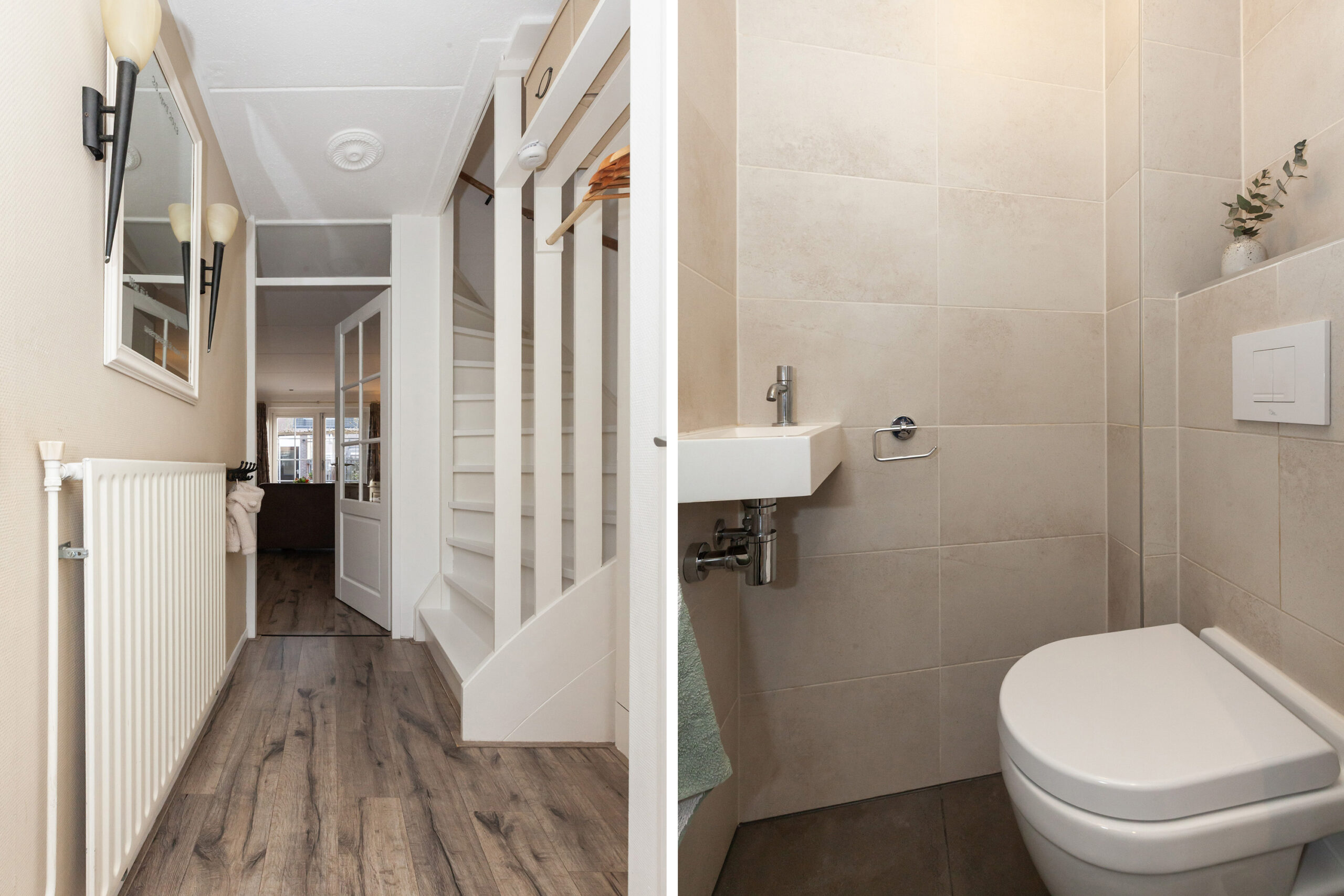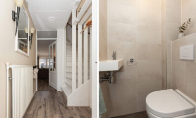 In de ontvangstruimte heeft u de toiletruimte, meterkast, trap naar de verdieping en toegang tot de woonkamer.