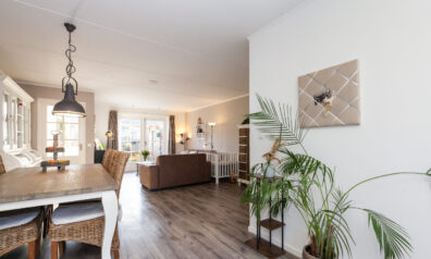 De speelse indeling maakt het tot een gezellige huiselijke kamer met openslaande deuren naar de tuin. Onder de trap is een inloopkast waar u allerhande proviand kunt opbergen en via het achterportaal kunt u naar de achtertuin. Aan de voorzijde vloeit de kamer over in de keuken.
