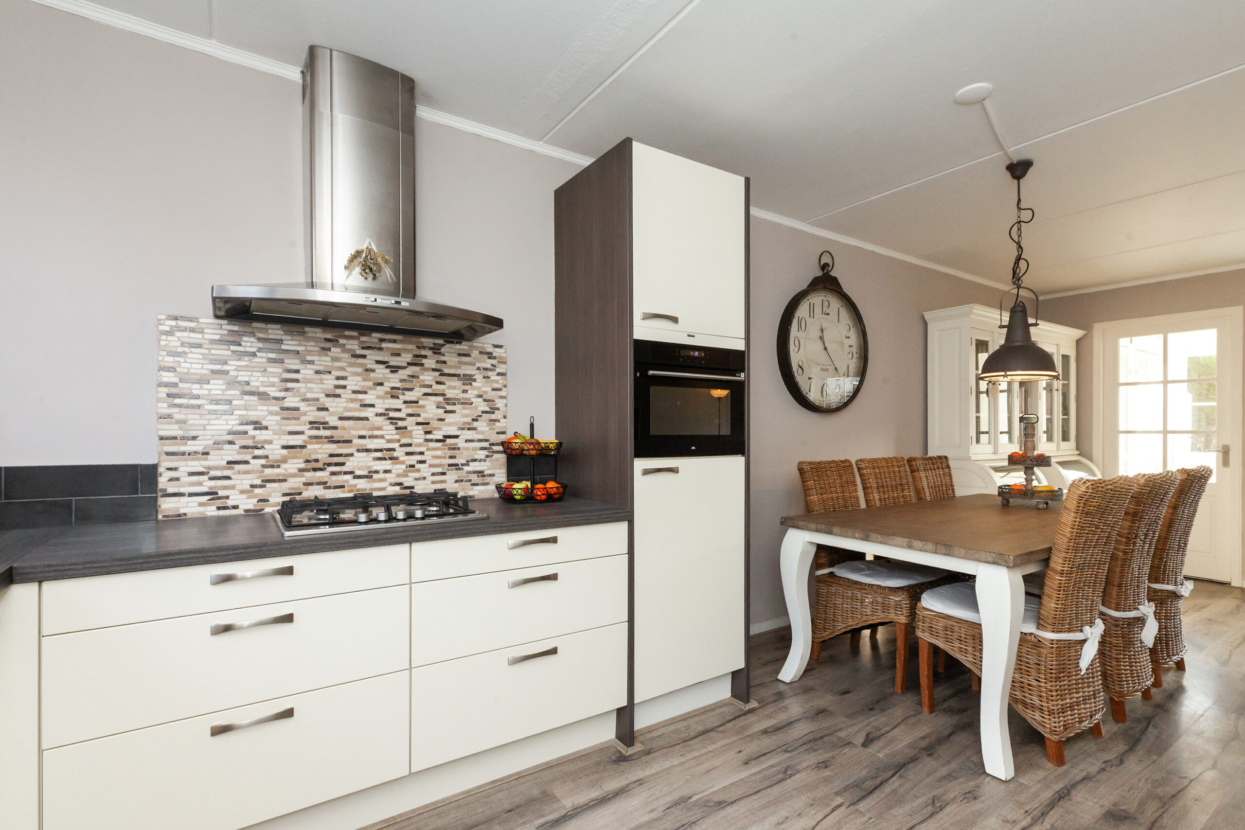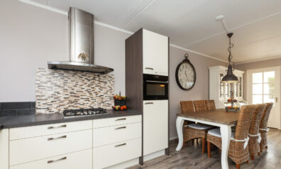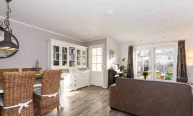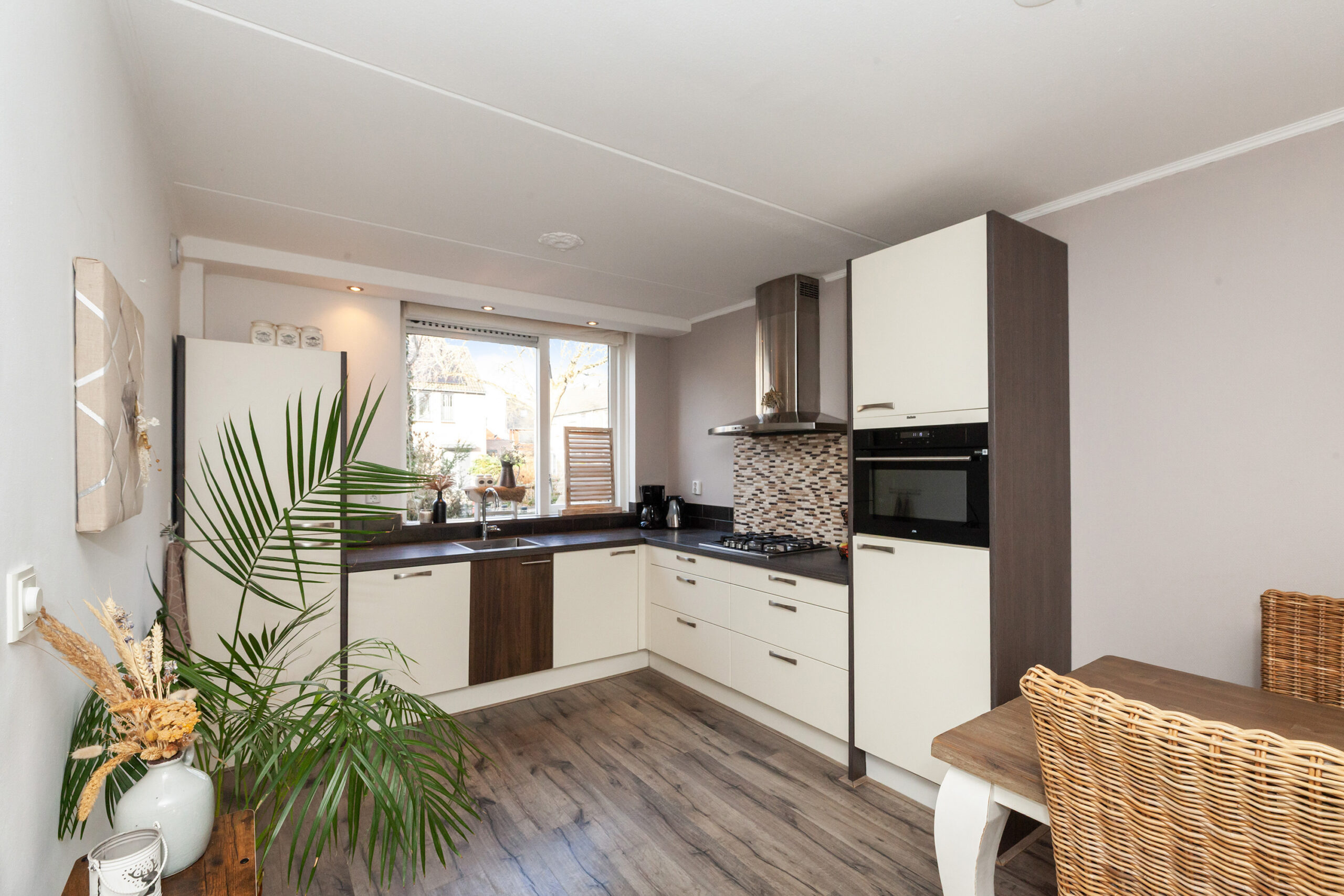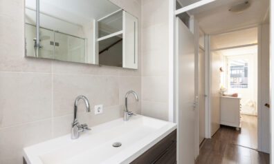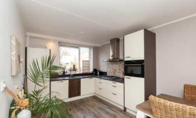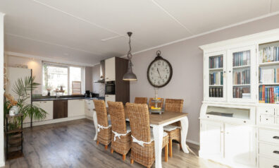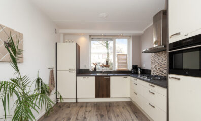 De hoekkeuken is opgesteld aan de voorzijde en geeft leuk zicht over de voorgelegen straat, maar staat tevens in open verbinding met de woonkamer. Aan inbouwapparatuur heeft u de beschikking over een 4-pits gaskookplaat, afzuigkap, combimagnetron, koelkast en vaatwasser.