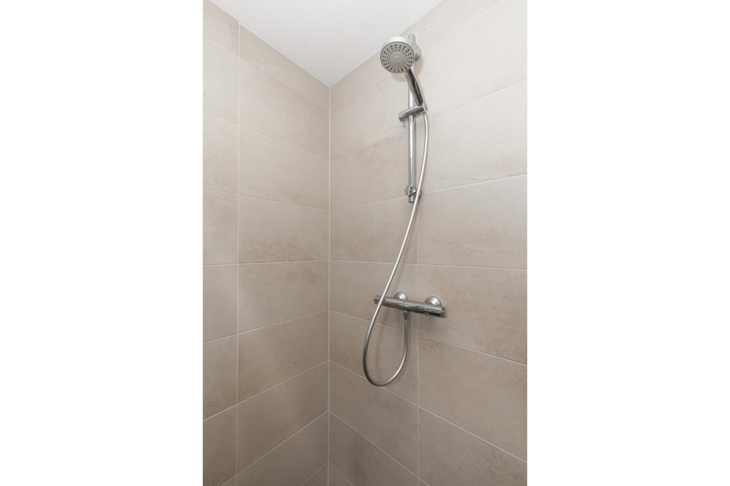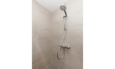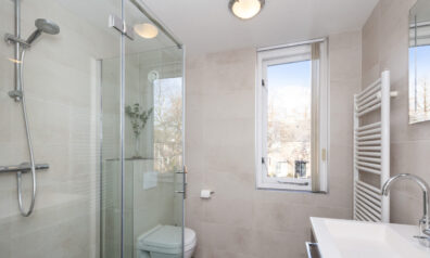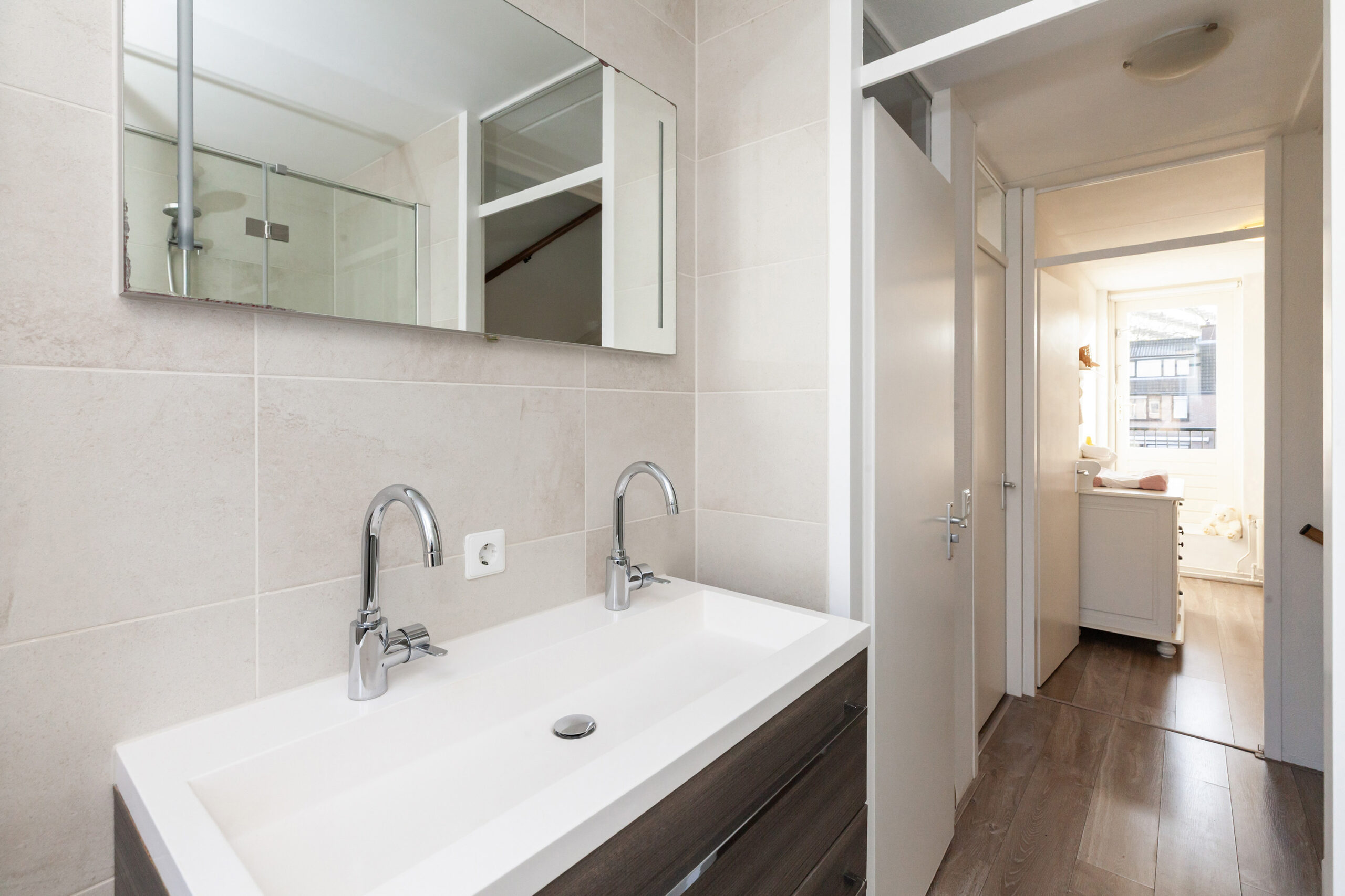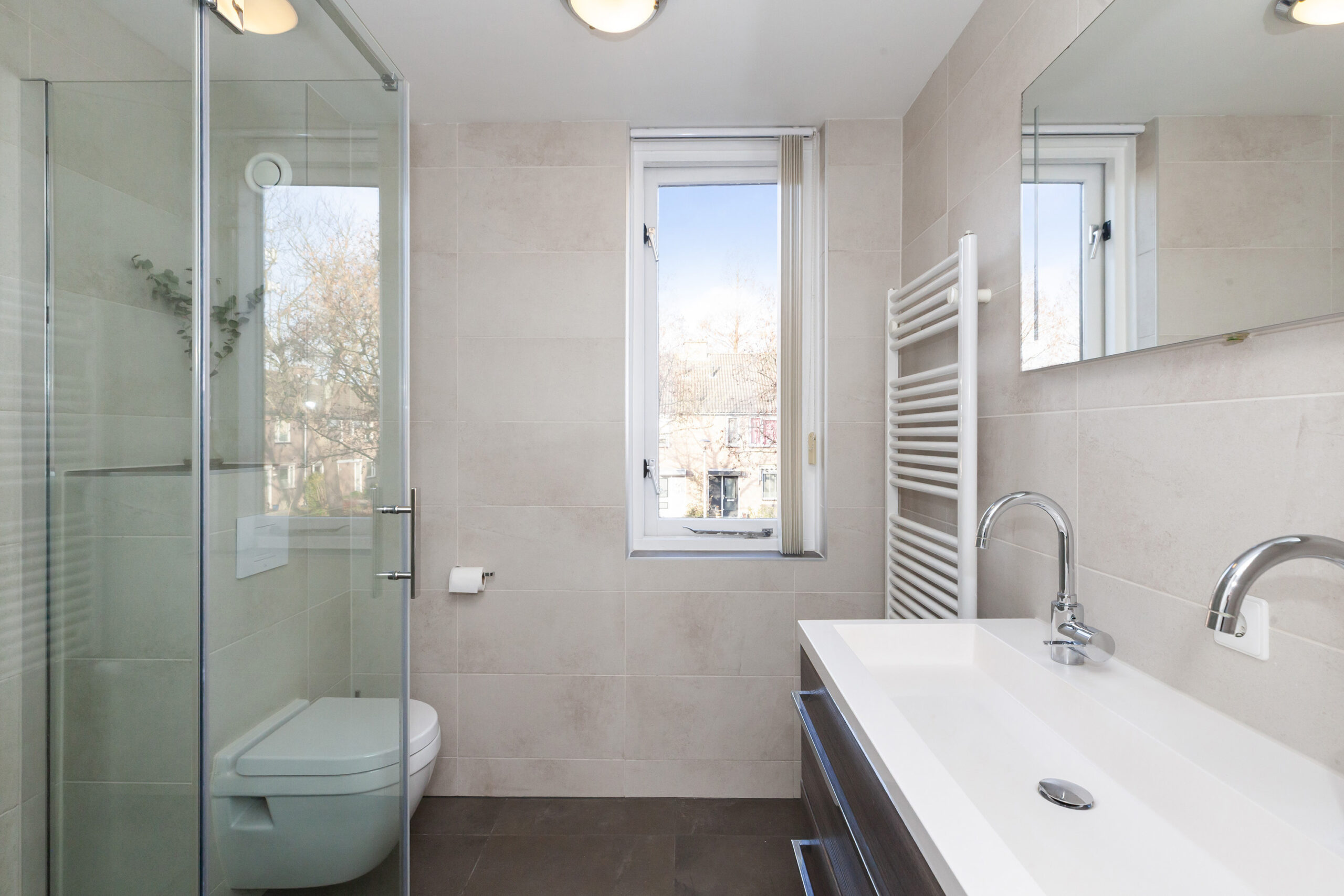 De badkamer is uitgevoerd in een nette kleurstelling en voorzien van een ruime inloopdouche, wastafelmeubel met dubbele kraan, designradiator en toilet.