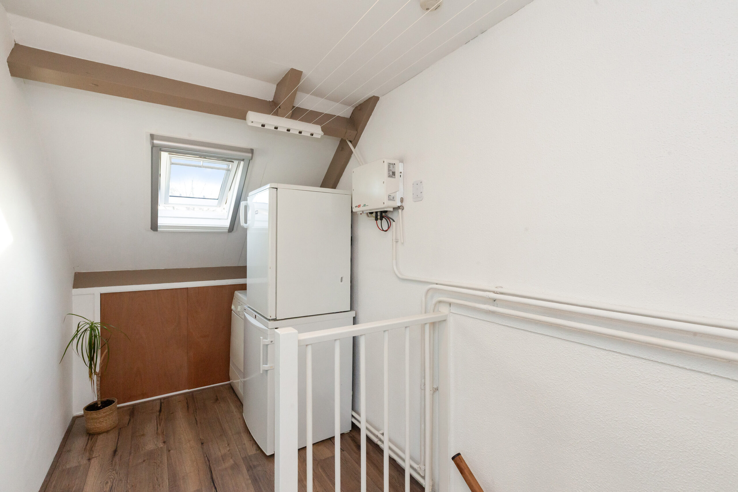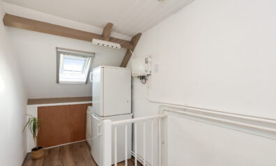 Op de overloop heeft u onder het schuine dak opbergruimte. Verder heeft u hier ook de aansluitingen voor uw wasapparatuur en de opstelling van de C.V.-ketel.