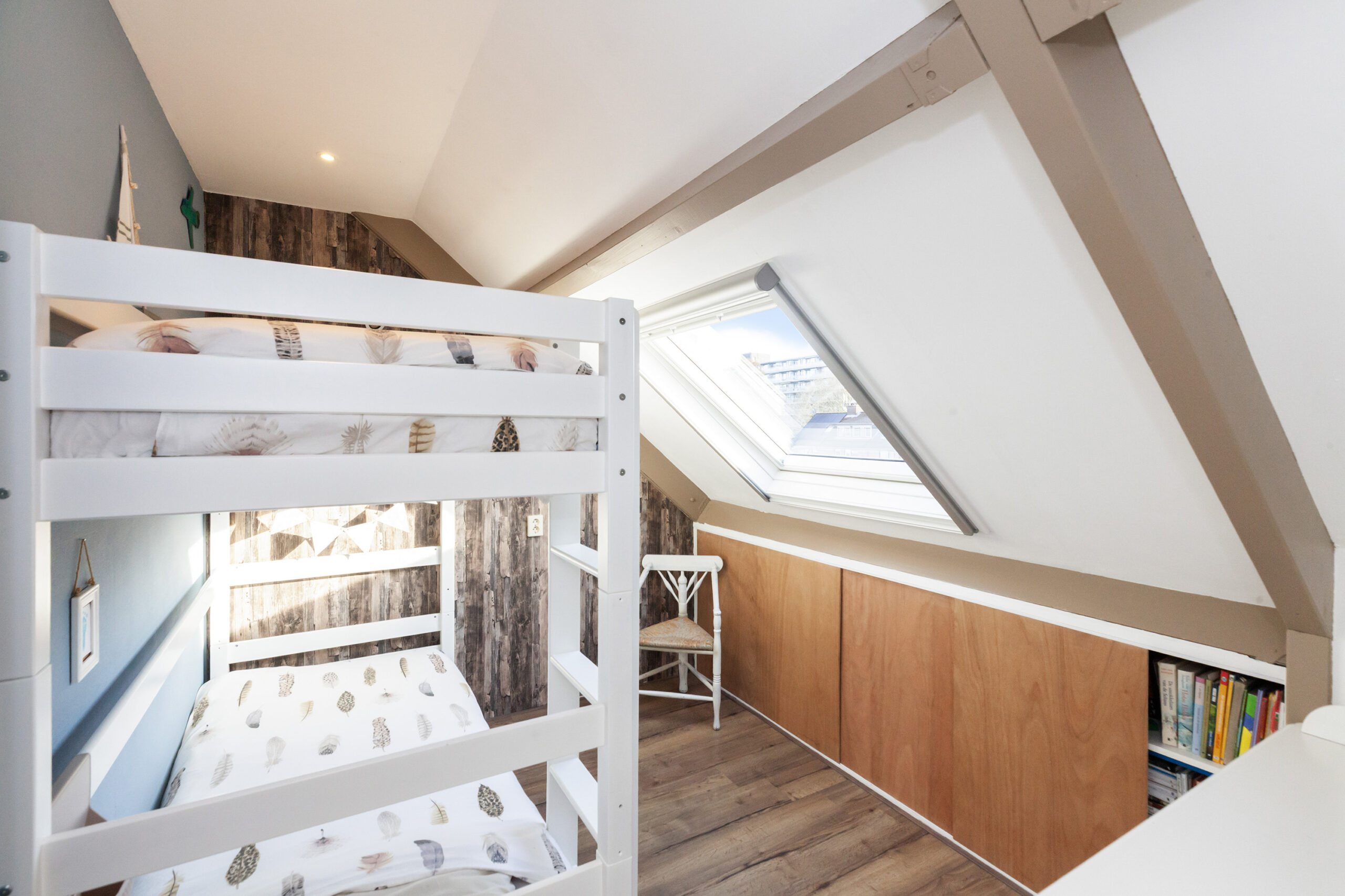 De twee slaapkamers zijn nagenoeg identiek en voorzien van bergruimte onder het schuine dak en een tuimelraam.