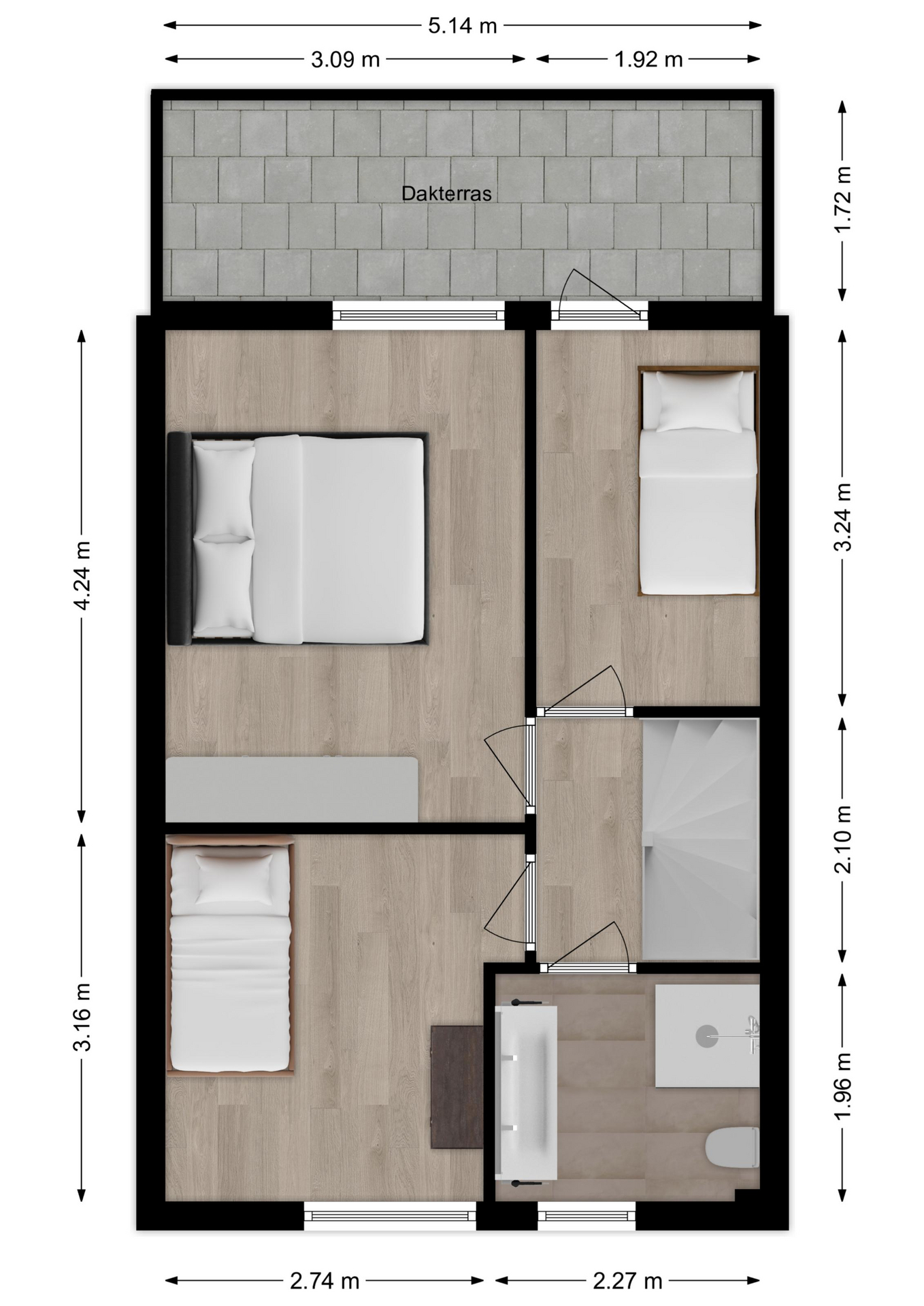 Eveneens aan de achterzijde treft u deze slaapkamer en deze geeft toegang tot het dakterras van circa 5.14 x 1.72m.