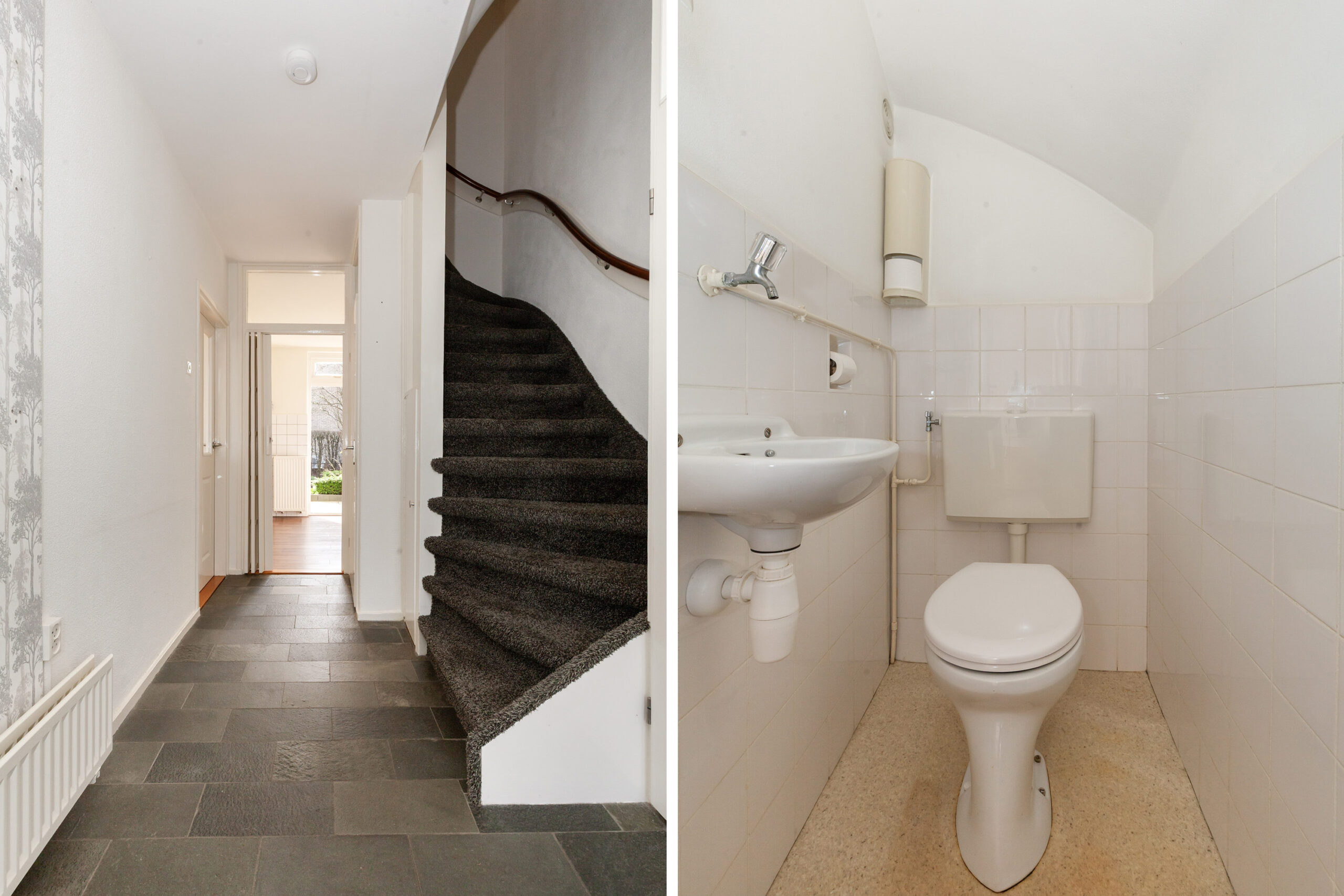 Ruime hal met meterkast, inbouwkast, trapopgang naar de verdieping, toiletruimte en toegang tot de woonkamer en keuken.