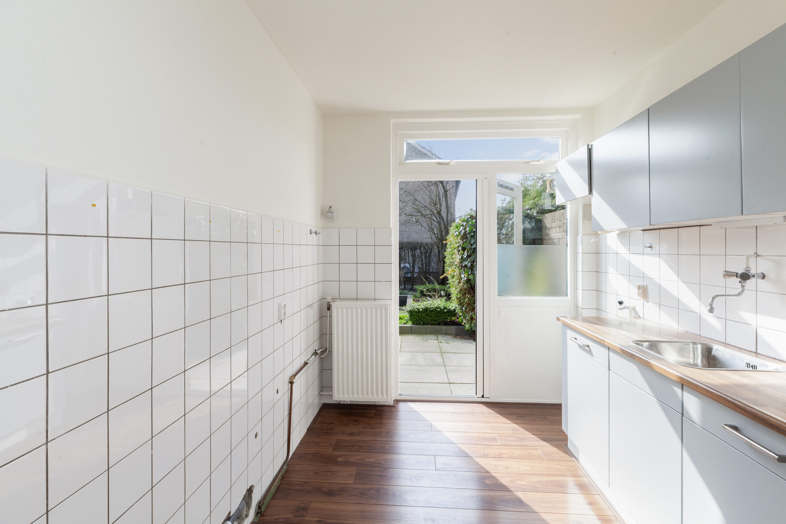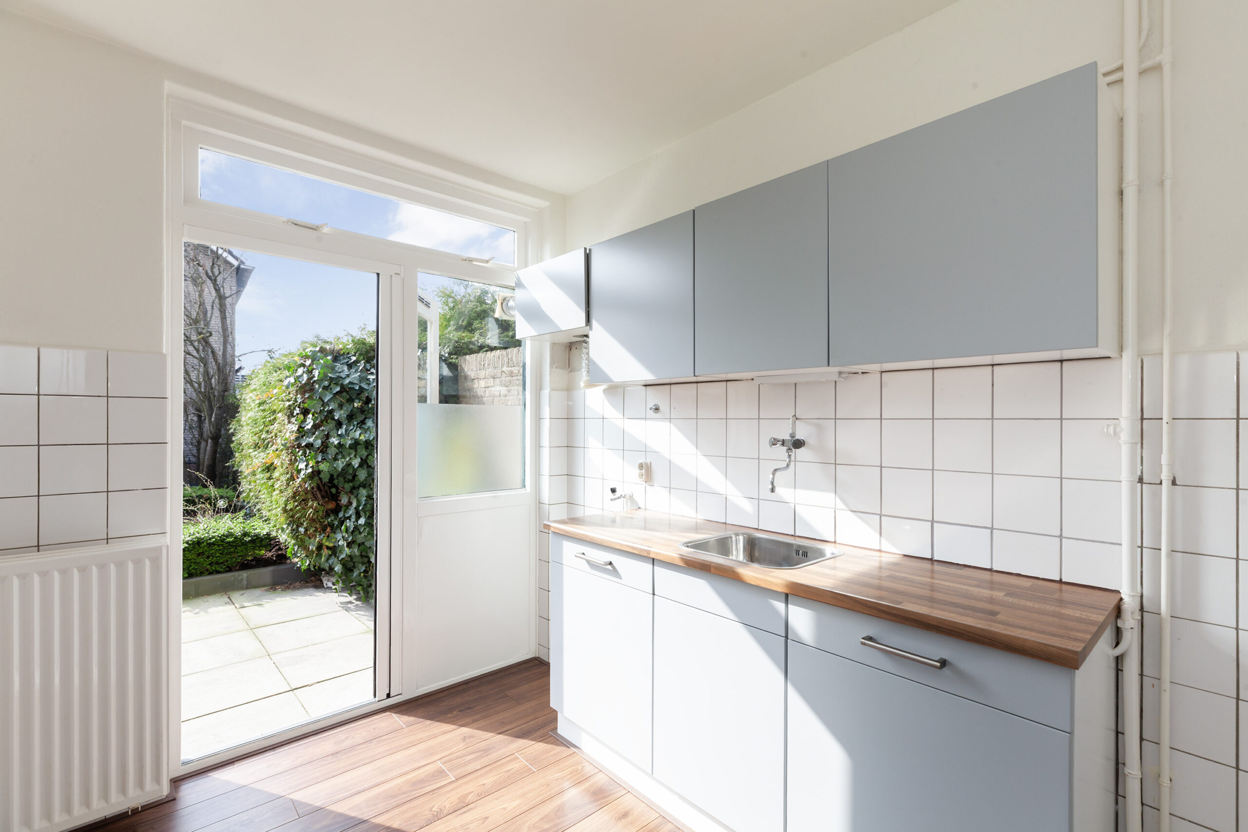 Aan de achterzijde is de keuken gesitueerd. Momenteel staat er een eenvoudig keukenblok met spoelbak. Via de achterdeur is er toegang tot de tuin.