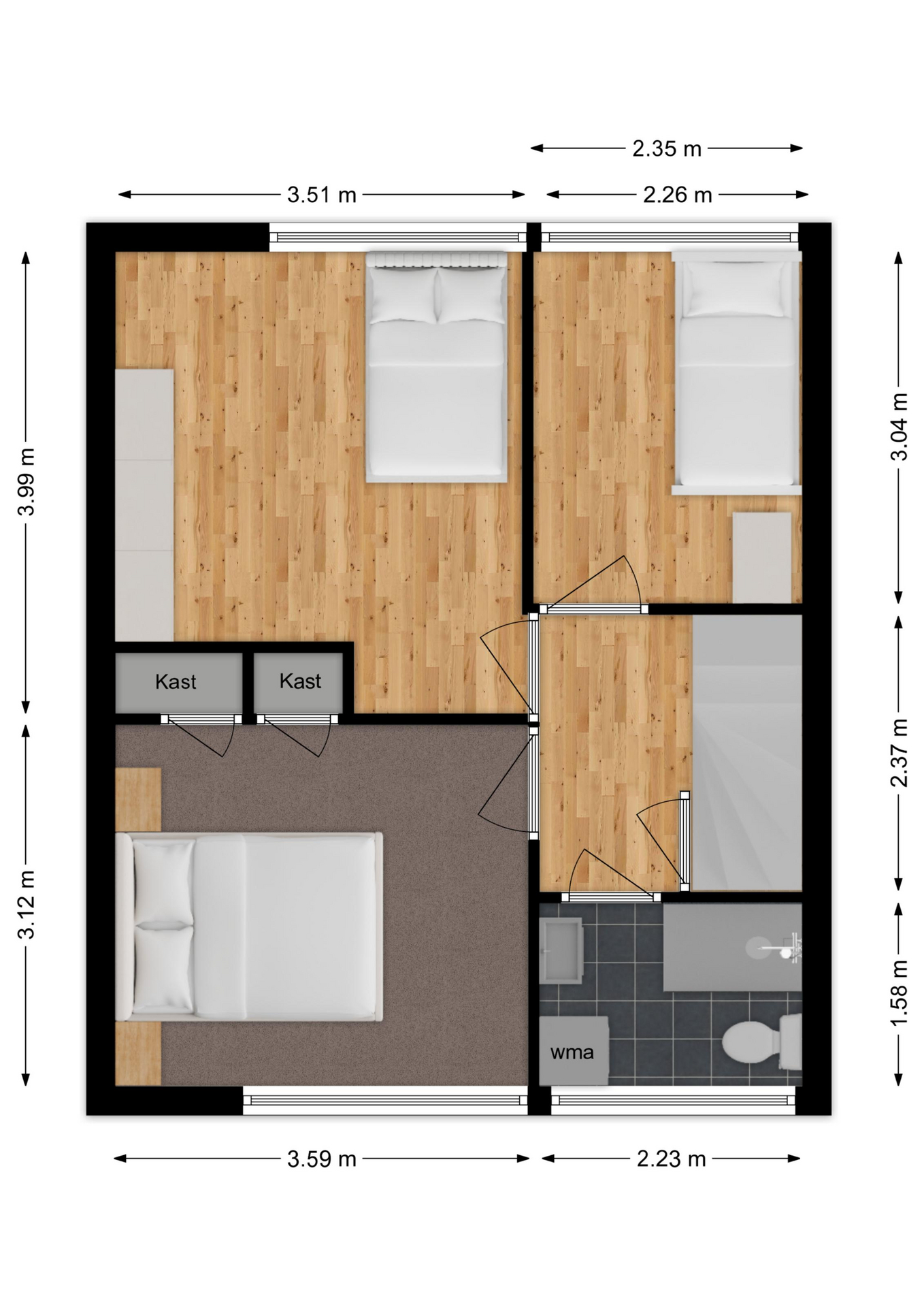 Tot slot deze derde slaapkamer. Deze treft u aan de voorzijde en is voorzien van een tweetal inbouwkasten.