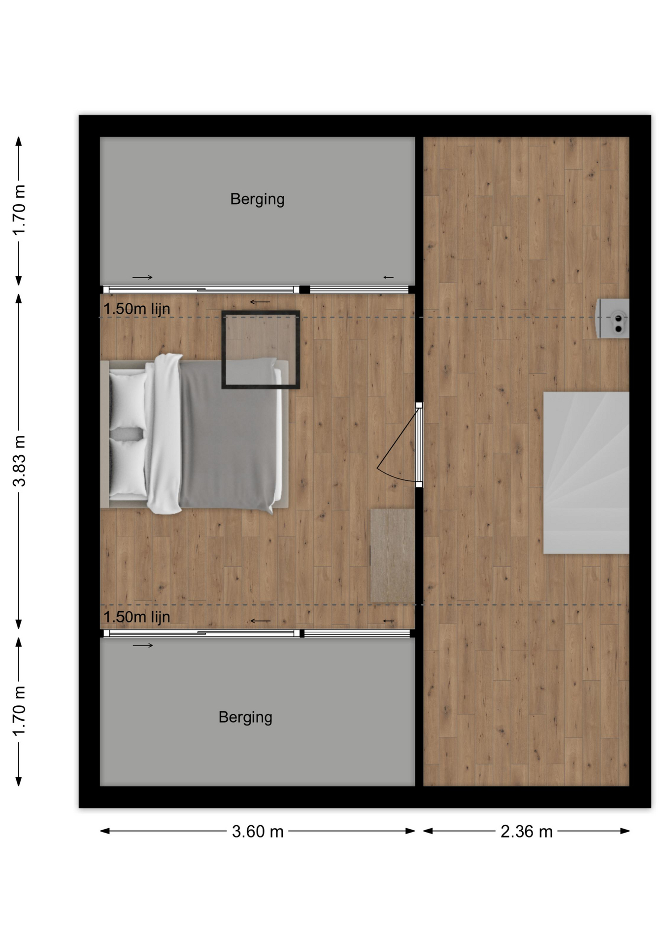 In deze slaapkamer is er aan beide zijden bergruimte achter de knieschotten. Verder is er een groot tuimelraam.