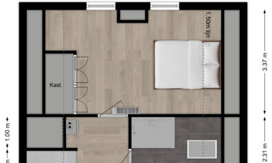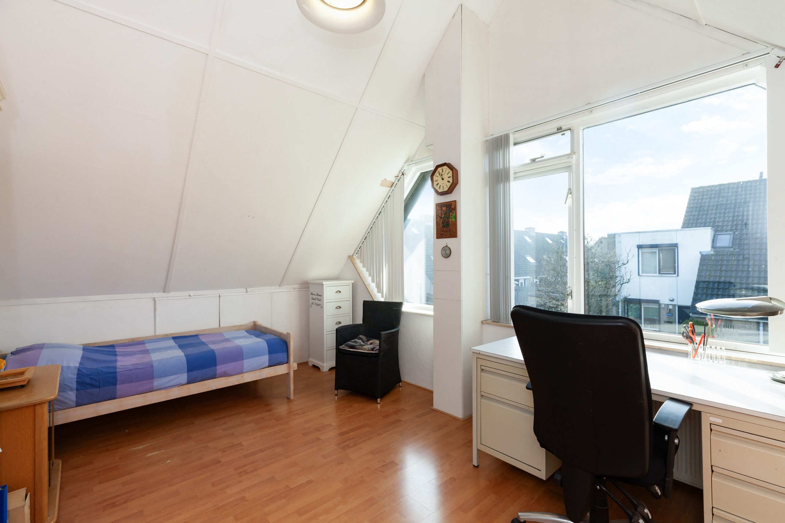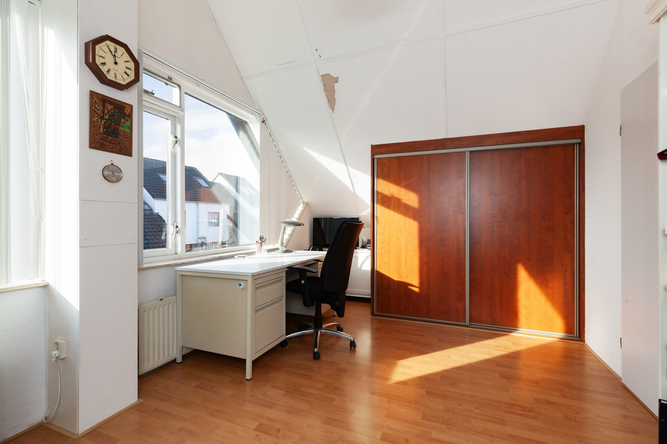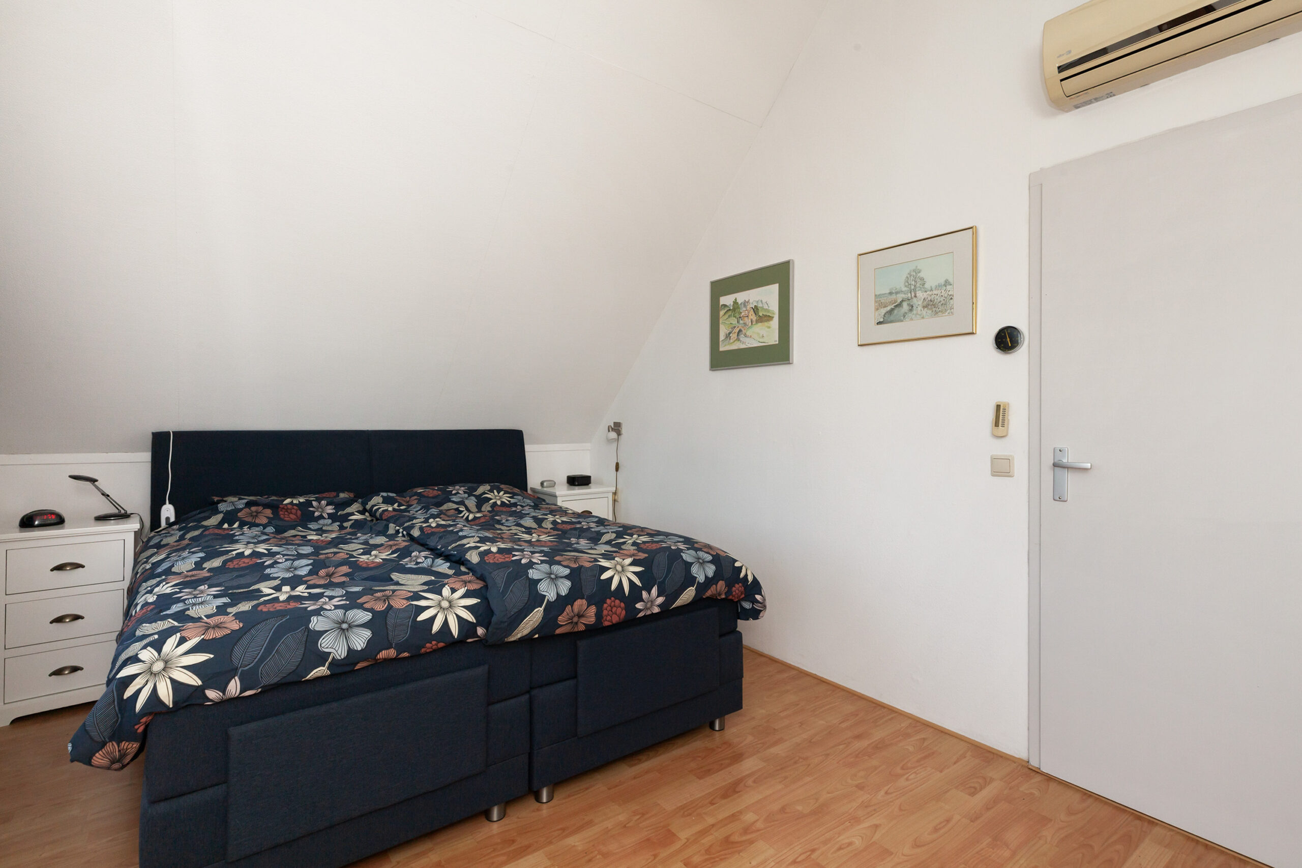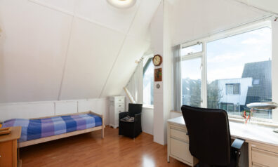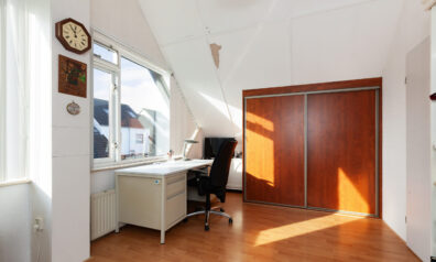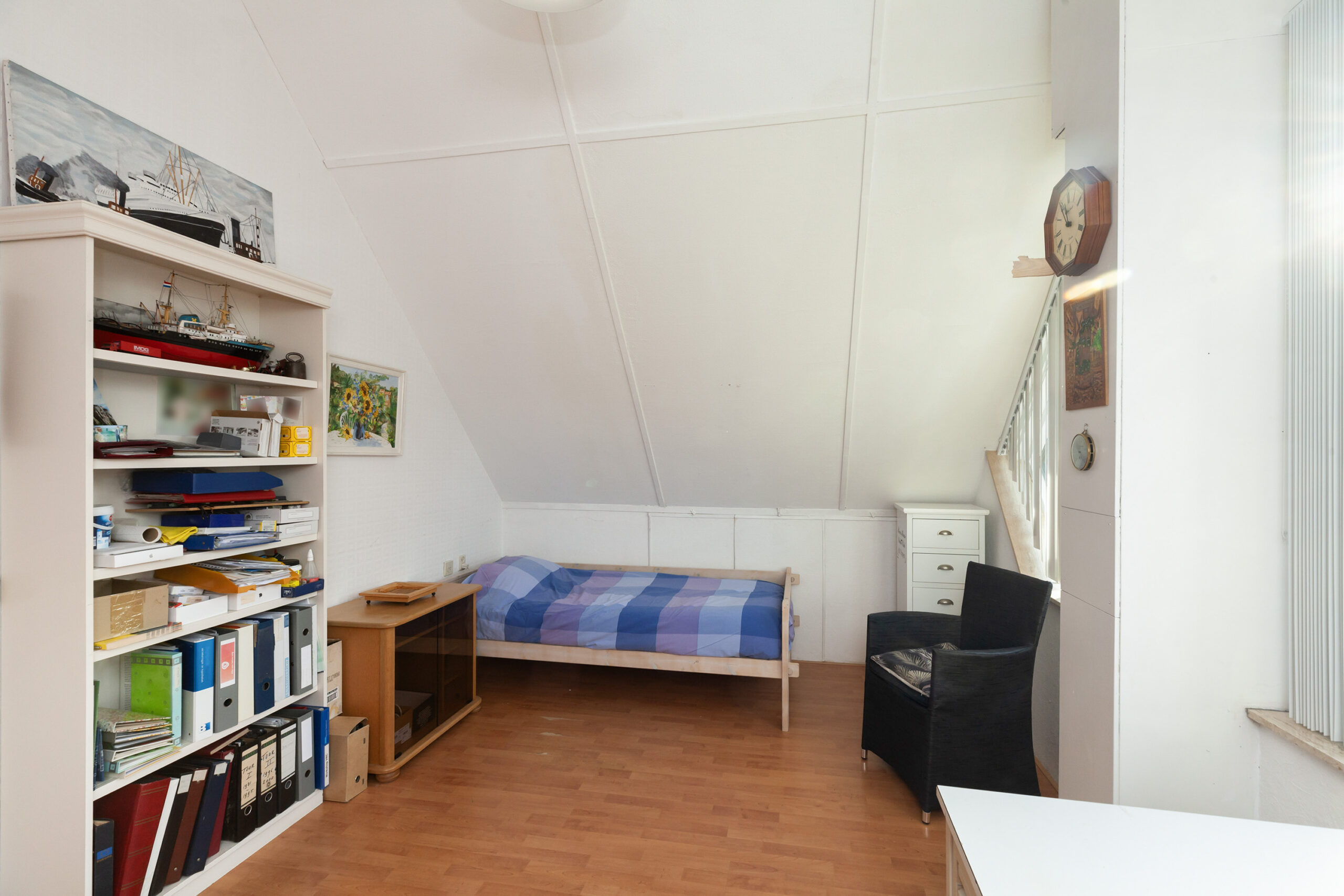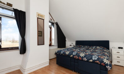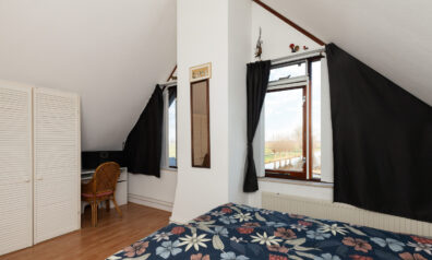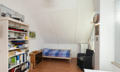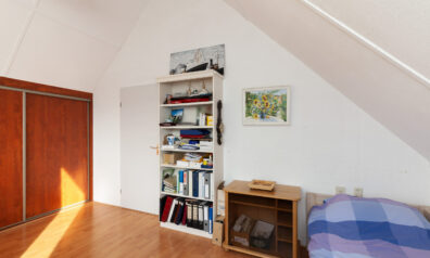 Deze slaapkamer is dan aan de voorzijde gesitueerd en onder het schuine dak is er bergruimte. Tevens is er ook een grote vaste kast.