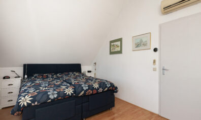 De twee slaapkamers op deze verdieping zijn nagenoeg identiek qua maatvoering en deze kamer is aan de achterzijde gesitueerd. Boven de deur hangt een airco en verder zijn er grote vaste kasten.