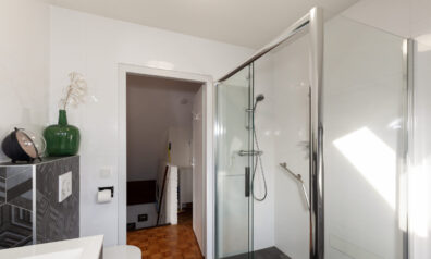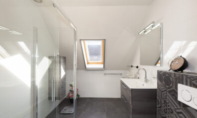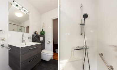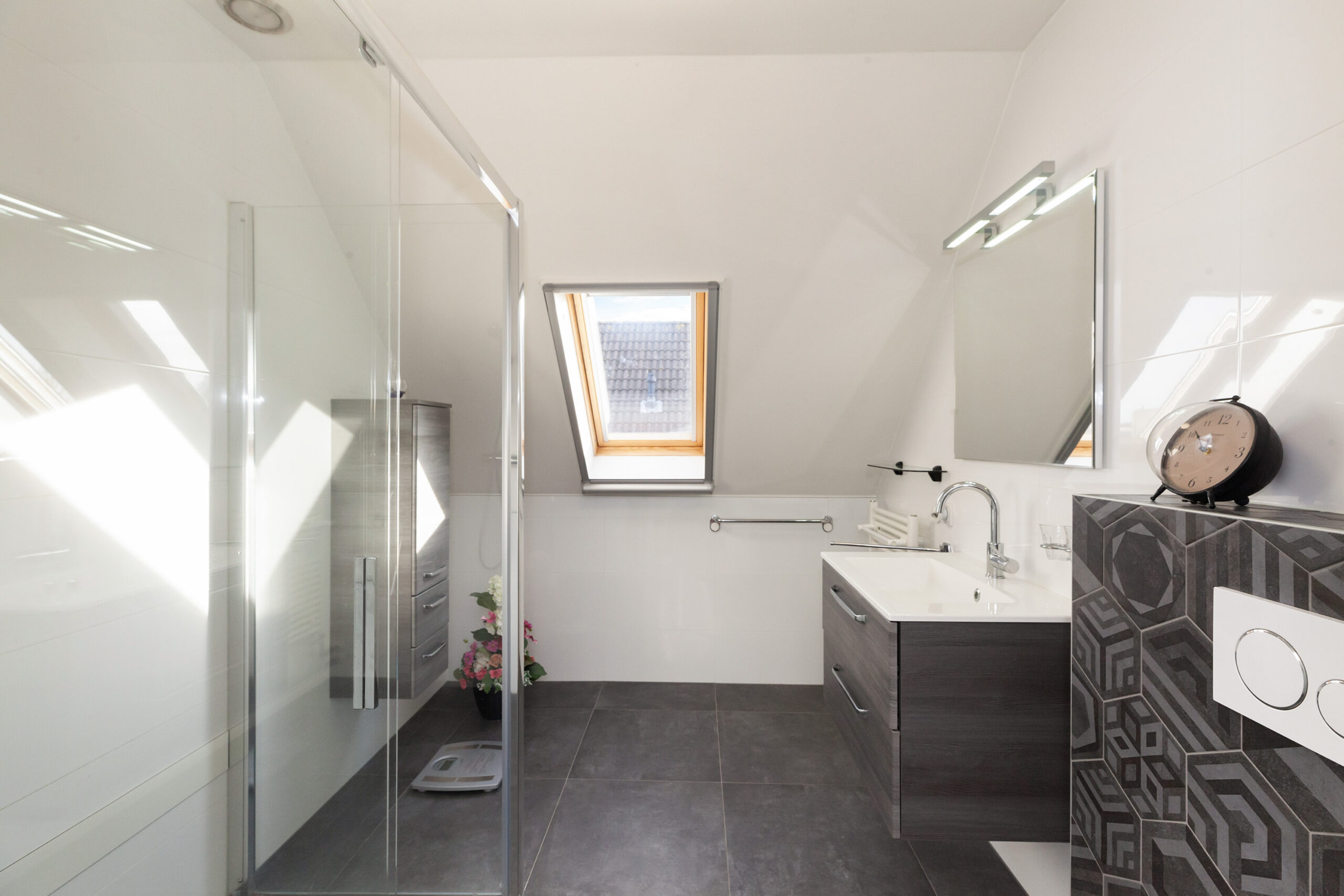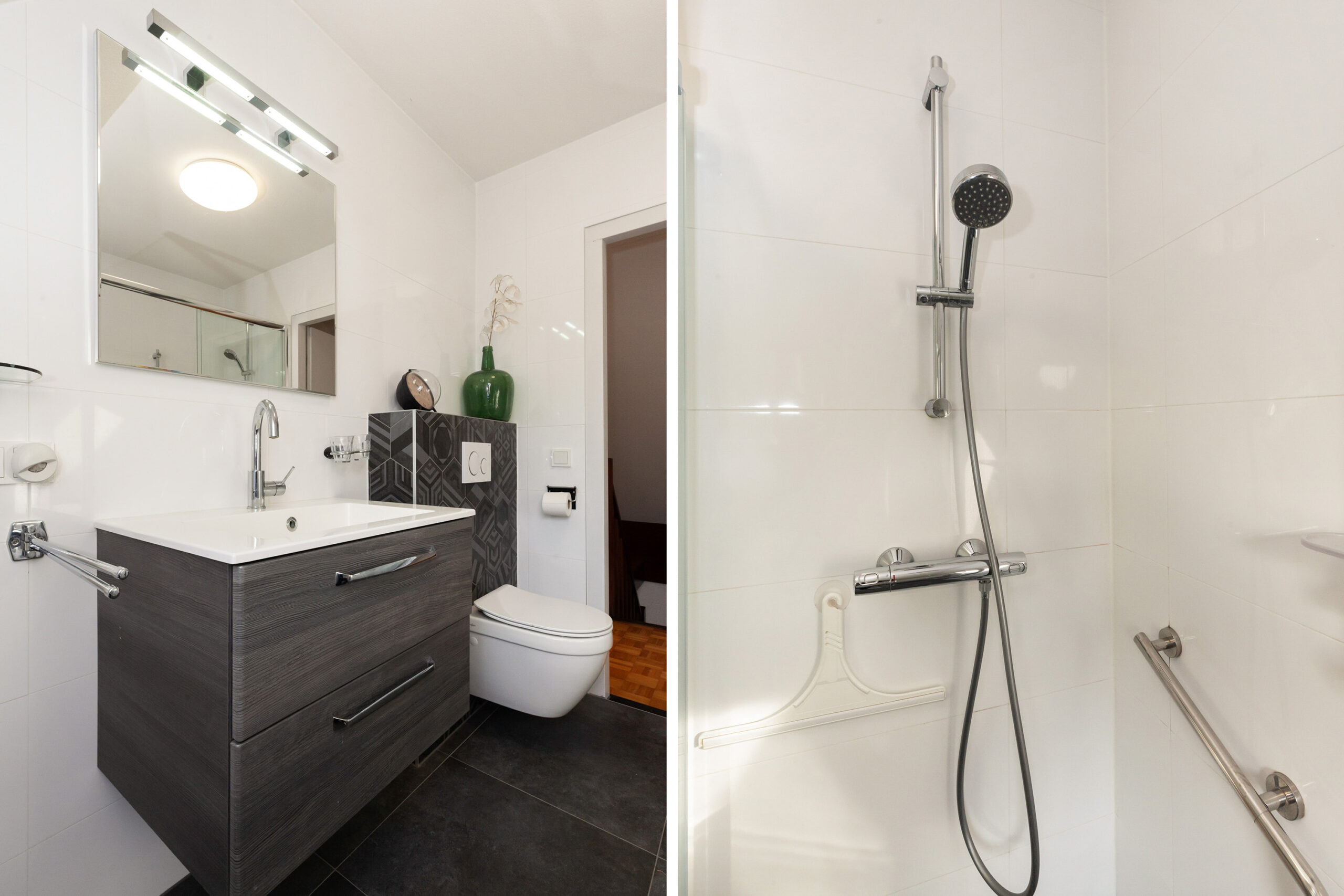 De badkamer is keurig netjes onderhouden en uitgevoerd in een lichte kleurstelling. Er is een ruime inloopdouche, wastafelmeubel, designradiator en een vrijhangend toilet.