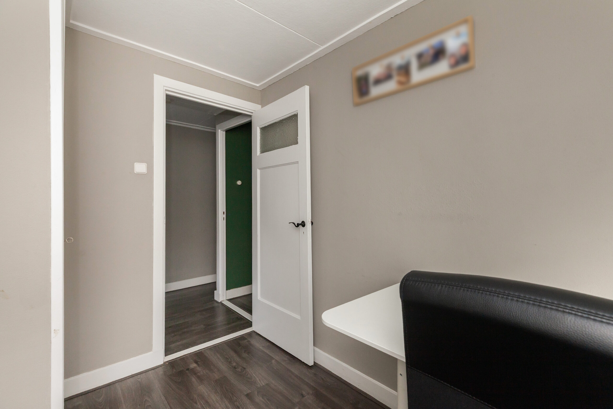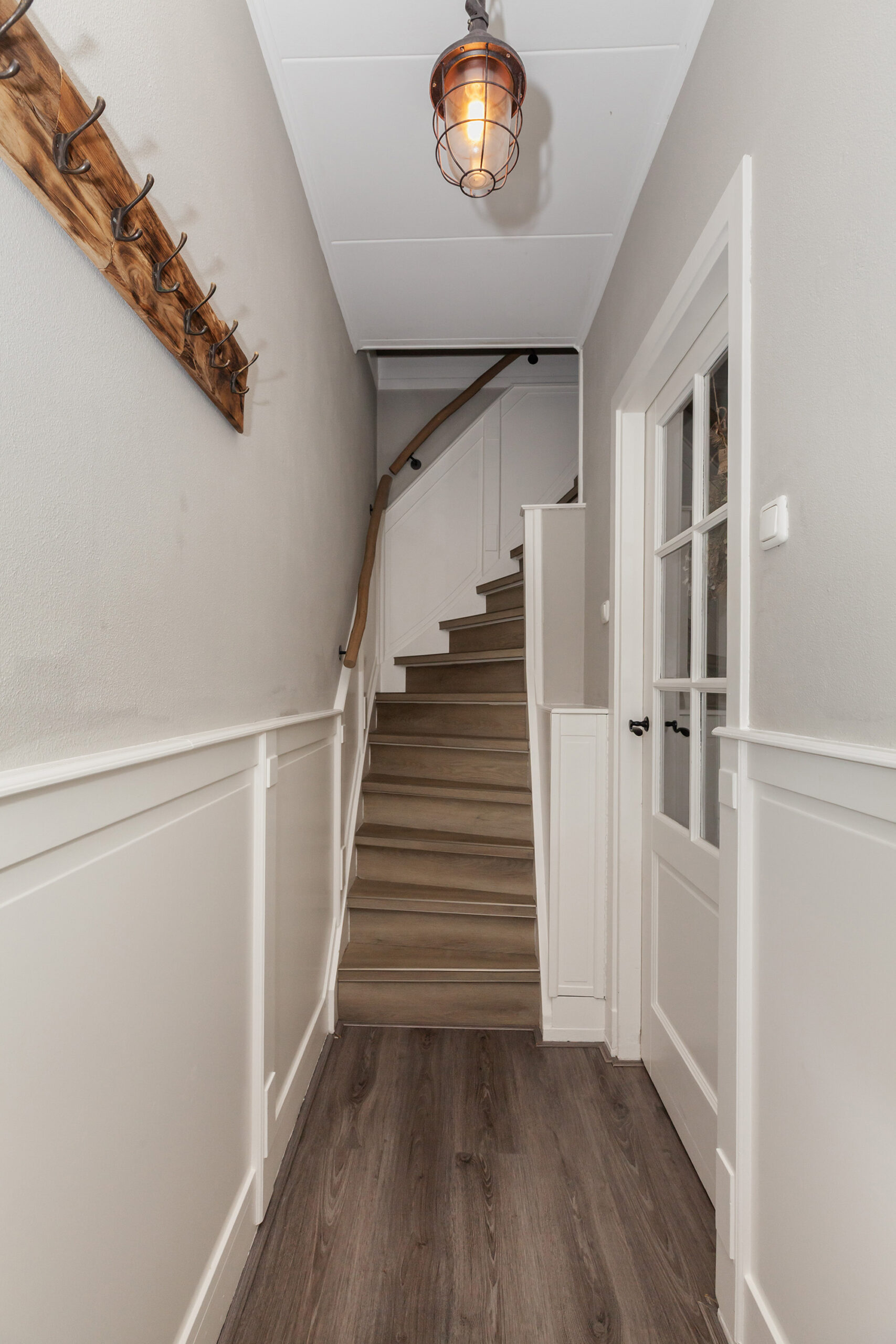 Voor de woning ligt een nette voortuin en met de voordeur stappen we binnen.