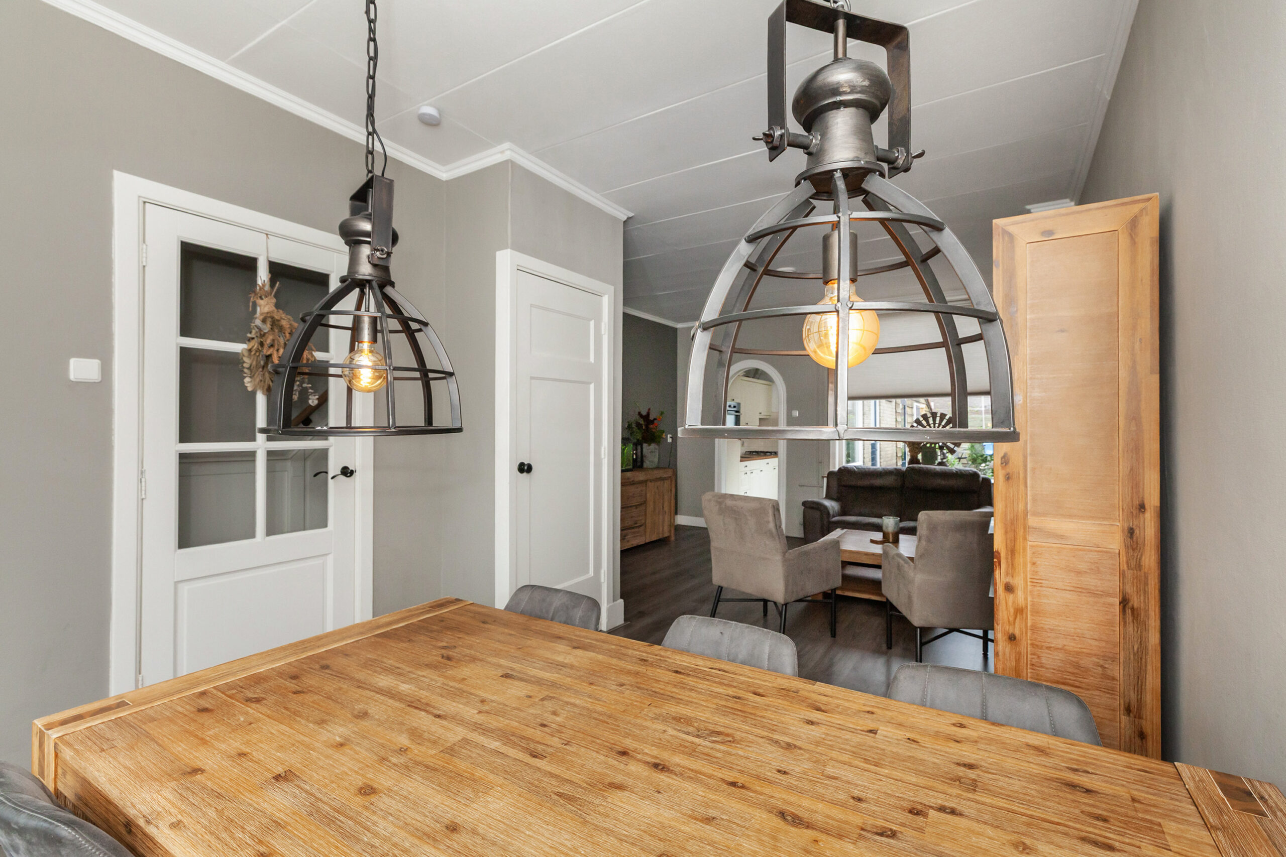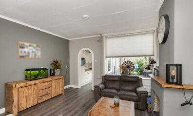 Wat een gezellige, knusse woonkamer stap je binnen vanuit de hal! Door de L-vormige indeling is deze goed in te richten met een zit- en eethoek. Er zijn een tweetal inbouwkasten waar allerlei spullen opgeborgen kan worden. Momenteel is de zithoek bij de gashaard gegroepeerd, echter deze haard wordt niet gebruikt, maar dit is wel weer mogelijk. Door de halfronde toog kom je in de keuken.