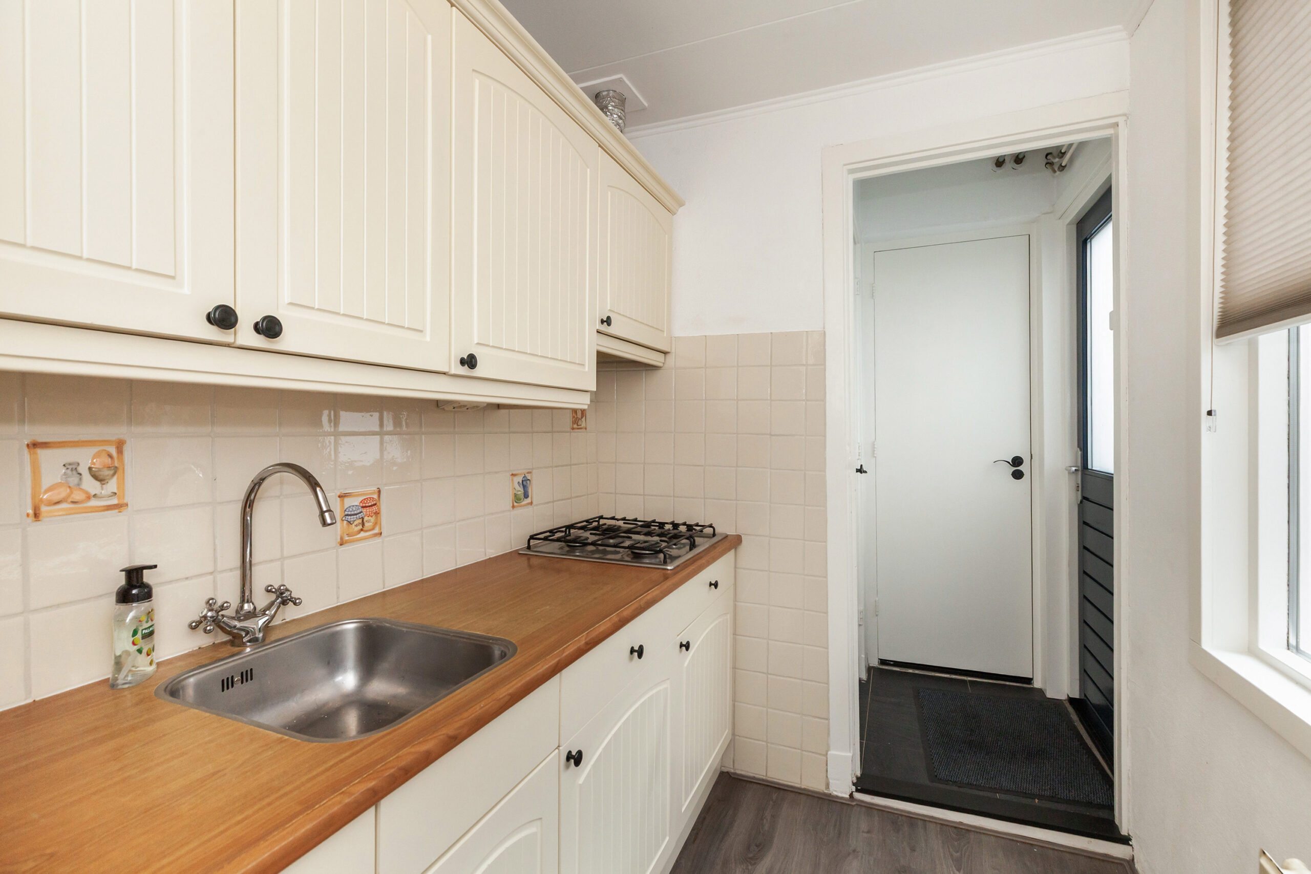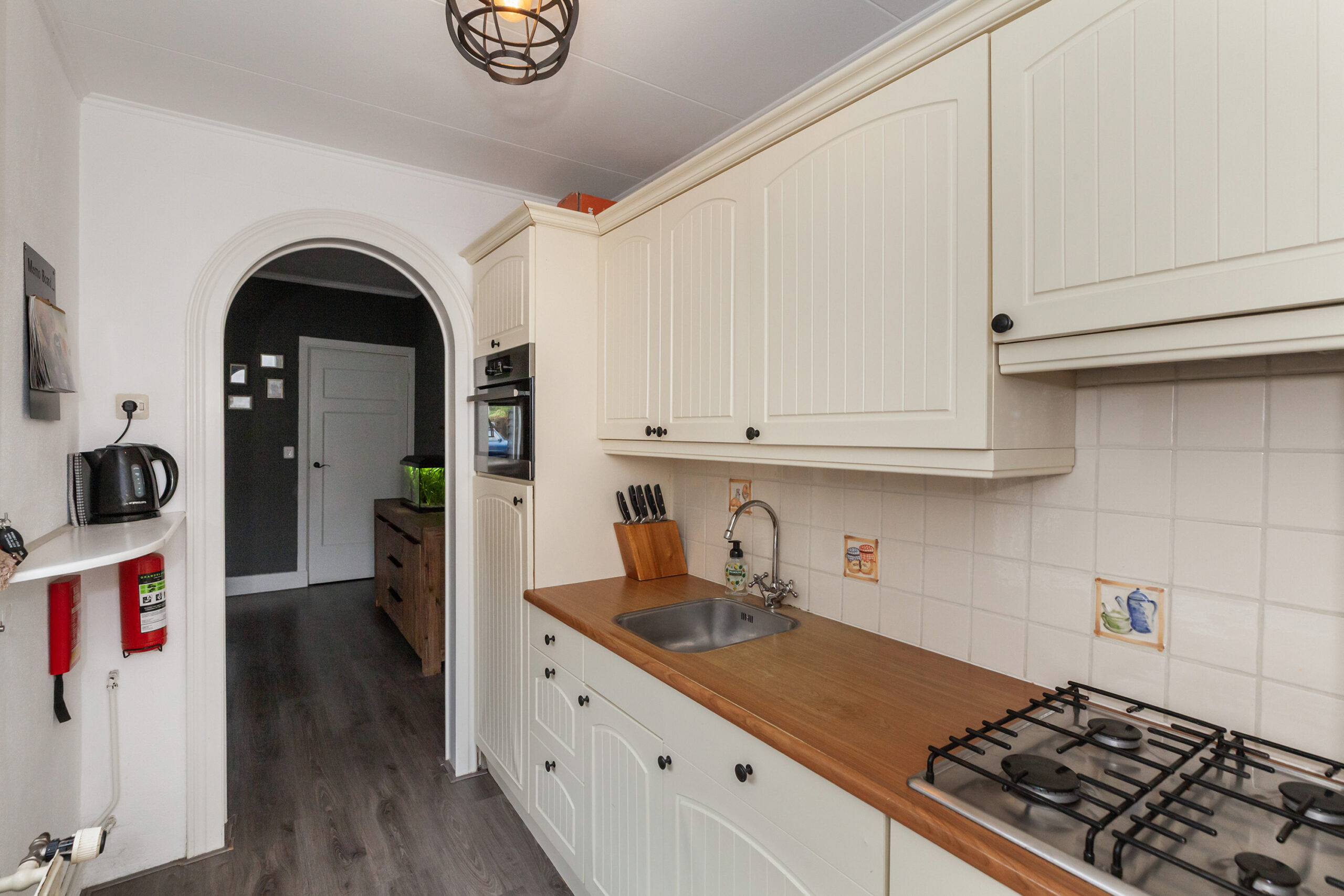 Via de halfronde toog vanuit de woonkamer kom je in deze nette keuken. Deze is opgesteld met een rechte opstelling in lichte kleuren. Aan inbouwapparatuur is er beschikking over 4-pits gaskookplaat, afzuigkap, combi-oven, koelkast en vaatwasser. Vanuit de keuken is er toegang tot het tussenportaal waar de sanitaire ruimtes zich bevinden en de achterdeur naar de tuin.