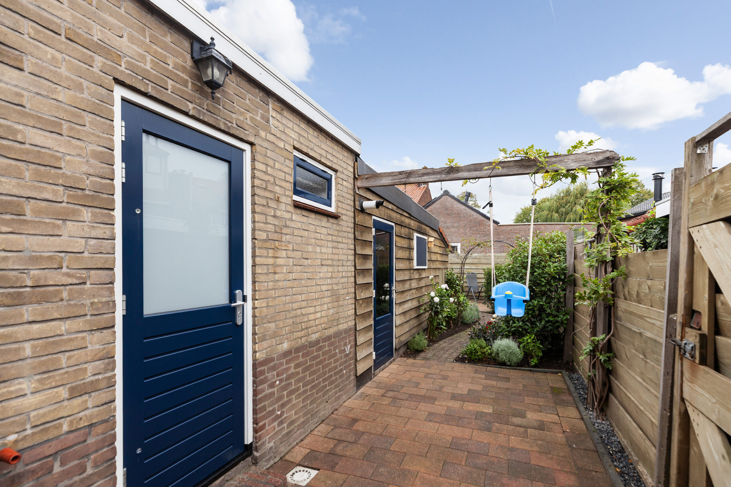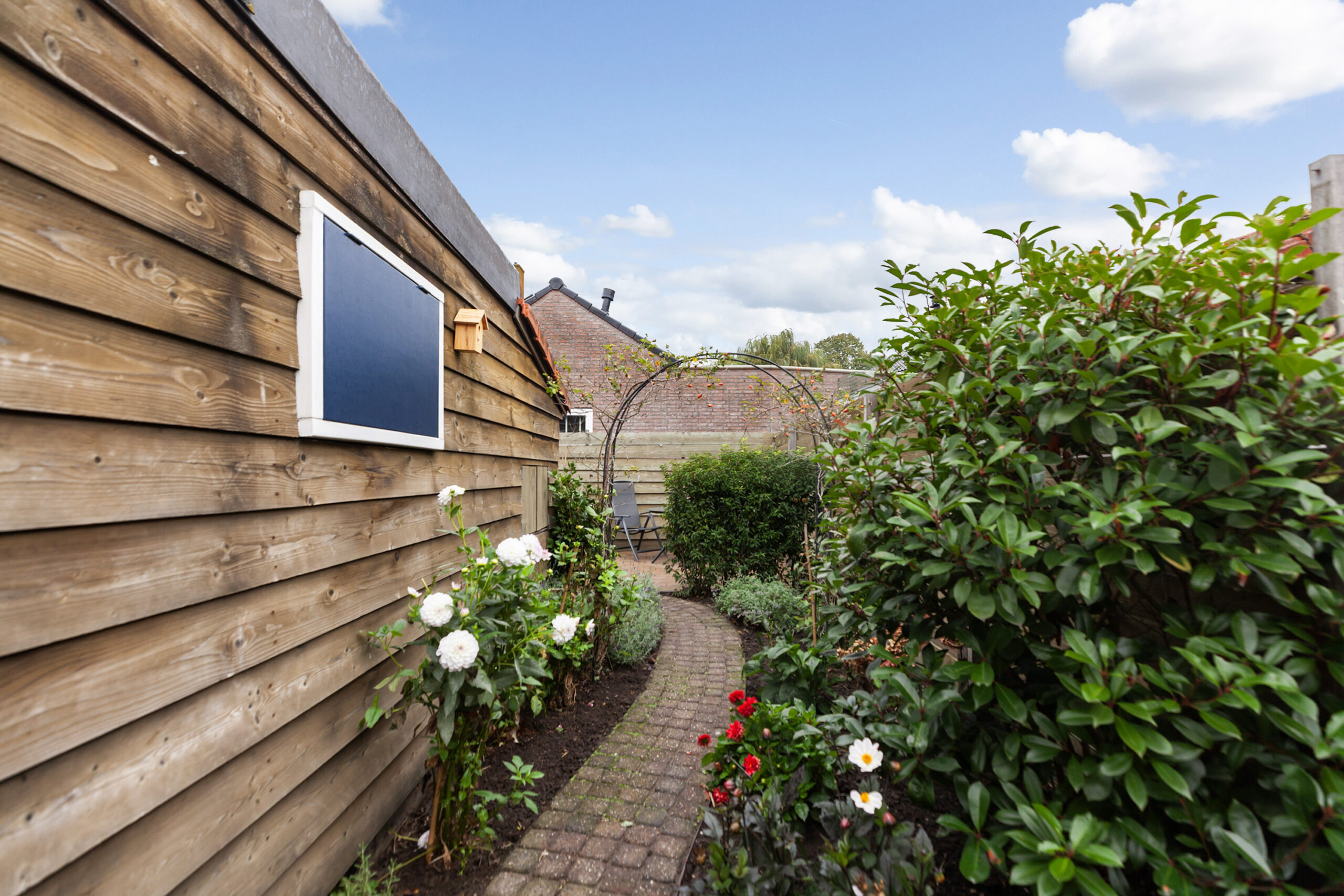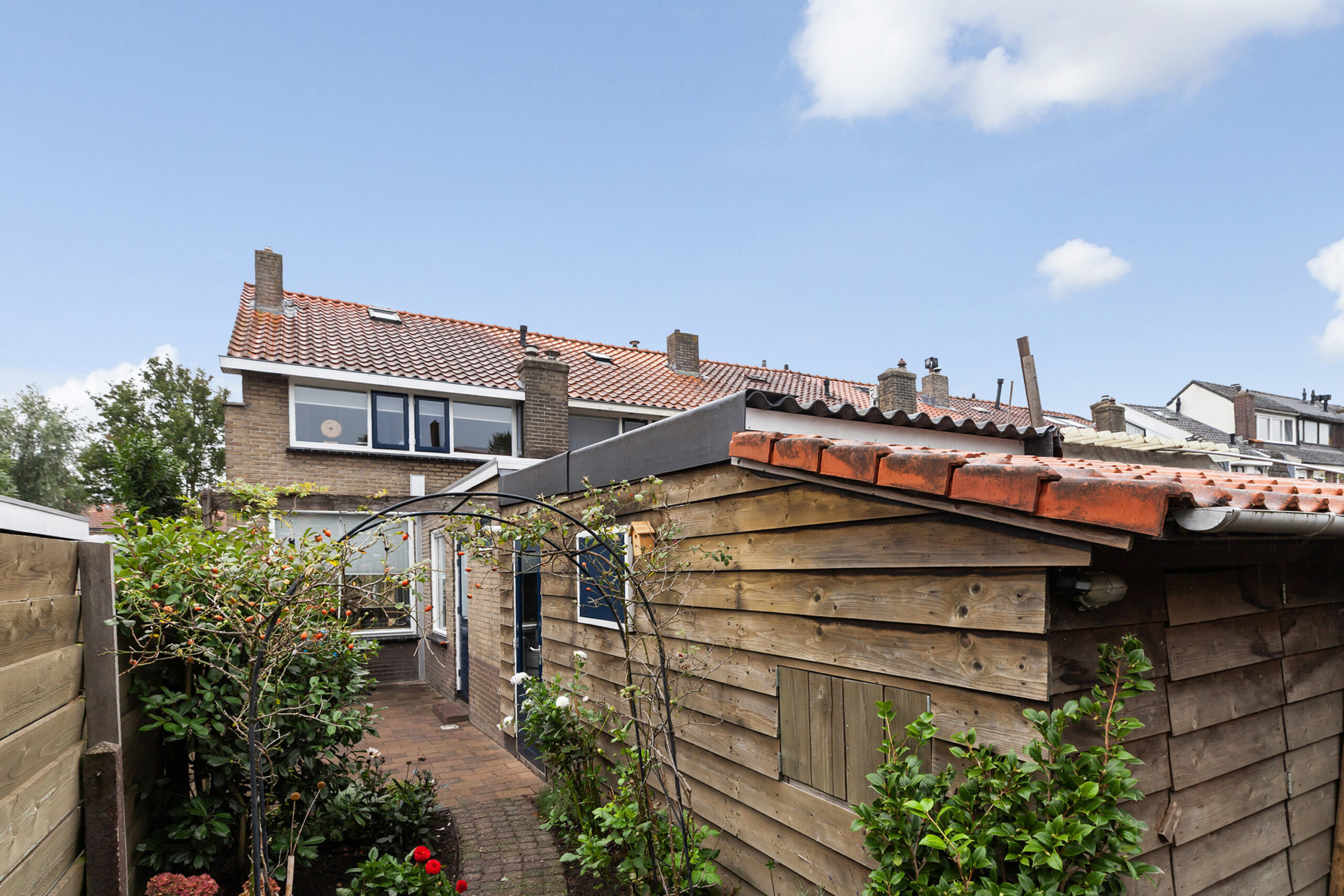 De tuin is netjes aangelegd met diverse beplantingen, bloemen en struiken. Er zijn verschillende zithoekjes. Via de poort aan de zijzijde kun je achterom komen. De woning ligt op loopafstand van het centrum. Scholen, winkels, supermarkten, openbaar vervoer en overige voorzieningen zijn in de nabije omgeving.