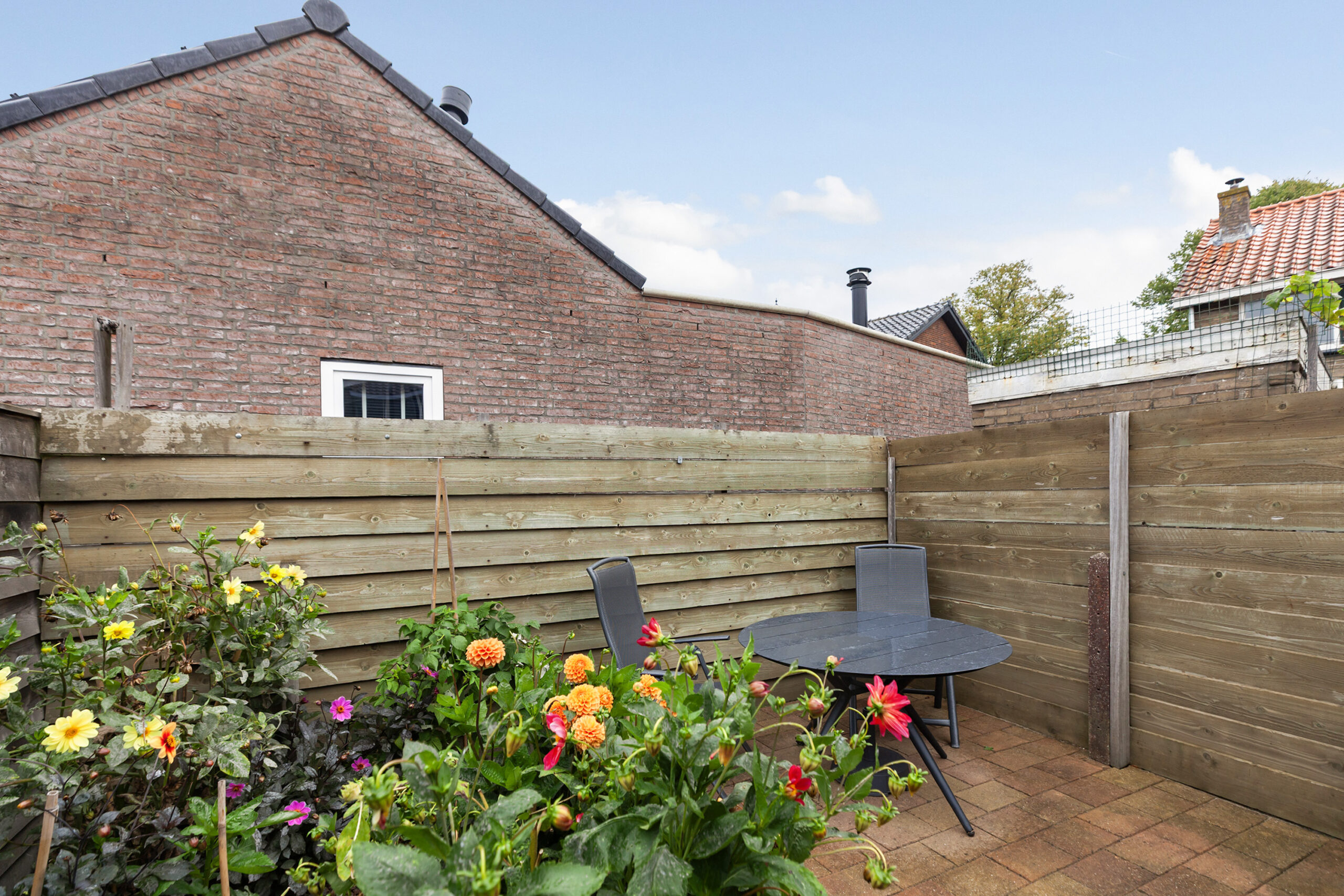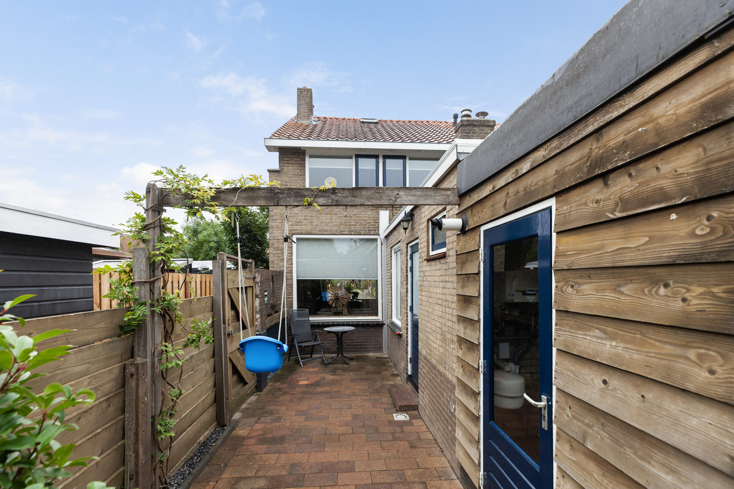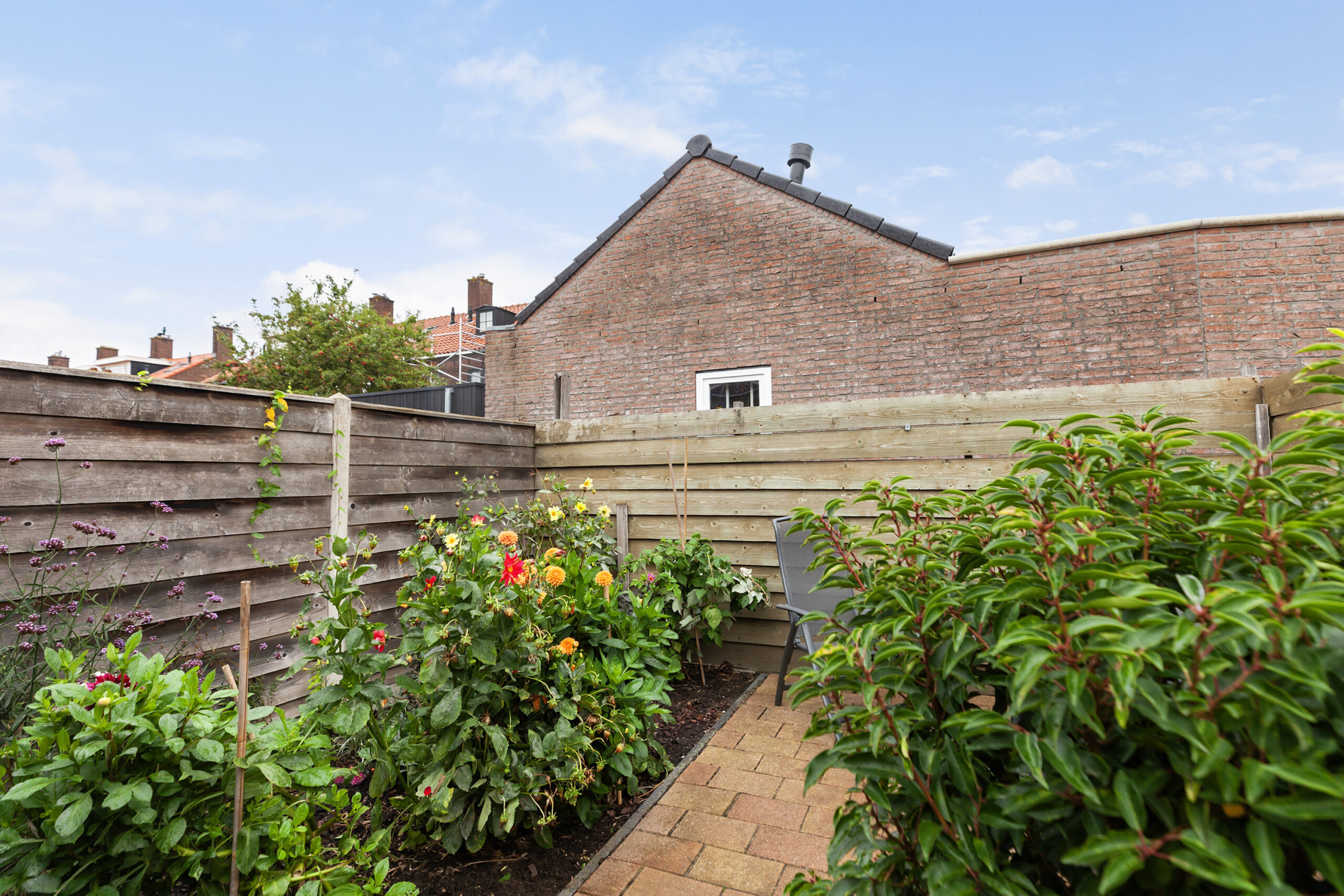De tuin is netjes aangelegd met diverse beplantingen, bloemen en struiken. Er zijn verschillende zithoekjes. Via de poort aan de zijzijde kun je achterom komen. De woning ligt op loopafstand van het centrum. Scholen, winkels, supermarkten, openbaar vervoer en overige voorzieningen zijn in de nabije omgeving.