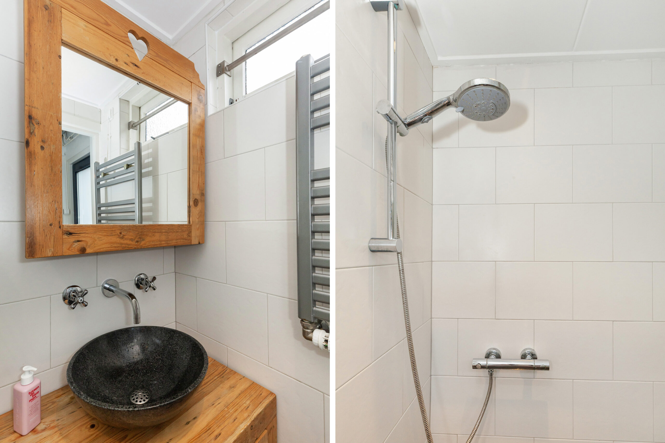 Aan de achterzijde is de badkamer gesitueerd. Deze is voorzien van een inloopdouche en wastafelmeubel met waskom.