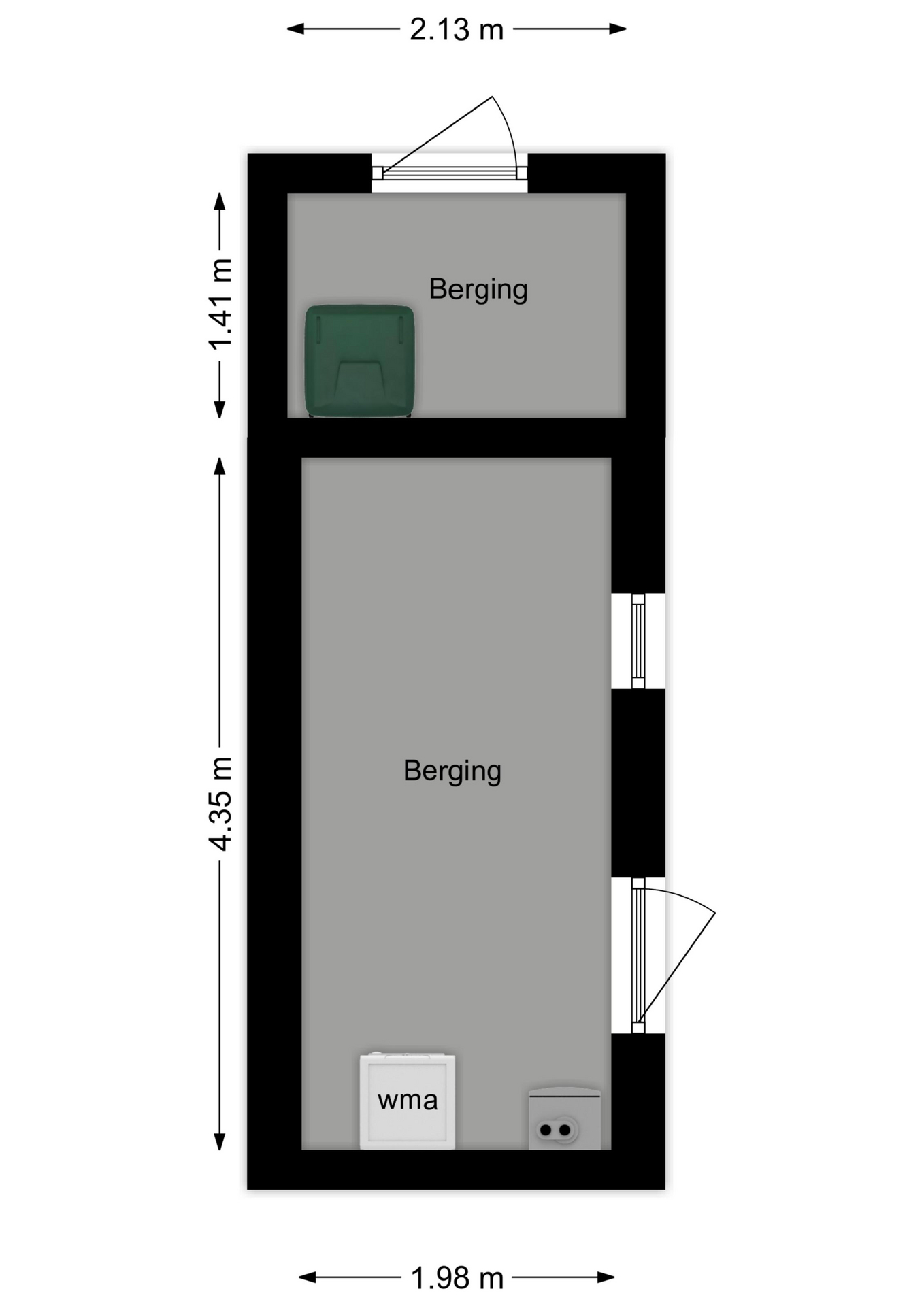 De woning is gelegen op een perceel van 168 m². Direct achter de woning is er de aangebouwde berging van circa 4.35 x 1.98m. Hier zijn ook de aansluitingen voor de wasmachine en droger, maar ook de opstelling van de C.V.-ketel. Achter deze berging is er nog een zogeheten containerberging van circa 2.13 x 1.41m. Zoals de naam zegt; ideaal voor het opbergen van de containers!