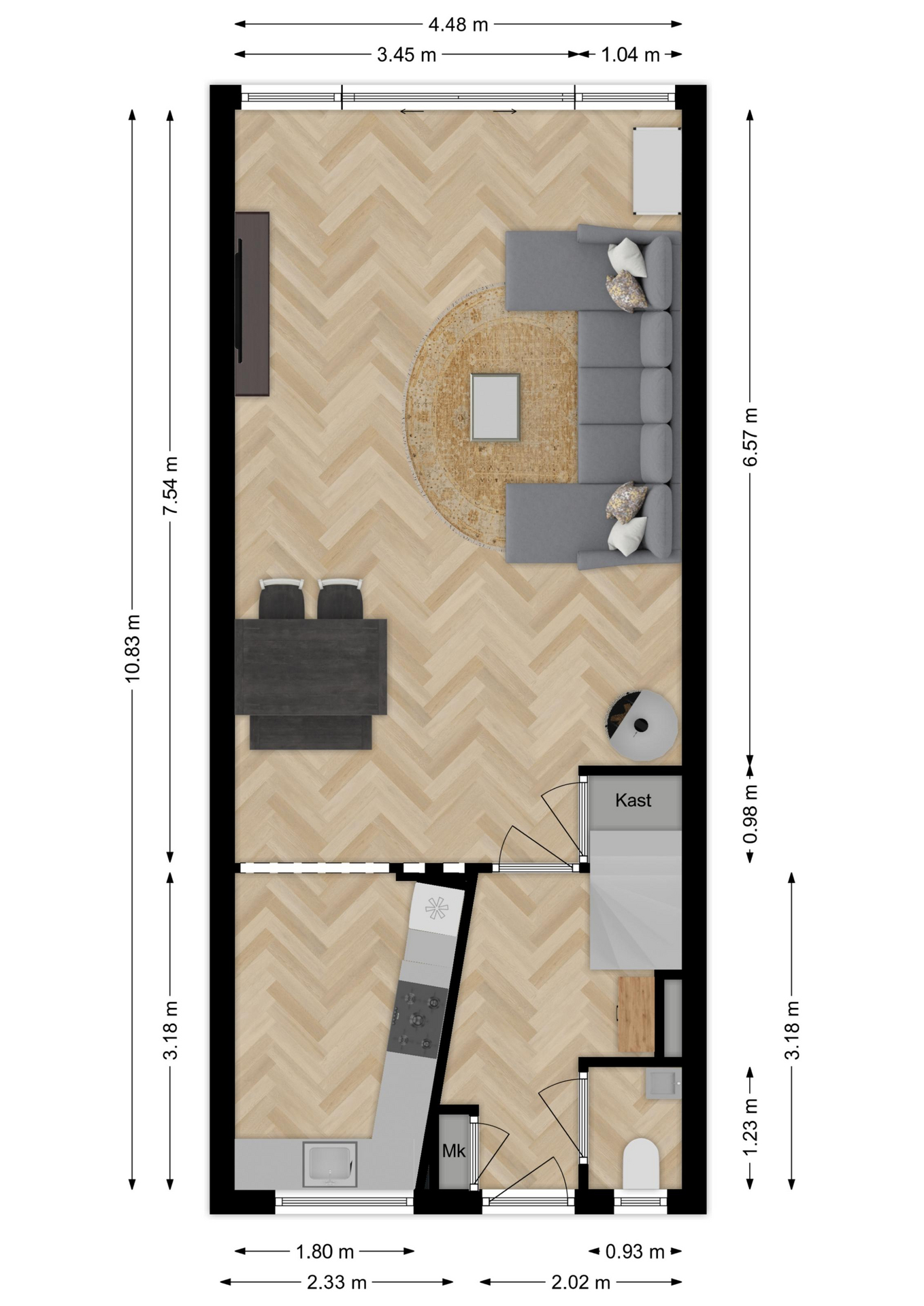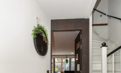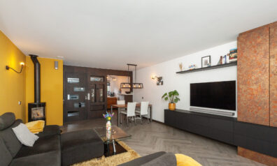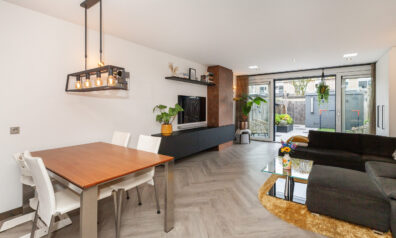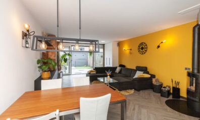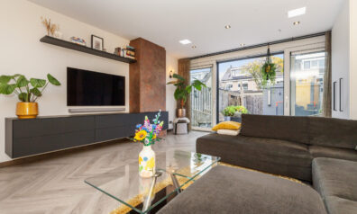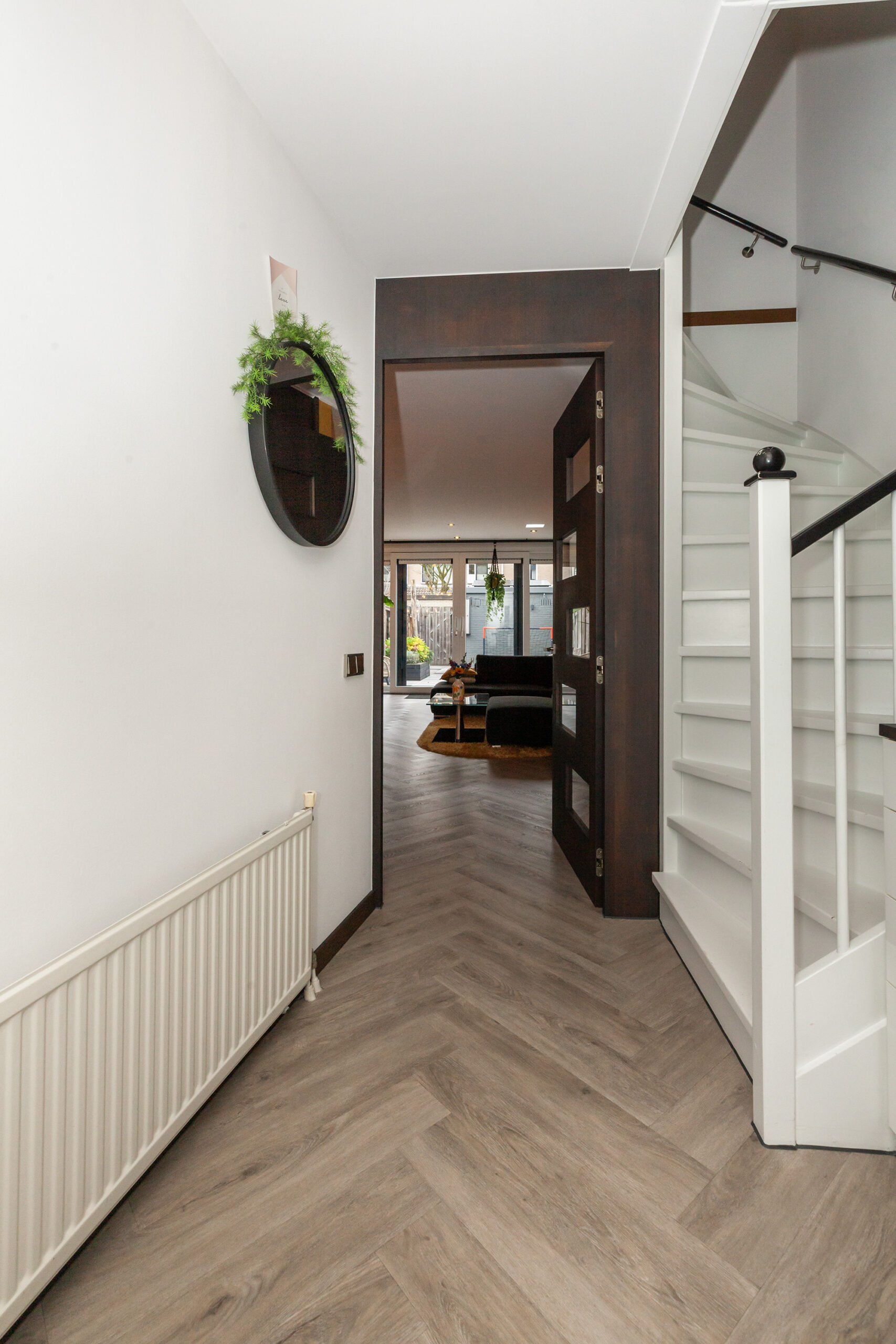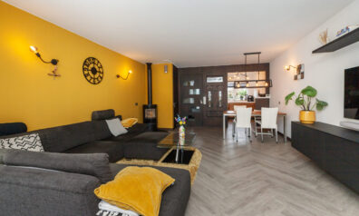 Welkom! In de hal heeft u zoals gebruikelijk de meterkast, toiletruimte en de trap naar de verdieping. De hal mondt uit in de woonkamer. De vloer is afgewerkt met een warme PVC in visgraat gelegd, geheel strak in stijl! Overigens is de gehele begane grond voorzien van vloerverwarming.