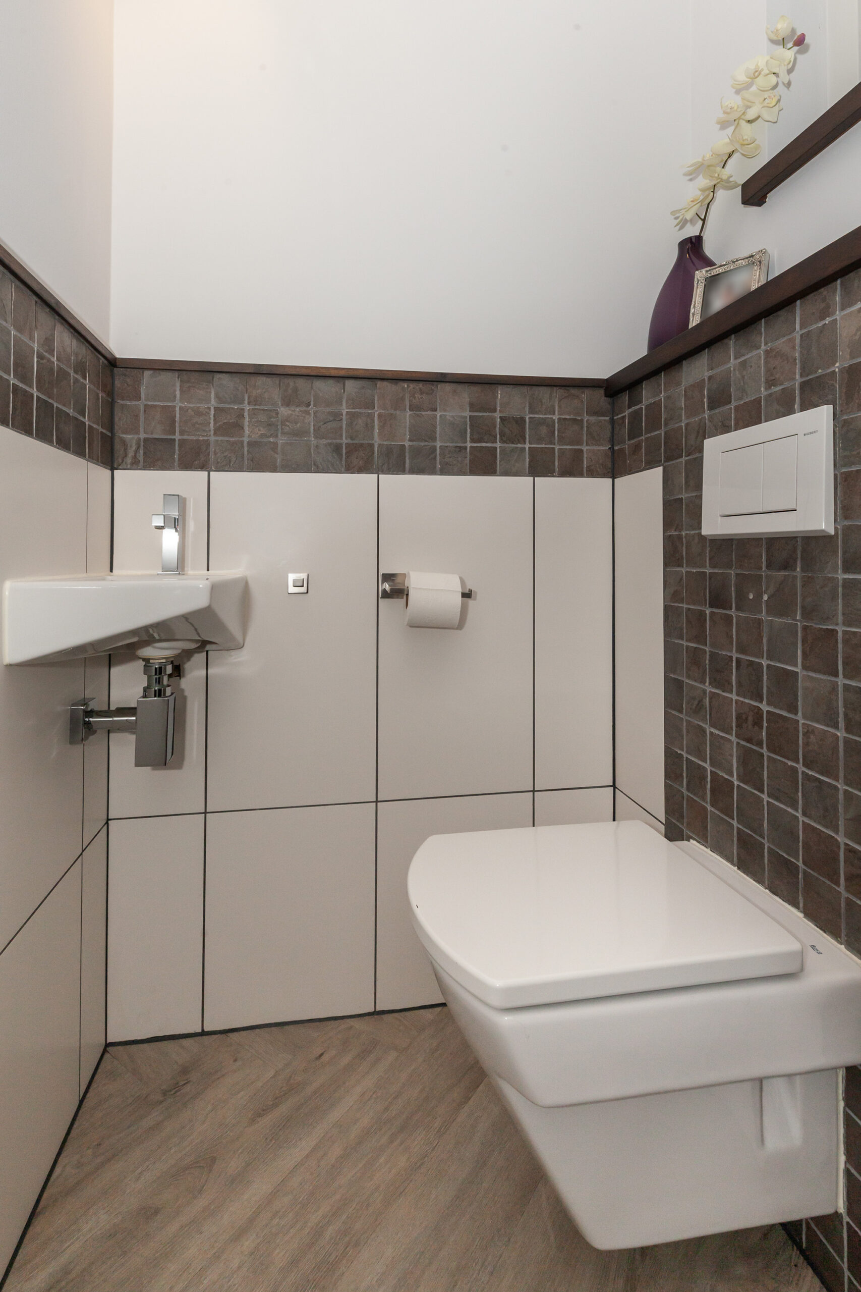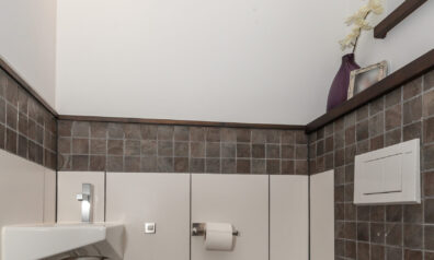 Nette toiletruimte voorzien van een vrijhangend closet en een handwasfonteintje.