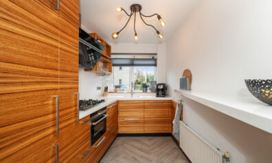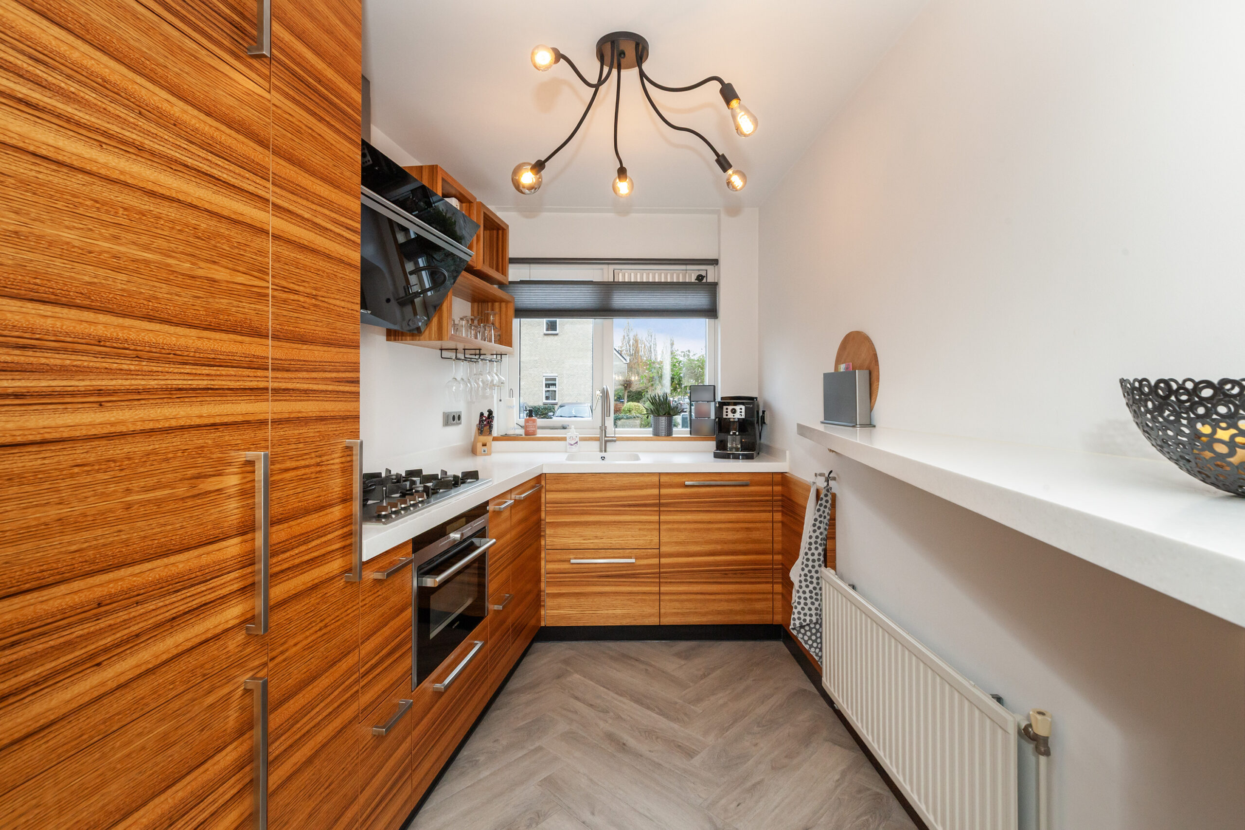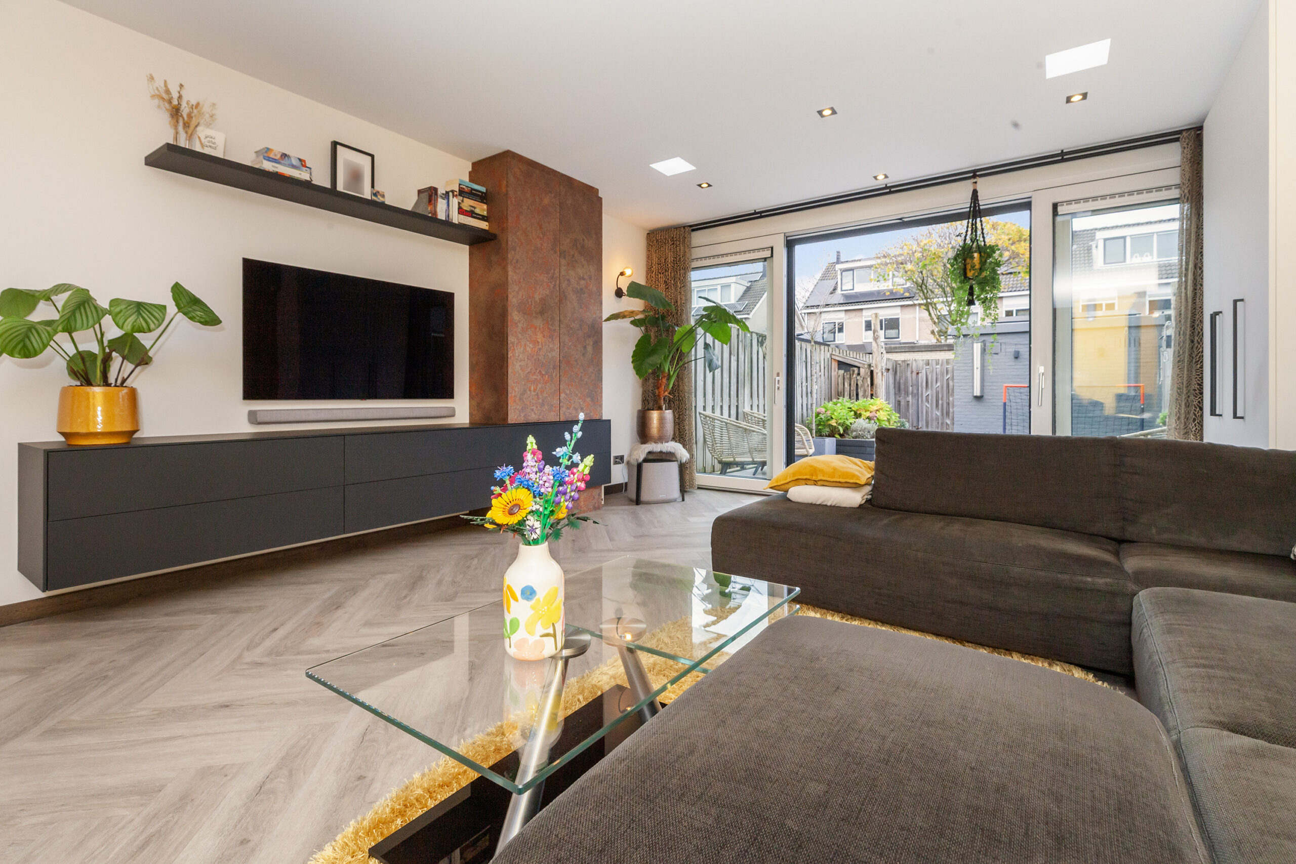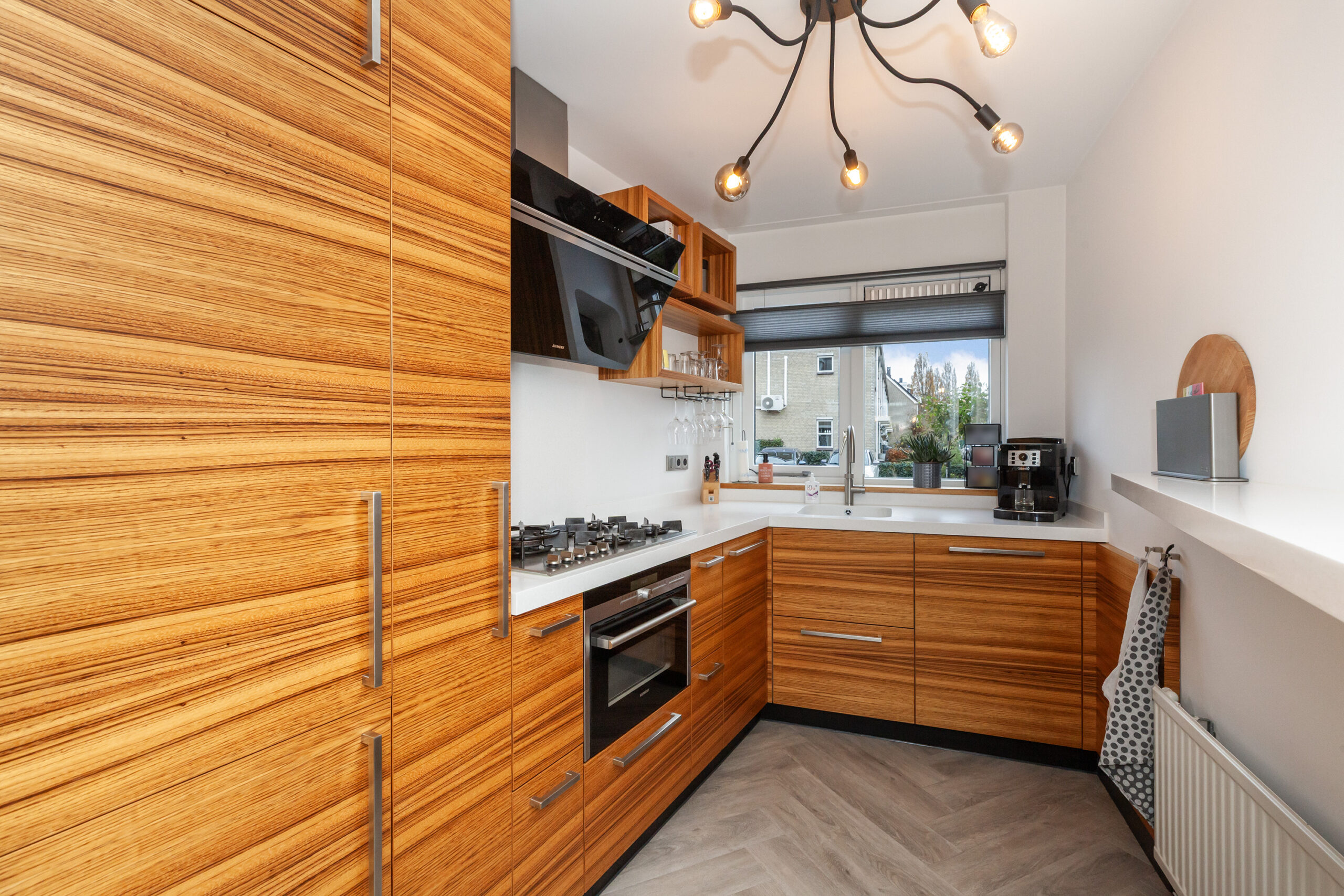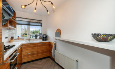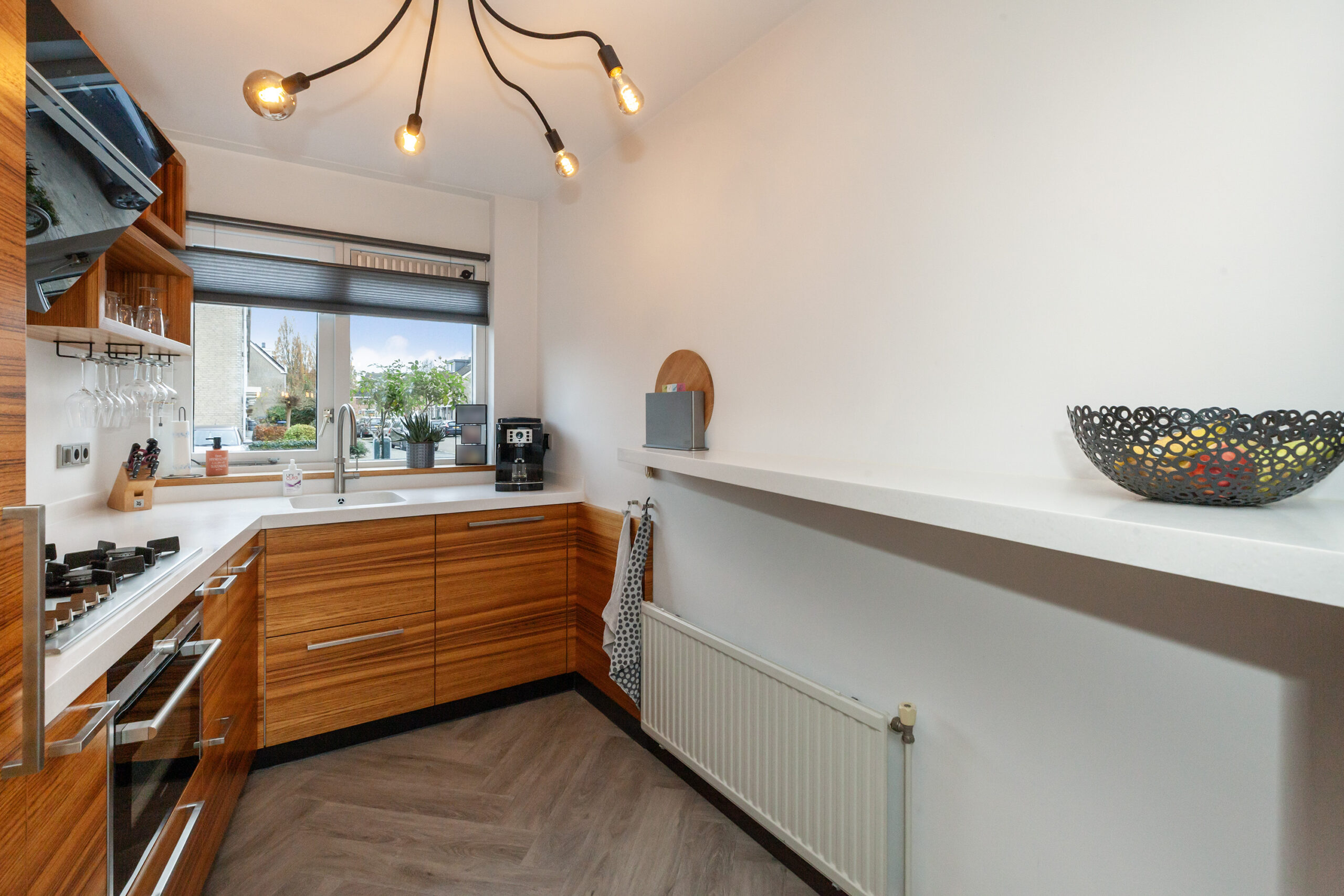 Aan de voorzijde is de keuken gesitueerd, wat het kokkerellen aangenaam maakt door het vrije zicht over de voorgelegen straat. De hoekopstelling is praktisch ingedeeld met een 5-pits gaskookplaat, afzuigkap, combimagnetron, koel-/vriescombinatie en vaatwasser. Daarnaast heeft u de beschikking over een Quooker, een detail waar u veel plezier van heeft!