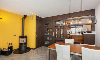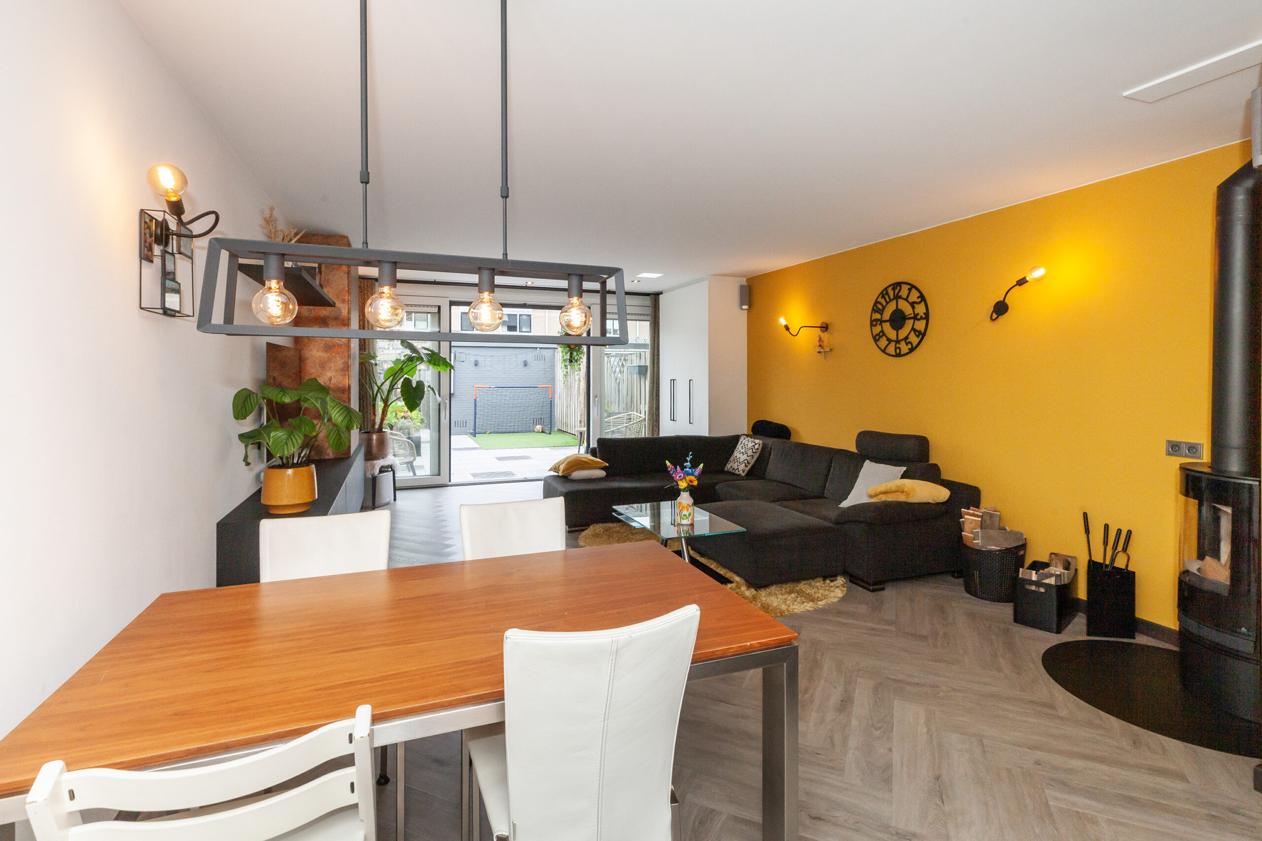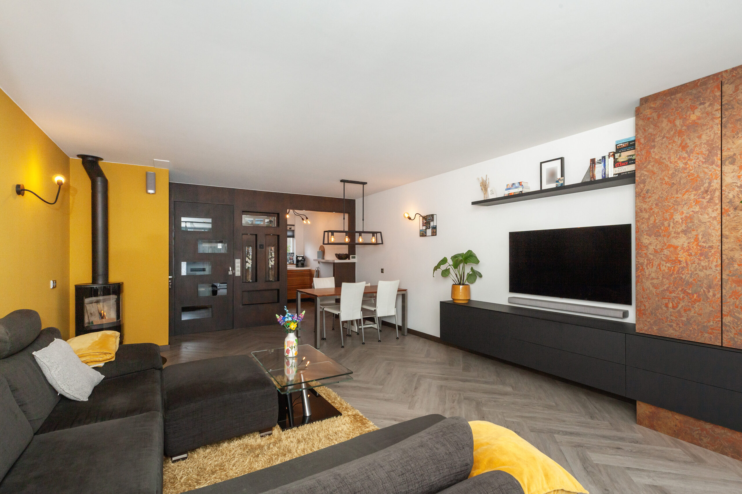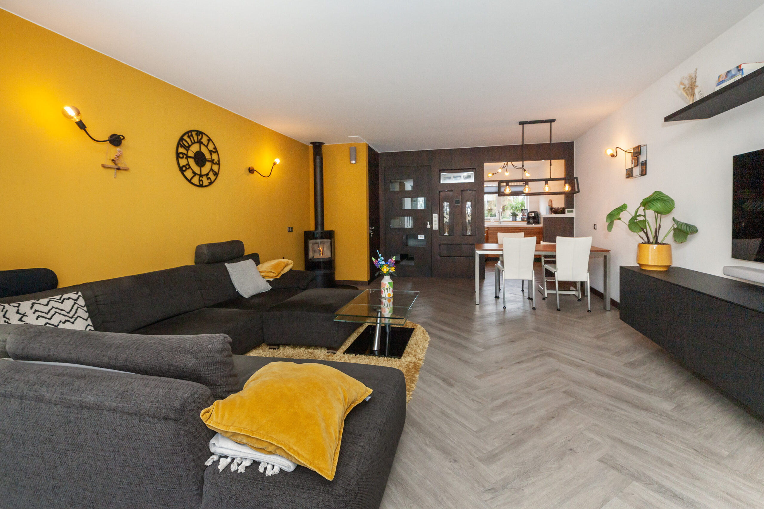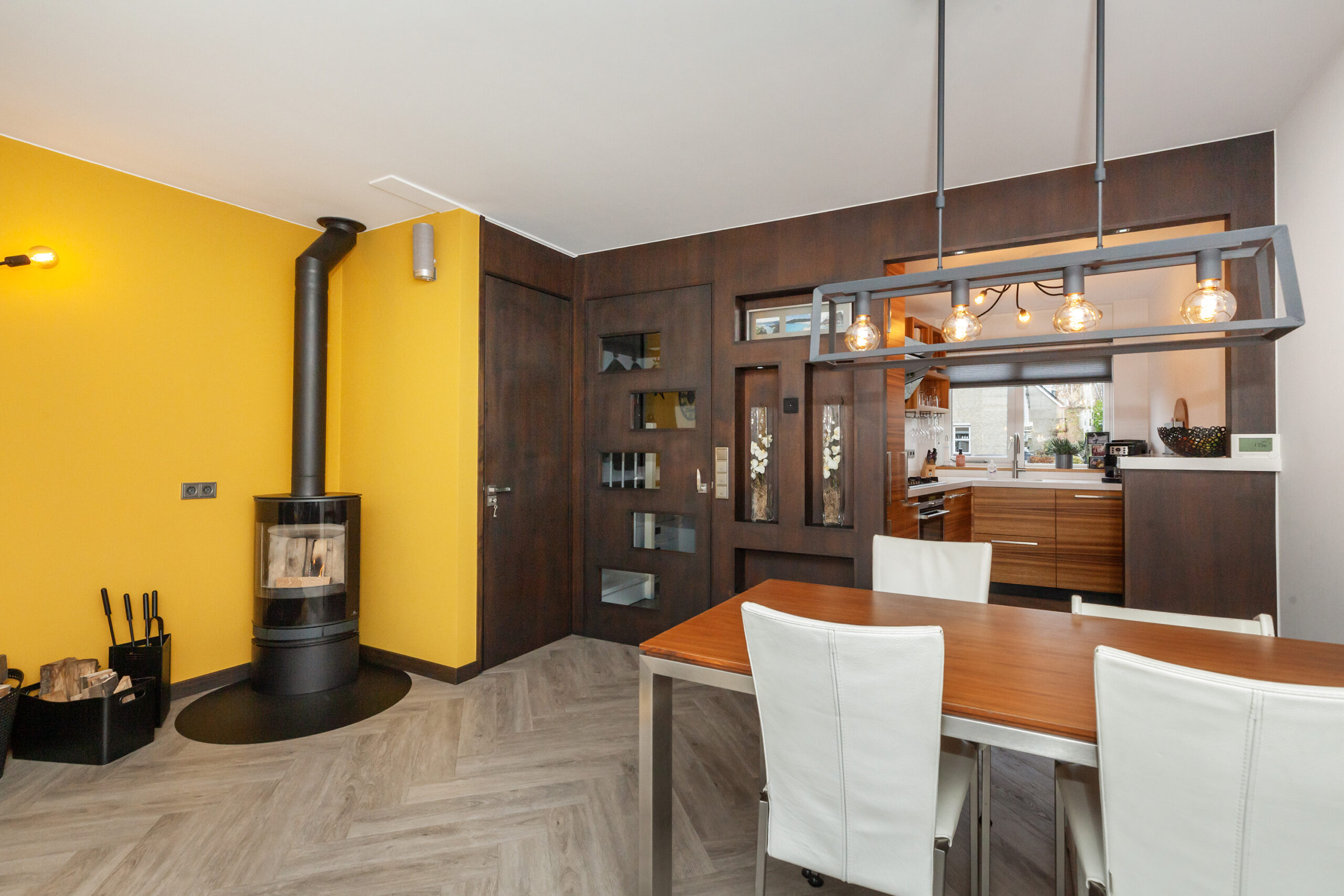 Nou en of dat u zich hier snel thuis gaat voelen in deze kamer. Wat een diepe woonkamer, mede door de grote uitbouw! Ook hier ziet u stijl met perfectie gecombineerd in de warme kleurstellingen. Schuif de pui open en u betrekt het binnenleven gemakkelijk met buiten. De daglichtlampen geven net het extra licht in de woonkamer, terwijl u knus bij de houtkachel plaatsneemt. Aan de voorzijde staat de keuken in halfopen verbinding. In de trapkast heeft u volop opbergruimte.