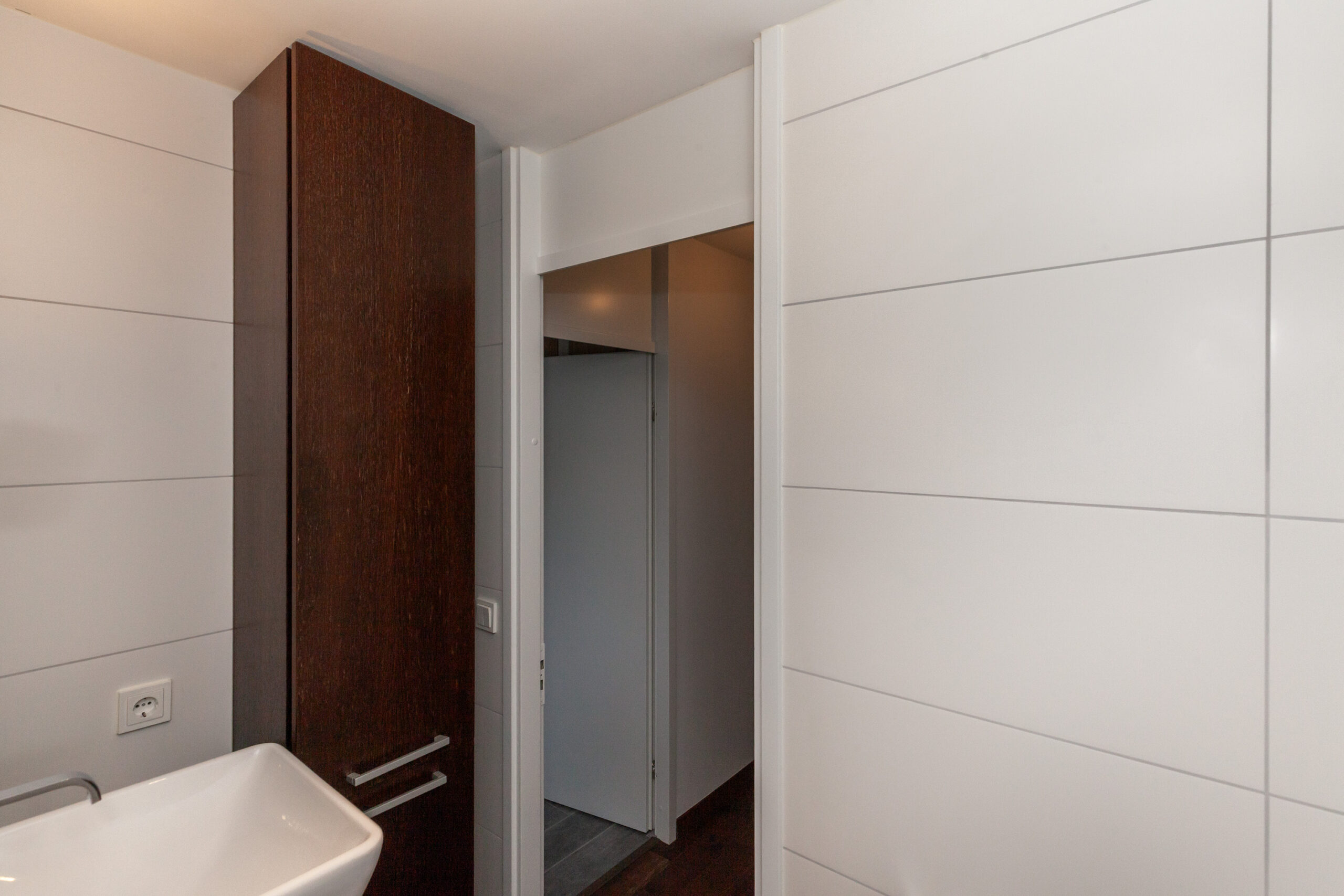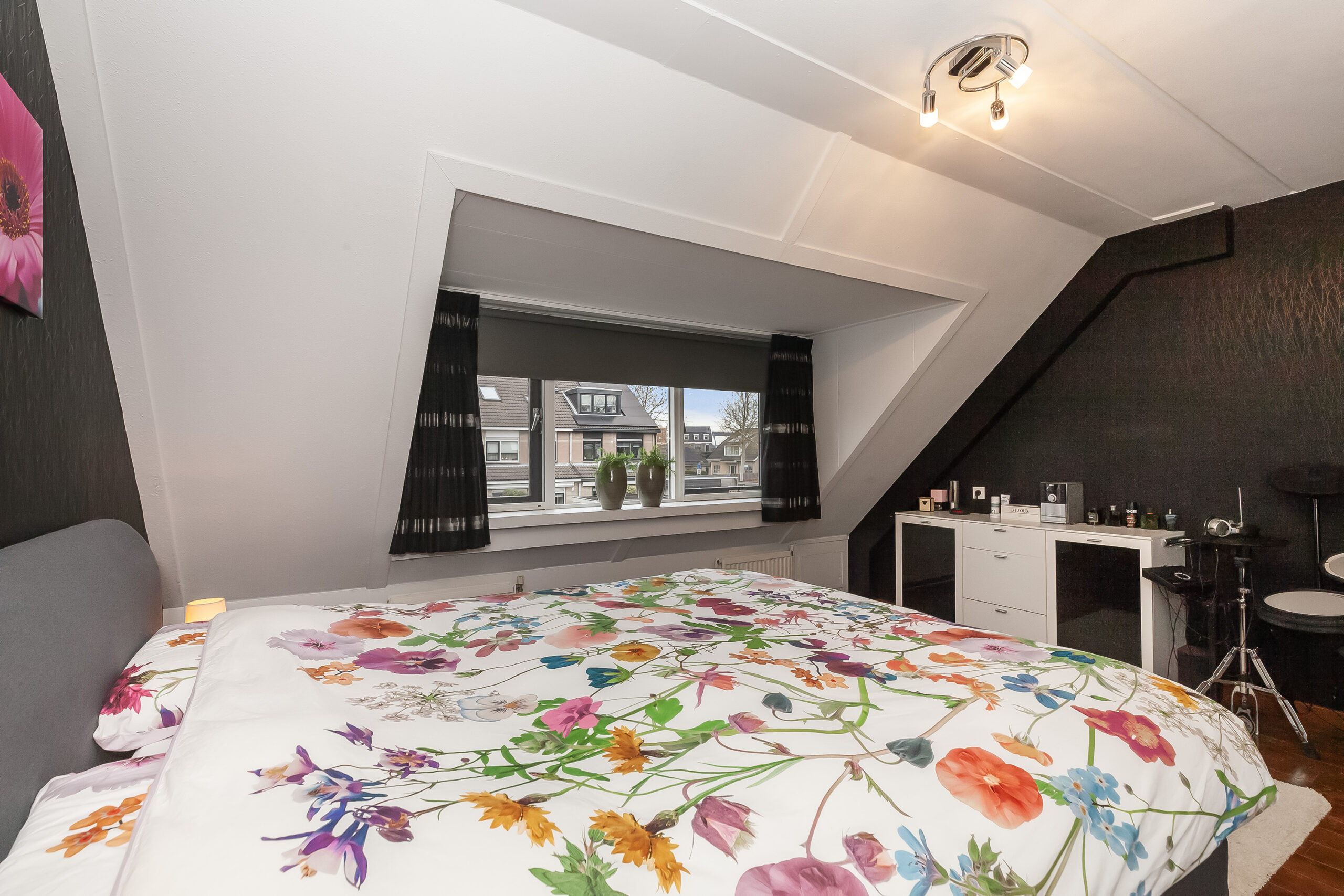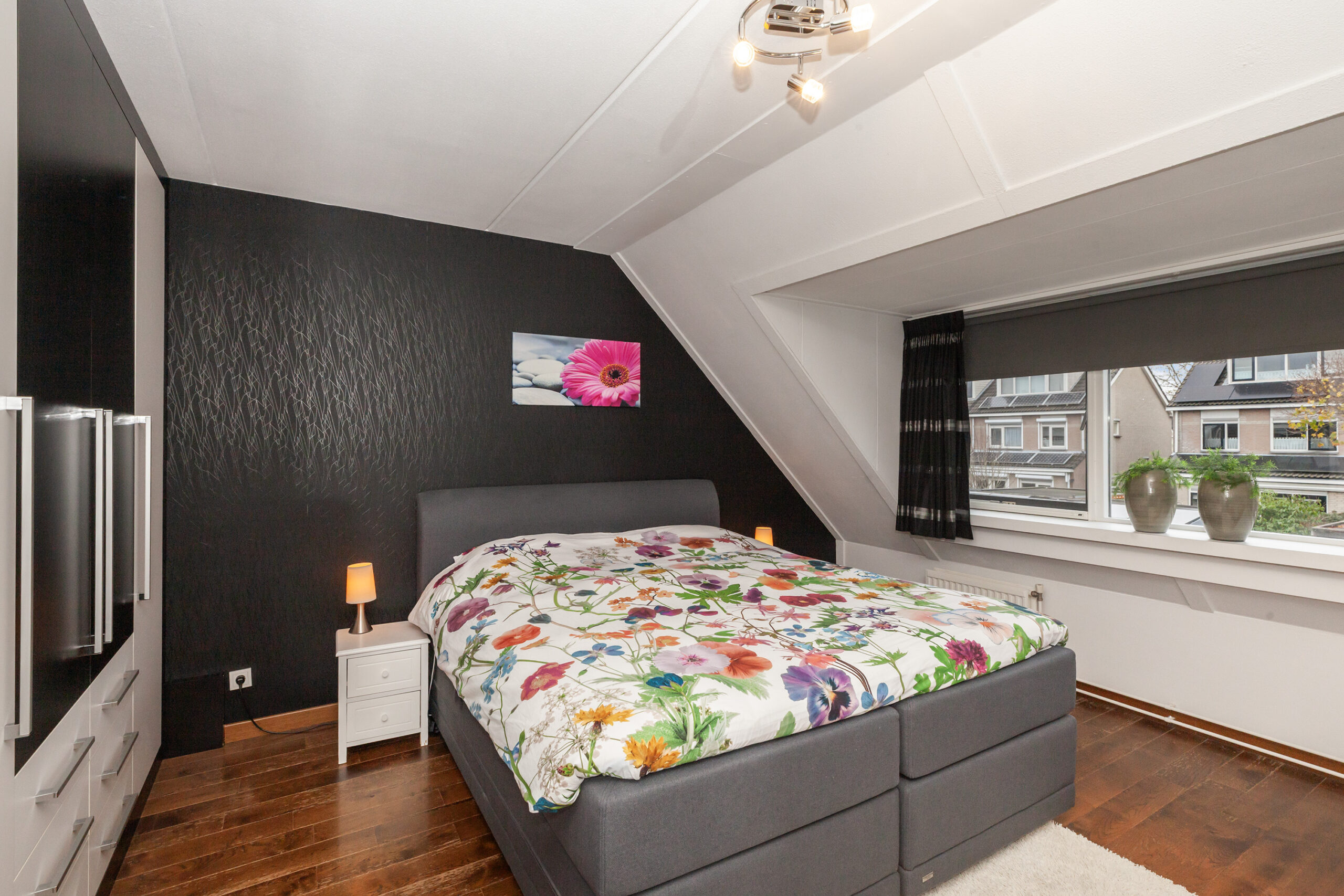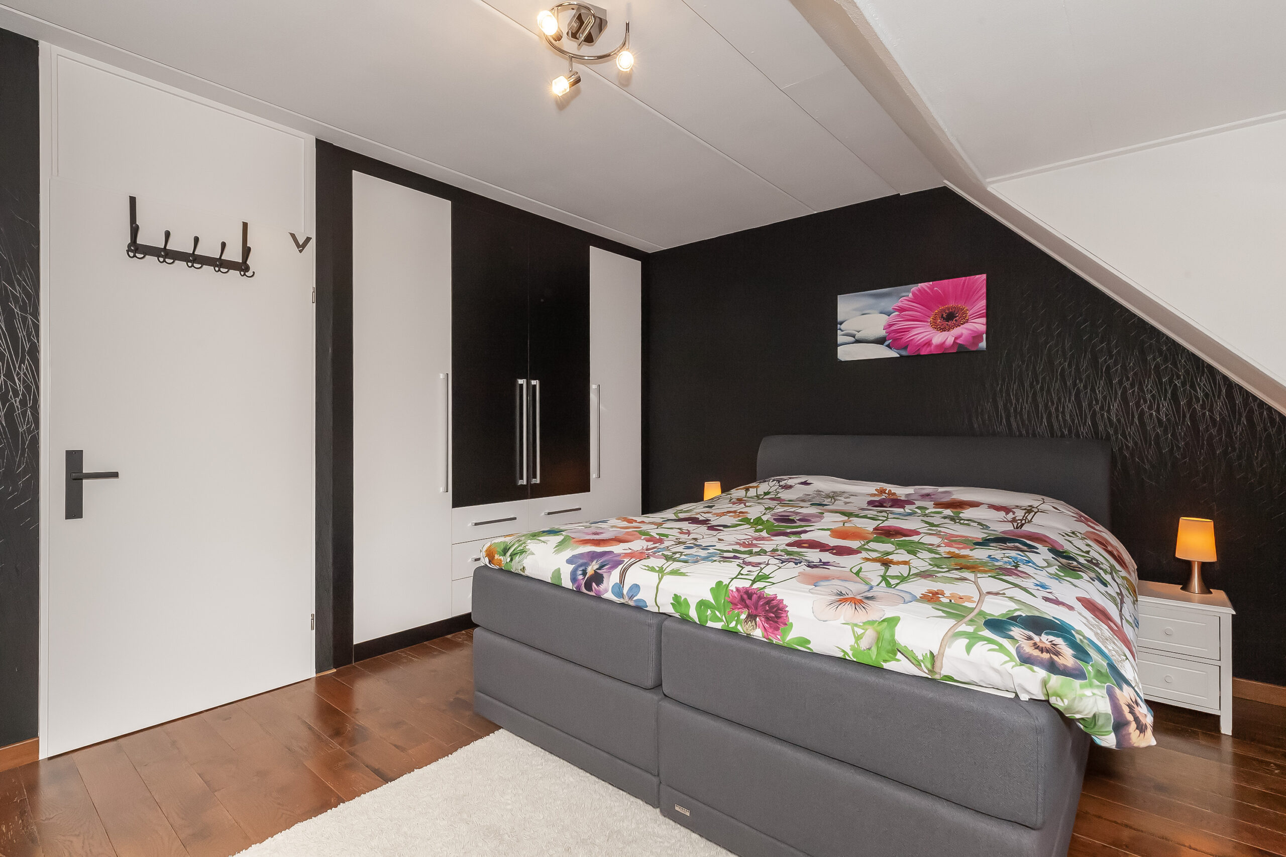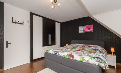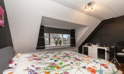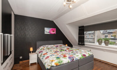 De (ouder) slaapkamer is aan de achterzijde gesitueerd en wat een heerlijke, grote kamer is dit! Door de dakkapel is er veel extra ruimte. Onder het schuine dak is er een kleine berging waar diverse leidingen lopen (circa 0.55m diep). Er is een praktische kastenwand waar u al uw kleding kunt opbergen.