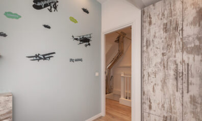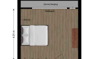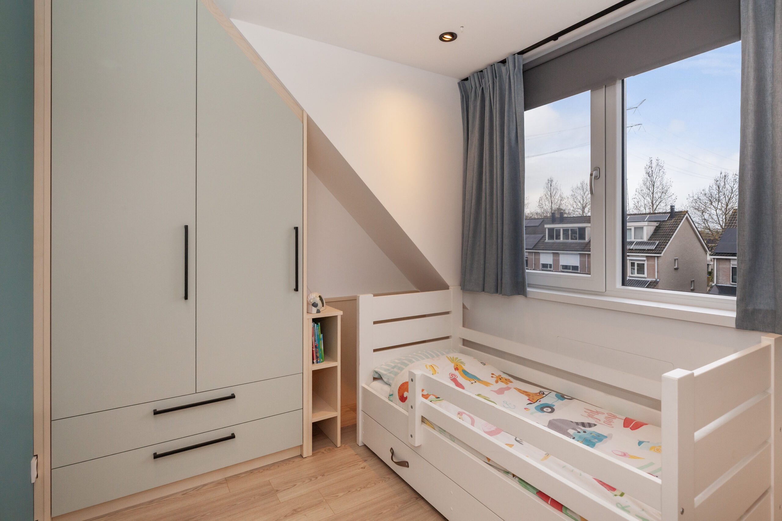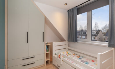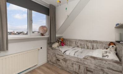Aan de achterzijde treft u deze vierde slaapkamer. Nog maar enkele weken geleden is hier een mooie kast, geheel op maat geplaatst! Dat is zo fijn aan deze woning, dat er in nagenoeg elk vertrek wel een vaste kast of berging te vinden is. Overigens is er ook een luik naar de berging onder het schuine dak (circa 0.66m diep).